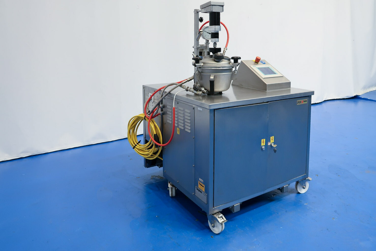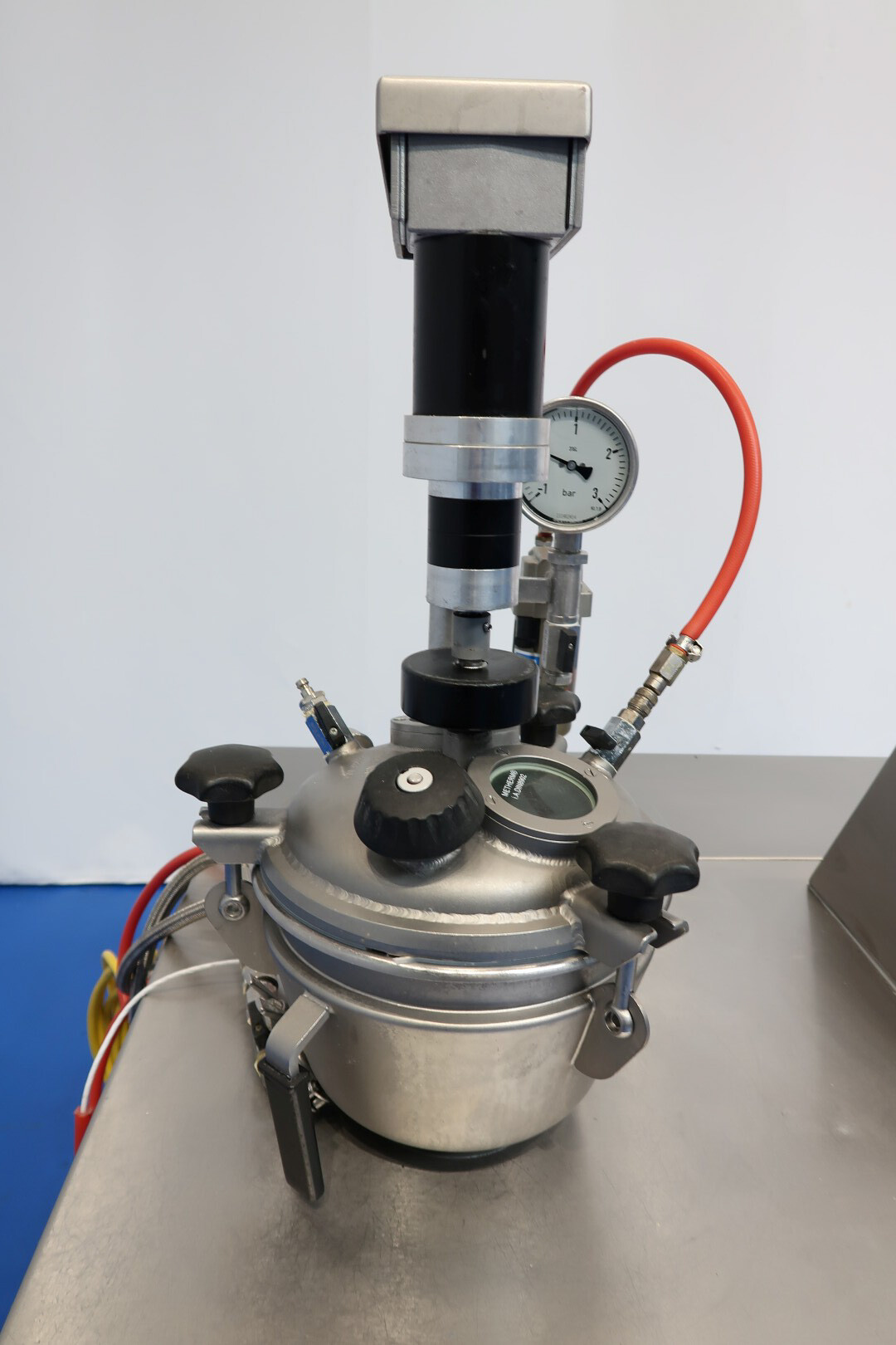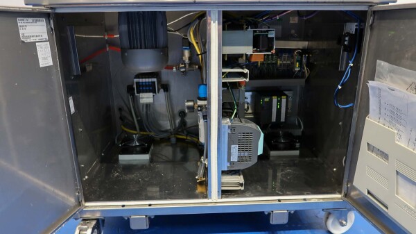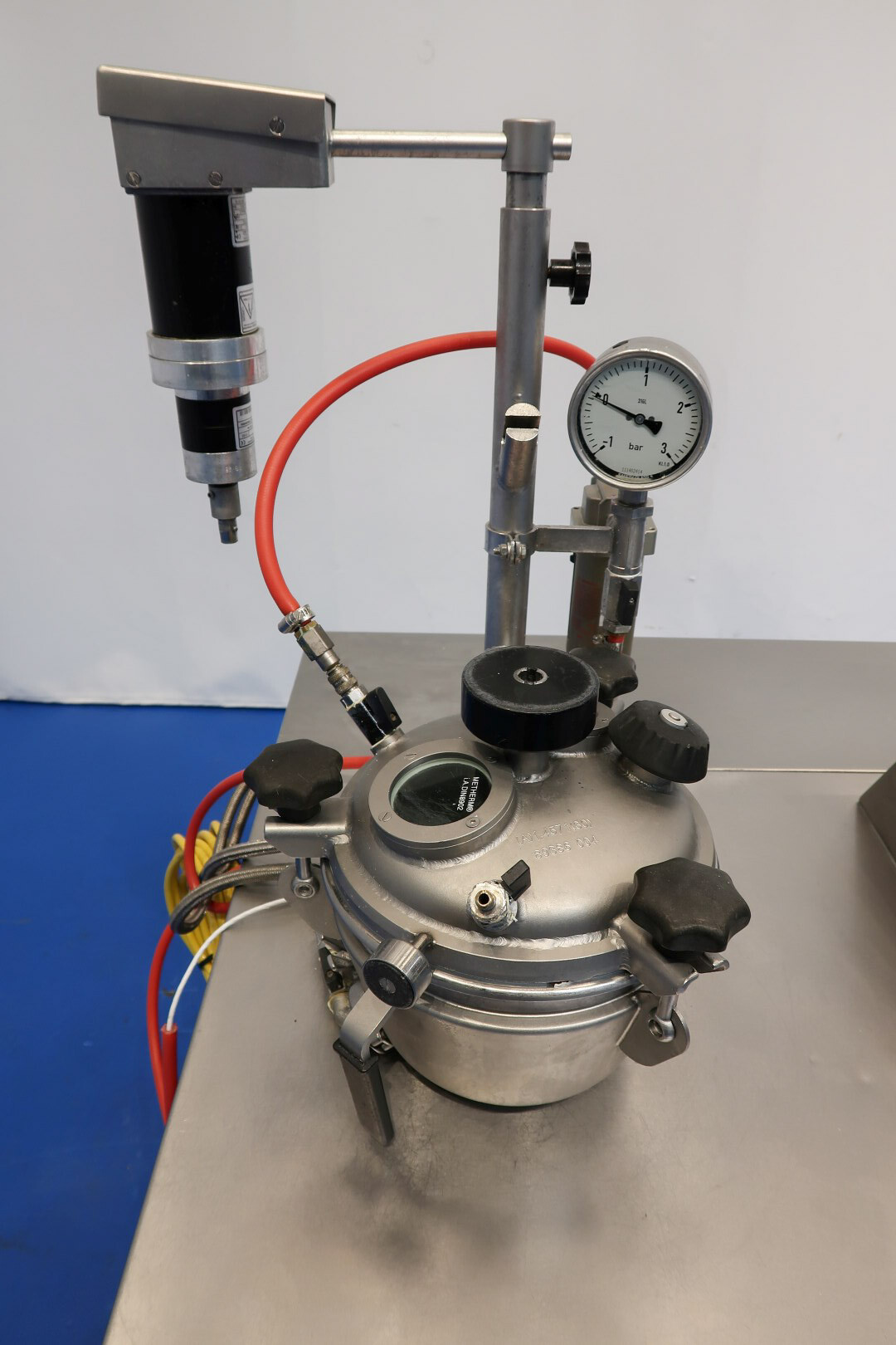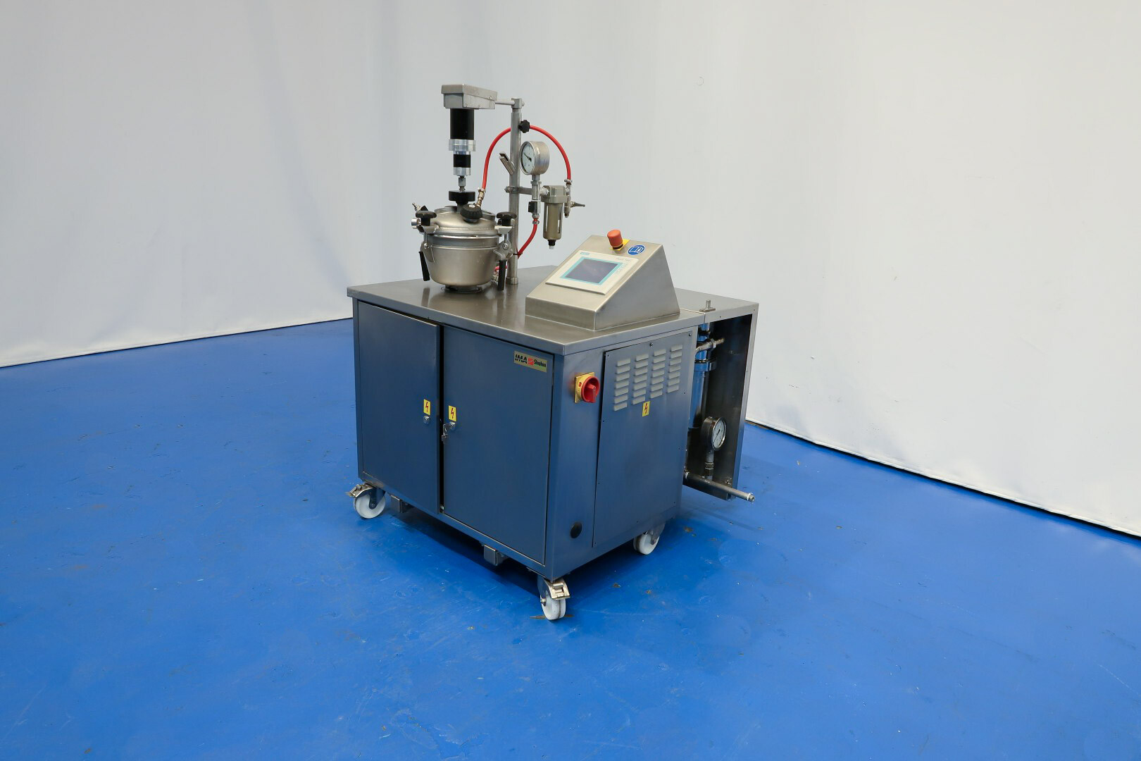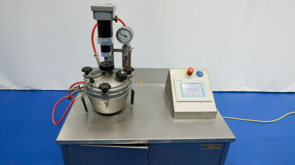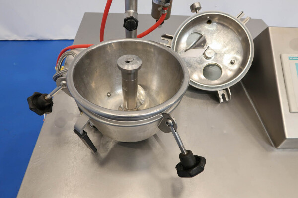 Laboratory-‘High Shear’maschine mit Vakuumsystem. Universelles Mischen, Kochen und Schneiden im Labormaßstab. Die Produktkammer ist doppelwandig und hat einen eingebauten Anschluss für die direkte Einspeisung von Dampf. Wässriges Dosiersystem mit Wasserzähler/Durchflusssender, Vakuumanschluss mit Trennbehälter und Entlüftungsventil. PT-100-Sensor in der Kammer. Der Deckel kann manuell abgenommen werden und hat 3 Klemmen zum manuellen Festziehen. Mit 2 Sichtscheiben im Deckel. 2 Rührwerke; 1 Rührwerk mit Schaber (3.000 – i. 45,56 - 66 U/min) und 1 Homogenisiermesser (0,74 A – 2,1 A - 1.400 U/min). Motortyp FK80L/40. Druck in der Kammer Vakuum -1,0 bis + 0,8 bar, Druck mantel 0,8 Bar. Max. Temperatur: 110 °C. Inklusive Flüssigkeitsring-Vakuumpumpe und Dampffilter. Mit einigen Ersatzteilen. Steuerung: Siemens Simatic S7-300 mit betrieblichem Touchscreen an der Maschine. Dokumentation in Niederländisch verfügbar.