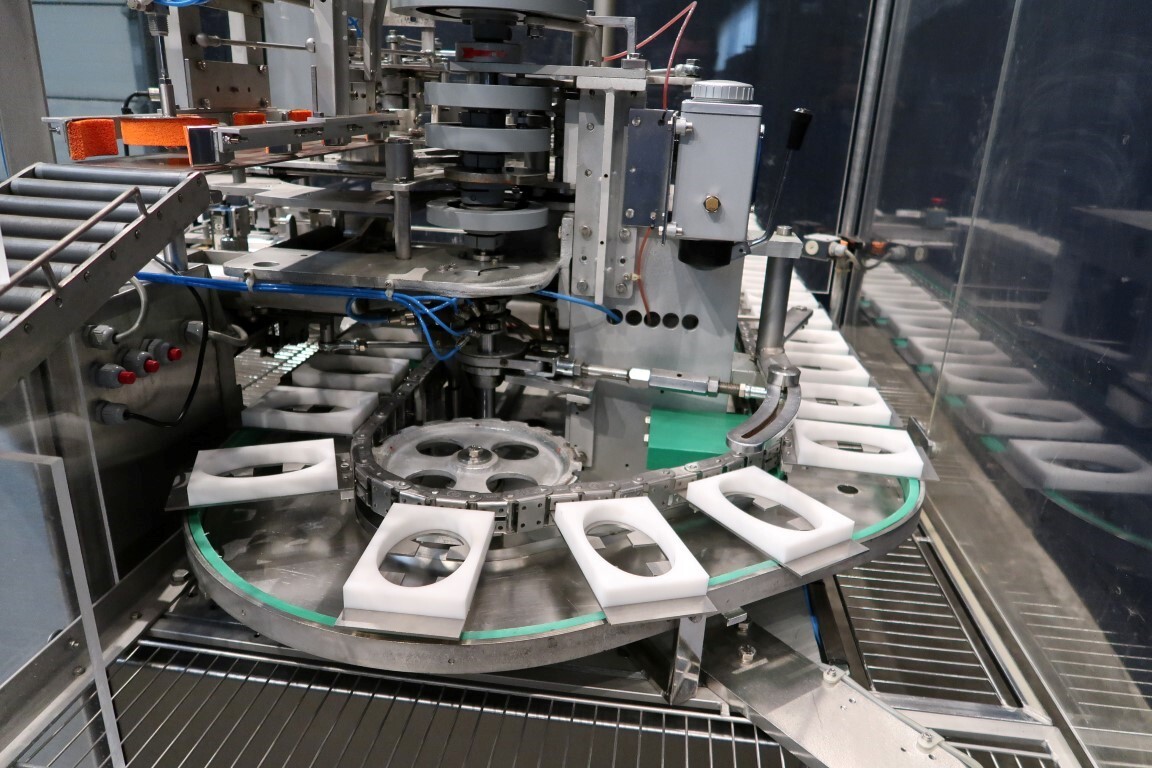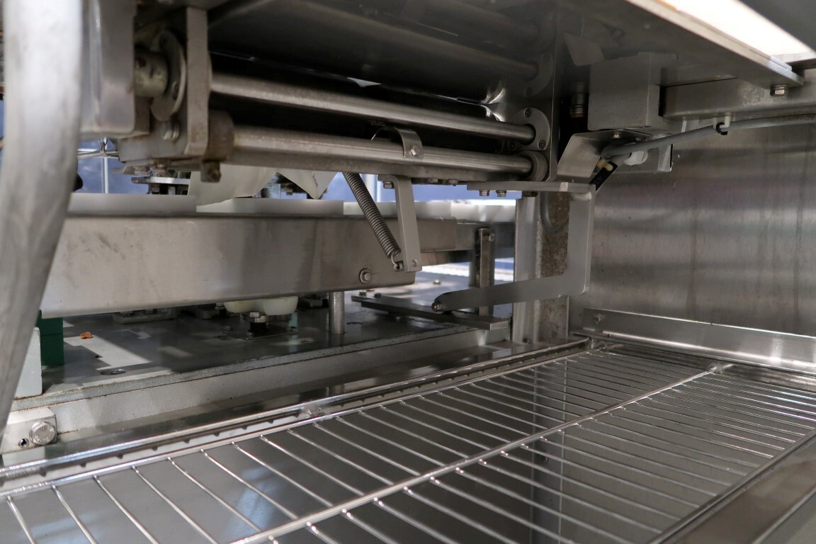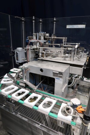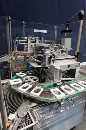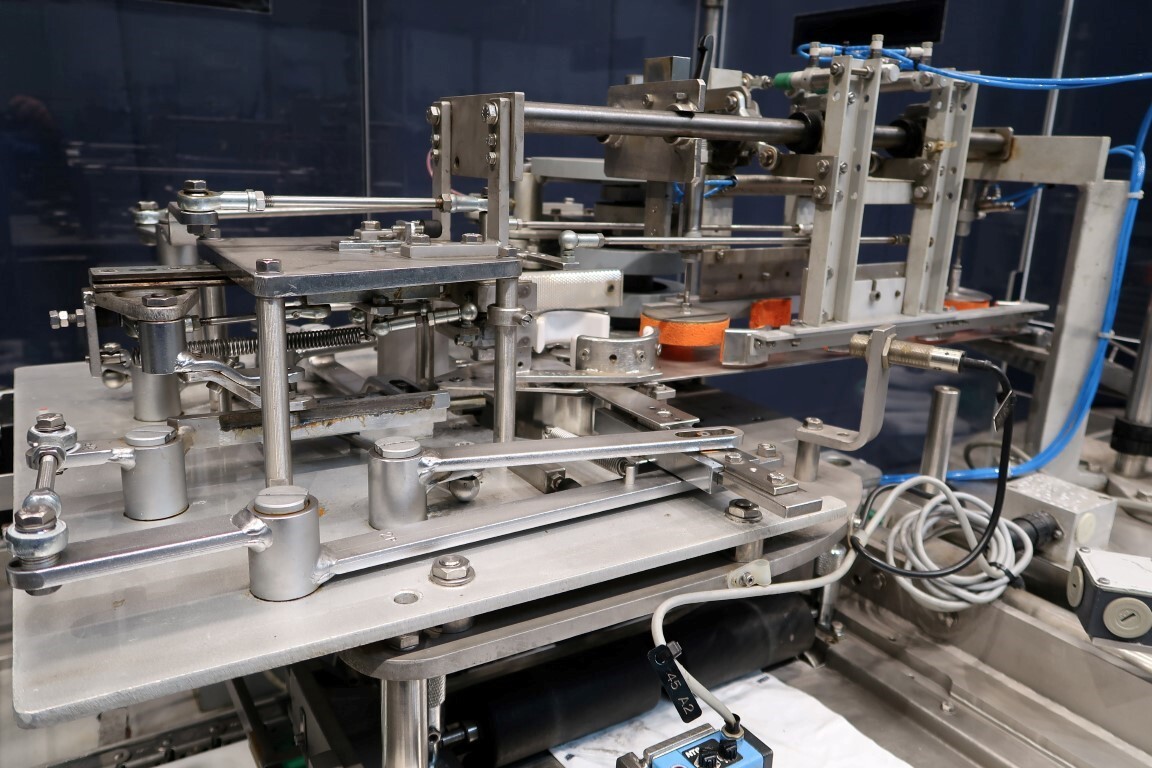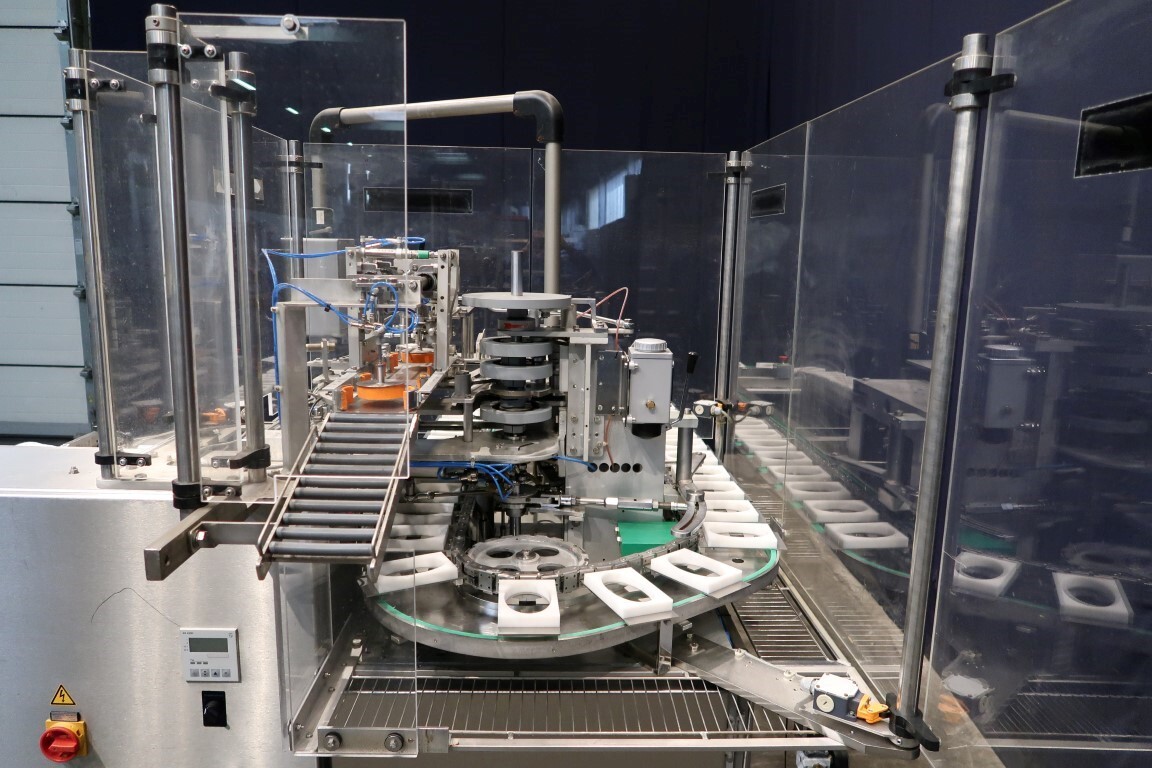 Automatische Folienwickelmaschine für ovale Produkte, geeignet für Käse (Limburger Cammembert, Romadur und Ofengold), aber auch für Seife und ähnliche Produkte. Verpackungsmaterial von einer Rolle wie PE-Folie, Zellglas oder Papier. Inklusive Zuführband. Bedienfeld mit Siemens S5 SPS. Aktuelle Größe oval: 125x75x25mm. Gewicht pro Käse: ca. 260gr. Foliengröße pro Packung: 210x210mm mit Fotozelle zur Druckzentrierung. Inklusive Schaltplan und Dokumentation. Video des Testlaufs verfügbar.