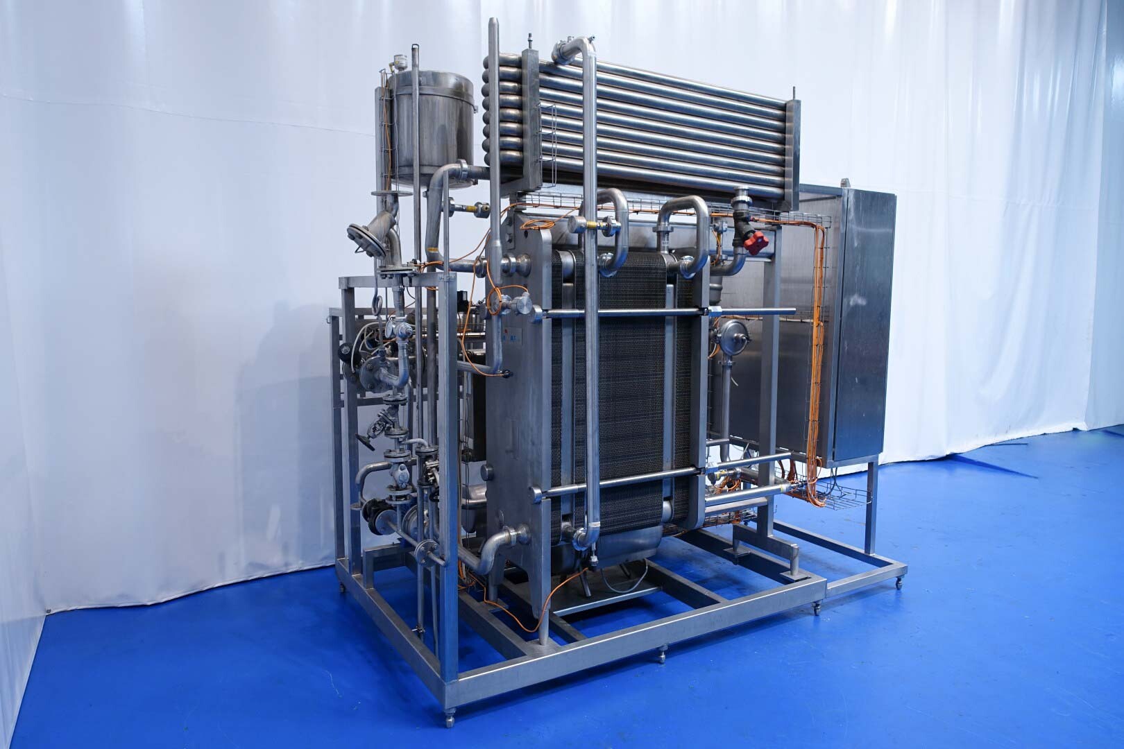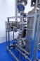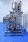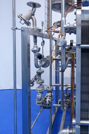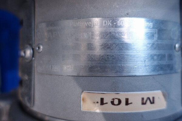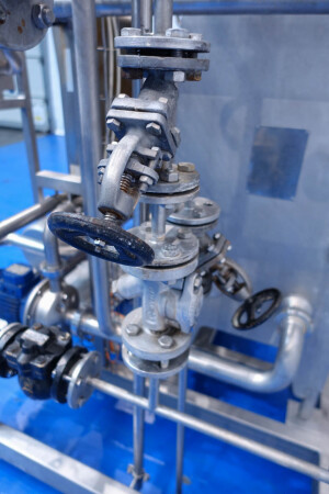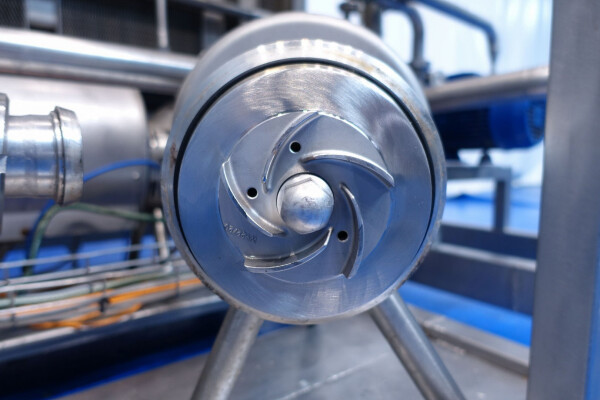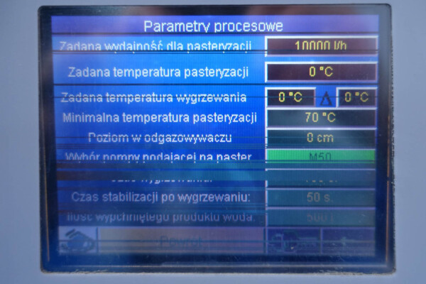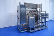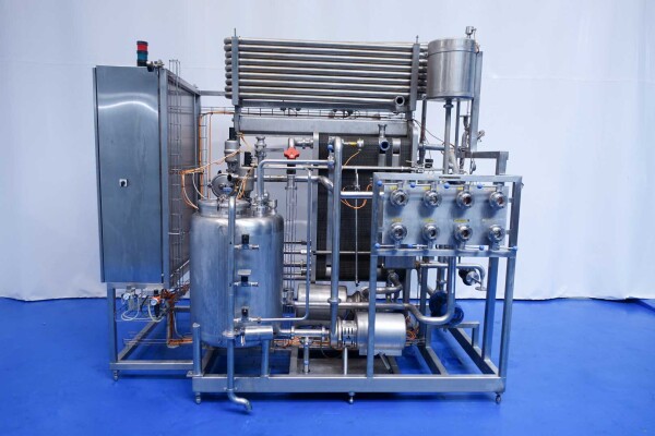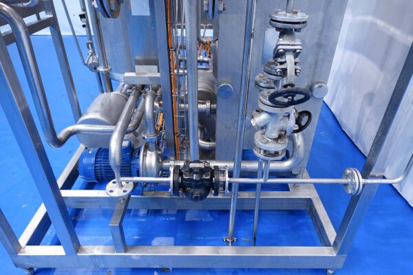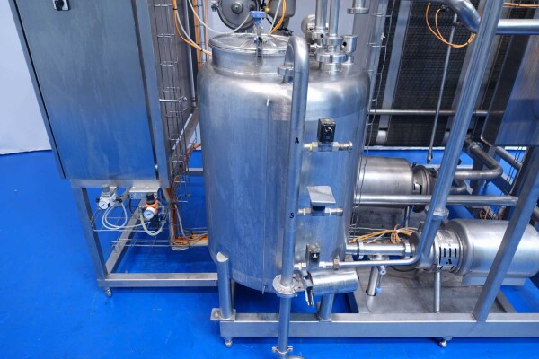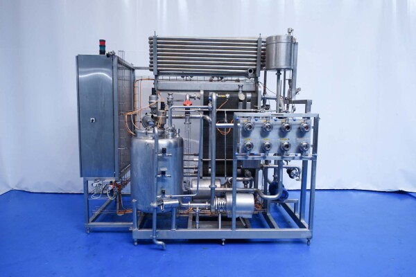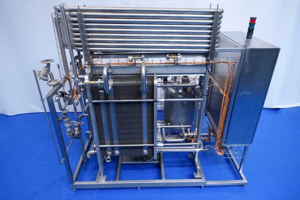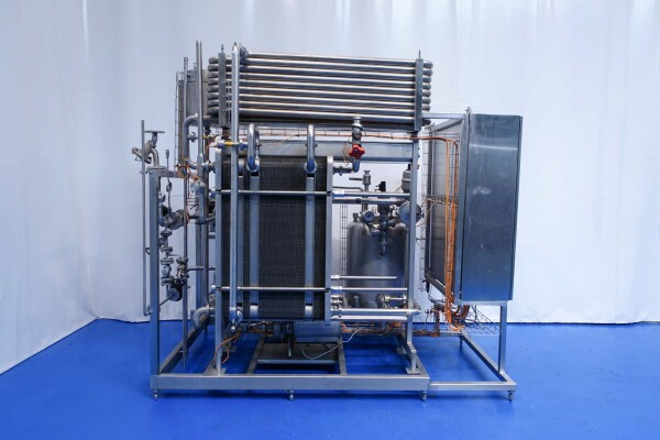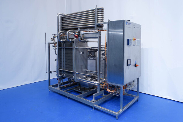 Milchpasteurisierungsanlage. Komplette, auf einem Gestell montierte Anlage mit allen Rohrleitungen und Ventilen auf einem Edelstahlrahmen. Temperaturschema der Milch: Einlass 4 °C -> Auslass zum Homogenisator und/oder Separator (Homogenisator/Separator ausgeschlossen) -> bei ca. 60–65 °C -> Pasteurisierung einstellbar 72–95 °C -> Halten 20 Sek. -> Auslass 4 °C. Hauptkomponente: Plattenwärmetauscher, Hersteller: SPX-APV, Modell: N35 (Seriennr. 71559). Arbeitsdruck: 10 bar. Balkenlänge: 140 cm, 4 Abschnitte: 26-15-105-26 Platten (insgesamt 172). Halterohr oben auf dem Gestell montiert. Zulauf-Ausgleichsbehälter 200 Liter mit 1x CIP-Sprühkugel, Mannloch oben (rund 30 cm), Füllstandsensoren. Förderpumpe, APV W 22/20 Milchförderpumpe (Laufrad 95 mm – Motor 1,1 kW). APV W+55/35 Milchdruckerhöhungspumpe (Laufrad 180 mm – Motor 3,0 kW). Mit Siemens-Durchflussgeber, Drucksensoren (Überdrucksystem, Milch auf der Rohmilchseite wird durch eine Druckerhöhungspumpe auf einem höheren Druck gehalten als auf der pasteurisierten Milchseite und durch Druckgeber gesteuert) und Temperatursensoren. Durchflussumleitung und Zirkulationsventil (Fabrikat APV). Dampfbeheizt mit Dampfregelventil Bürkert, Warmwasserumwälzpumpe und Dampf-/Warmwasser-Austauschset. Es gibt ein Schwenkbiegepanel mit 8 Anschlüssen x 2,5" SMS-Anschlüssen zum Verbinden der Zu- und Ableitungen der Milch- und CIP-Kreisläufe. Bedienung über Touchscreen. Steuerungen: Siemens Simatic S7 und Farb-HMI (reparaturbedürftig). Jumo-Temperaturschreiber. Skid hergestellt von Tewes Bis (Polen). Modell: UPM. Dokumentation: Betriebshandbuch (Englisch, Polnisch und Rumänisch), Schaltpläne und Anleitungen zum APV-Plattenwärmetauscher.