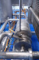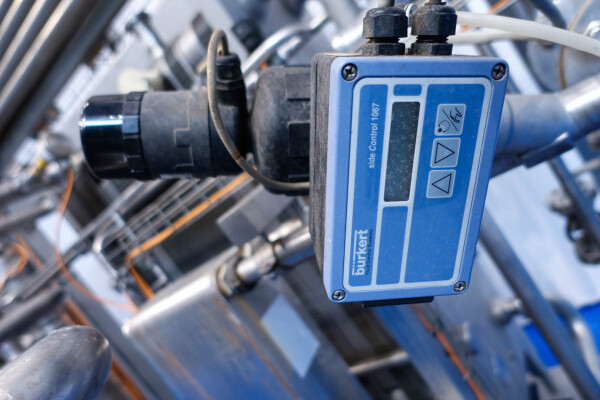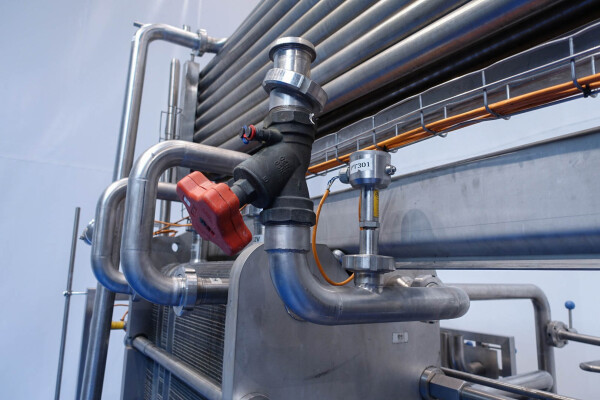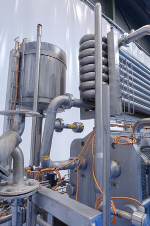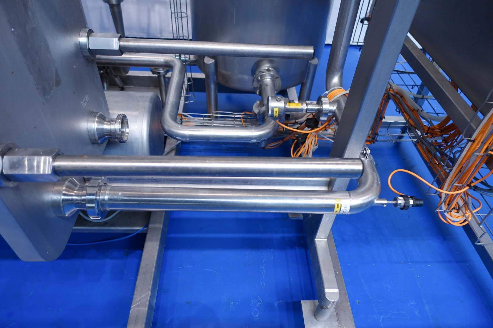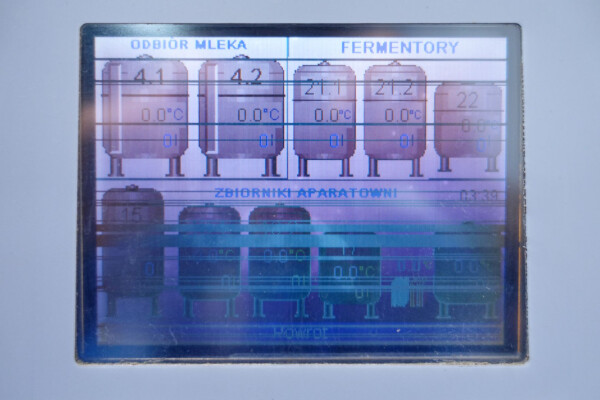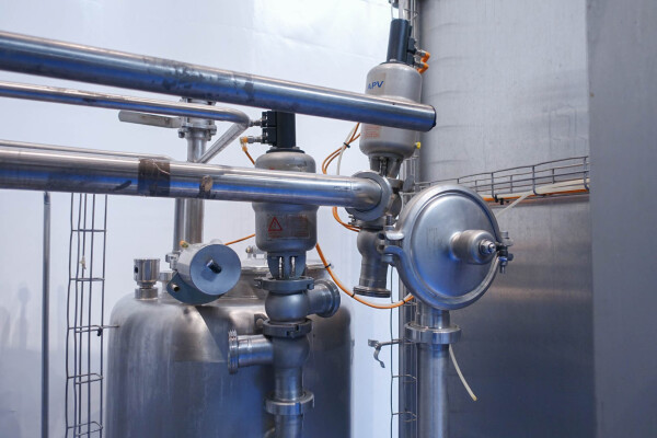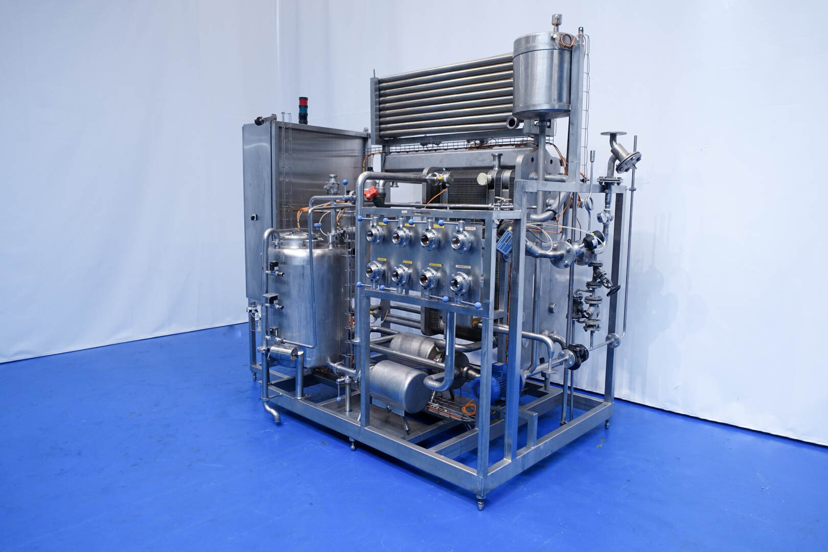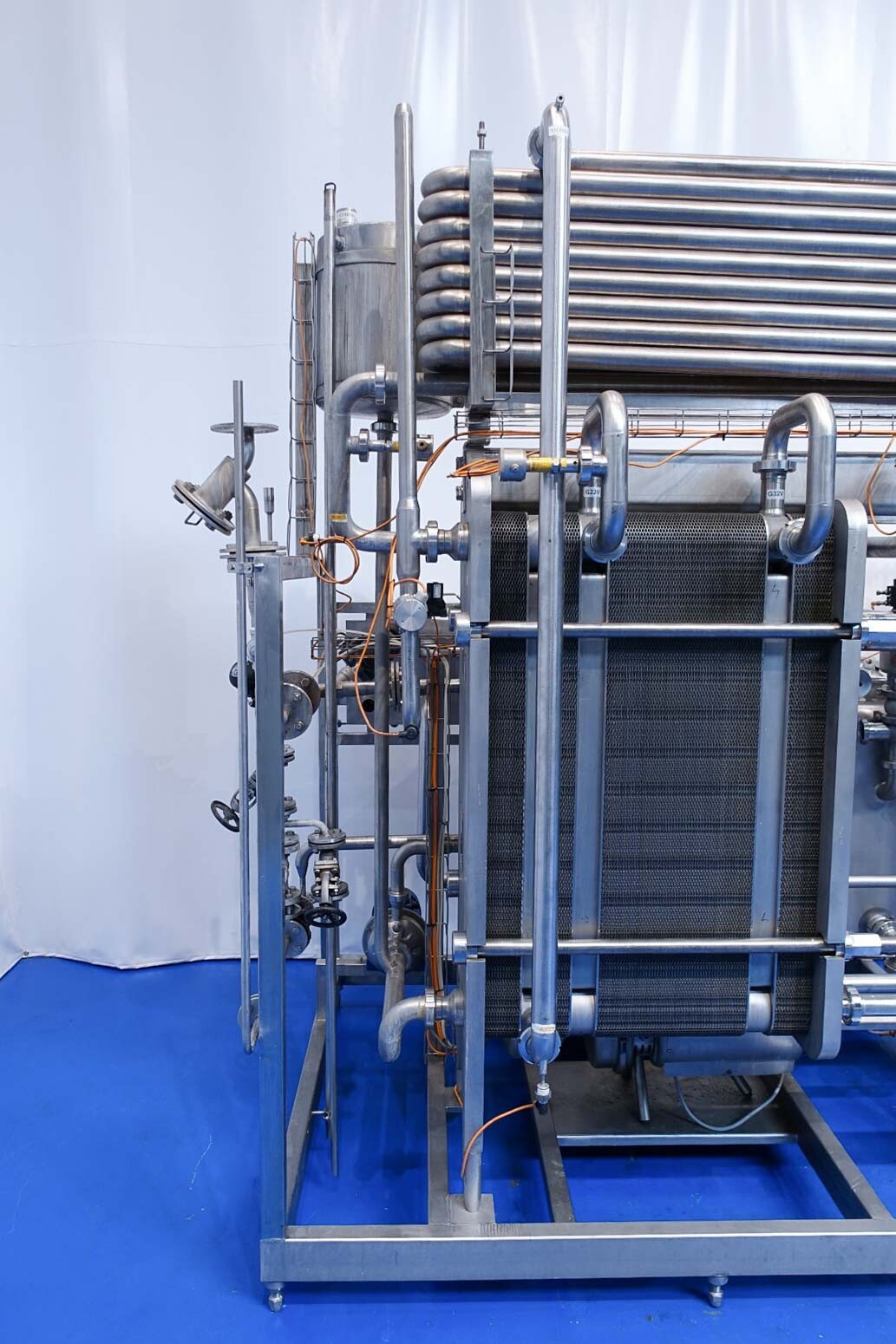 Milchpasteurisierungsanlage. Komplette, auf einem Gestell montierte Anlage mit allen Rohrleitungen und Ventilen auf einem Edelstahlrahmen. Temperaturschema der Milch: Einlass 4 °C -> Auslass zum Homogenisator und/oder Separator (Homogenisator/Separator ausgeschlossen) -> bei ca. 60–65 °C -> Pasteurisierung einstellbar 72–95 °C -> Halten 20 Sek. -> Auslass 4 °C. Hauptkomponente: Plattenwärmetauscher, Hersteller: SPX-APV, Modell: N35 (Seriennr. 71559). Arbeitsdruck: 10 bar. Balkenlänge: 140 cm, 4 Abschnitte: 26-15-105-26 Platten (insgesamt 172). Halterohr oben auf dem Gestell montiert. Zulauf-Ausgleichsbehälter 200 Liter mit 1x CIP-Sprühkugel, Mannloch oben (rund 30 cm), Füllstandsensoren. Förderpumpe, APV W 22/20 Milchförderpumpe (Laufrad 95 mm – Motor 1,1 kW). APV W+55/35 Milchdruckerhöhungspumpe (Laufrad 180 mm – Motor 3,0 kW). Mit Siemens-Durchflussgeber, Drucksensoren (Überdrucksystem, Milch auf der Rohmilchseite wird durch eine Druckerhöhungspumpe auf einem höheren Druck gehalten als auf der pasteurisierten Milchseite und durch Druckgeber gesteuert) und Temperatursensoren. Durchflussumleitung und Zirkulationsventil (Fabrikat APV). Dampfbeheizt mit Dampfregelventil Bürkert, Warmwasserumwälzpumpe und Dampf-/Warmwasser-Austauschset. Es gibt ein Schwenkbiegepanel mit 8 Anschlüssen x 2,5" SMS-Anschlüssen zum Verbinden der Zu- und Ableitungen der Milch- und CIP-Kreisläufe. Bedienung über Touchscreen. Steuerungen: Siemens Simatic S7 und Farb-HMI (reparaturbedürftig). Jumo-Temperaturschreiber. Skid hergestellt von Tewes Bis (Polen). Modell: UPM. Dokumentation: Betriebshandbuch (Englisch, Polnisch und Rumänisch), Schaltpläne und Anleitungen zum APV-Plattenwärmetauscher.