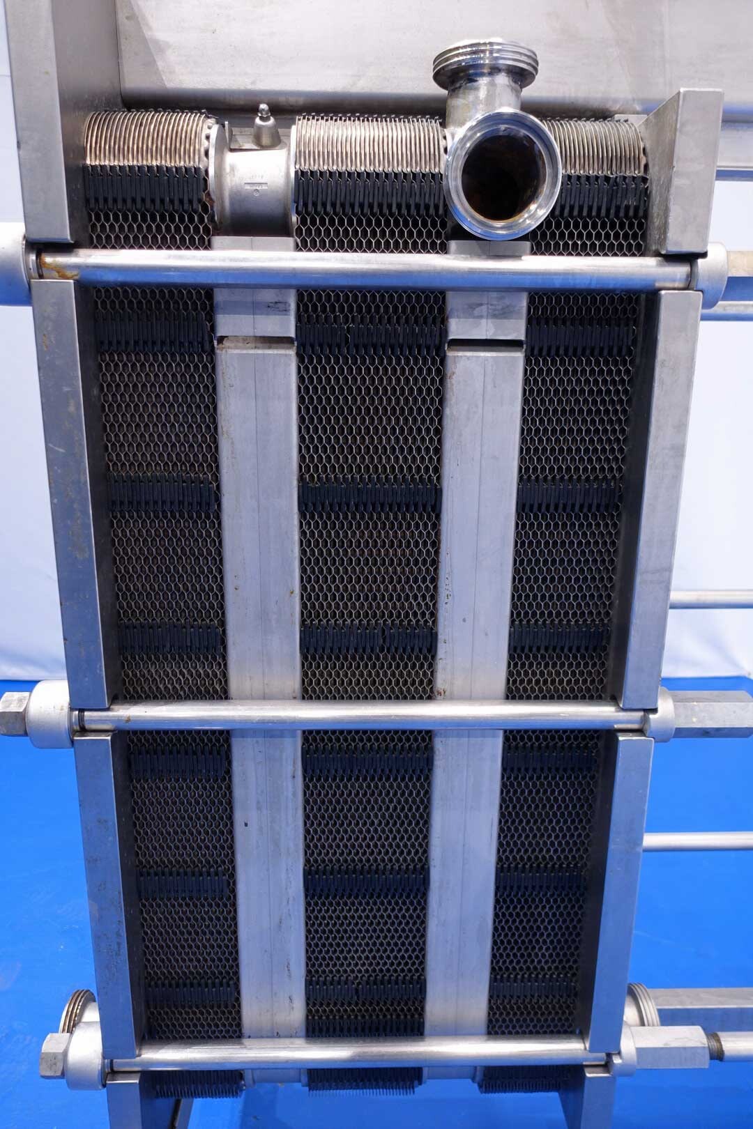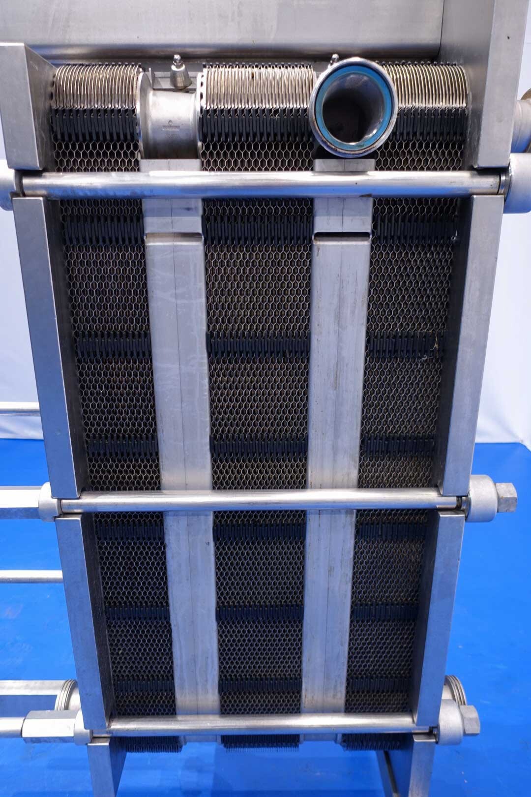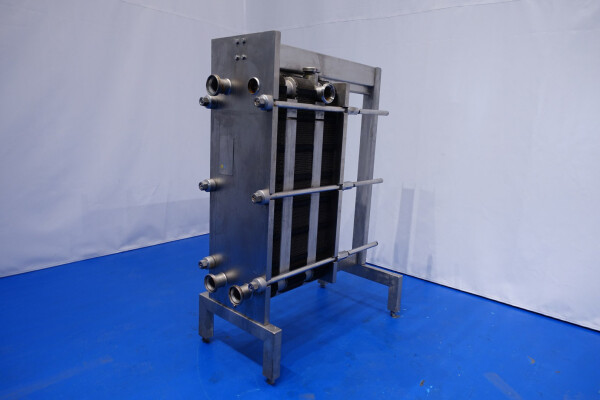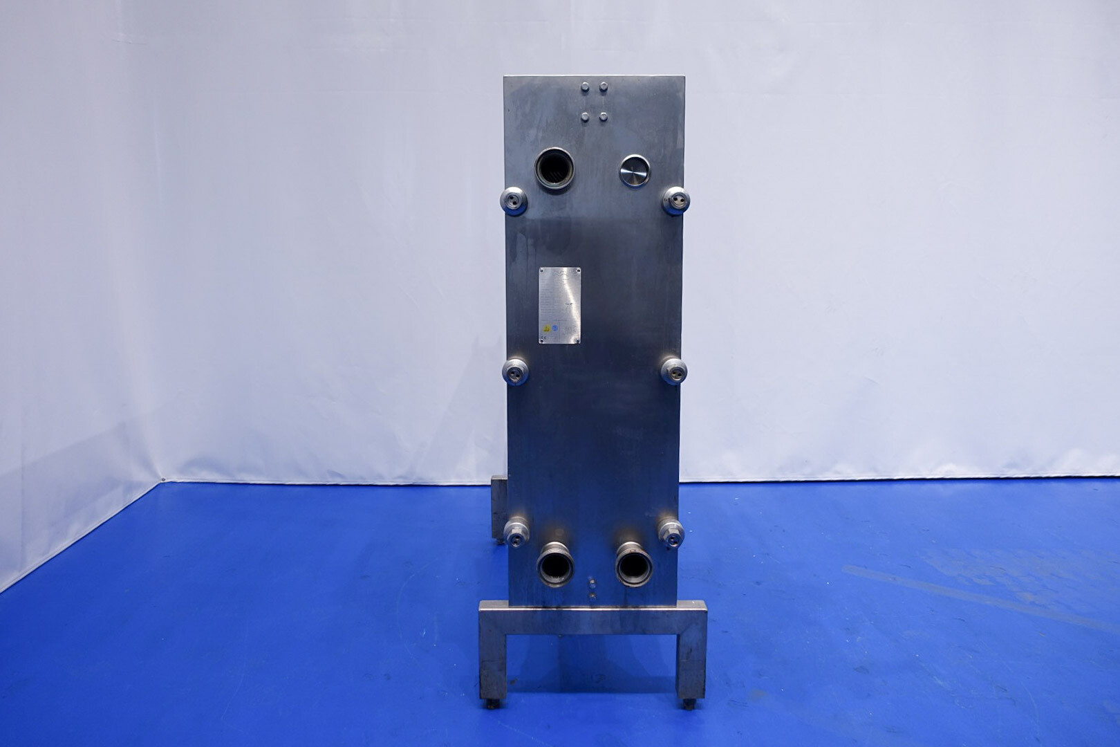 Plattenwärmeübertrager, sanitär (PHE). Druck: 10,0 bar. Strahlengrad: 120 cm. Anschlüsse: 8 x 3" DIN. Aktuelle Konfiguration: 3 Abschnitte: 25-32-24 Platten (insgesamt 81) - Anschlusskopf: 1 oben und 2 unten, Nachfolger 2 unten.