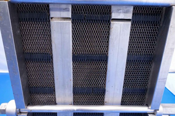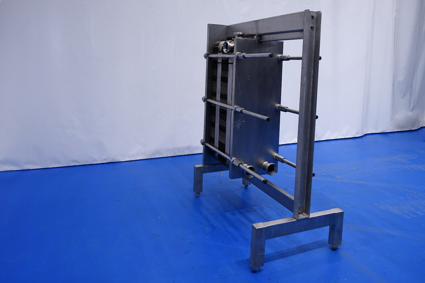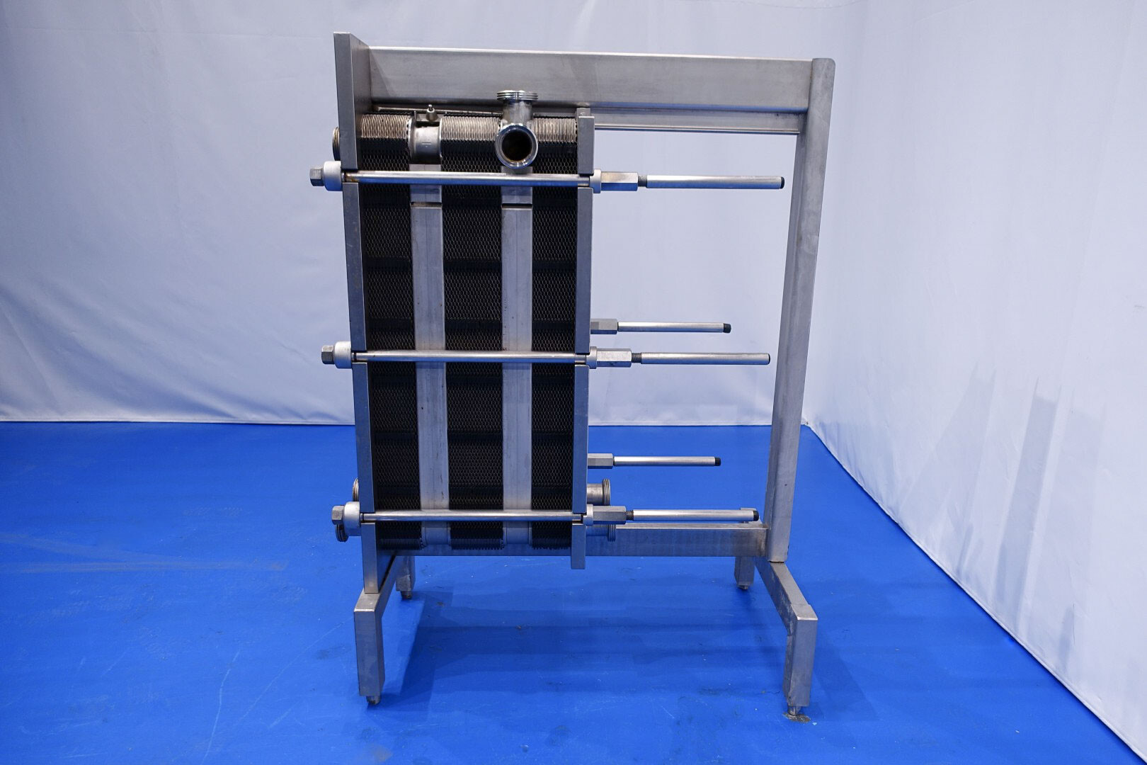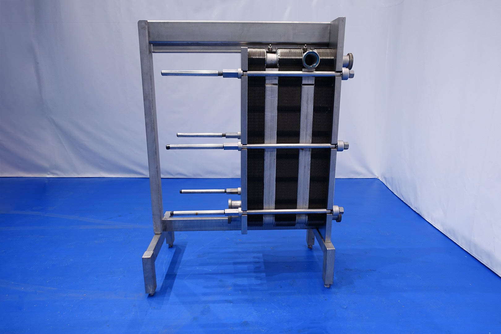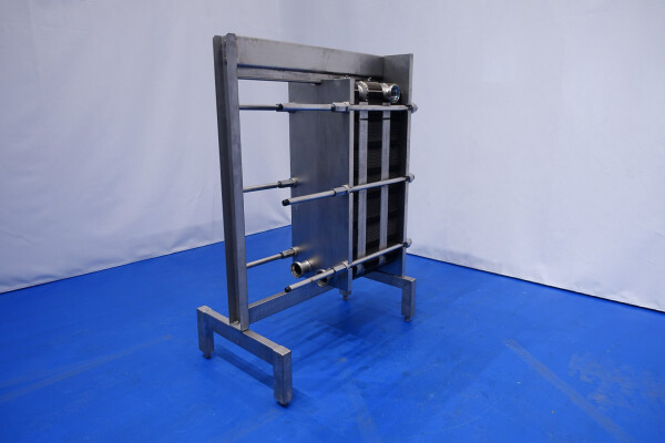 Plattenwärmeübertrager, sanitär (PHE). Druck: 10,0 bar. Strahlengrad: 120 cm. Anschlüsse: 8 x 3" DIN. Aktuelle Konfiguration: 3 Abschnitte: 25-32-24 Platten (insgesamt 81) - Anschlusskopf: 1 oben und 2 unten, Nachfolger 2 unten.