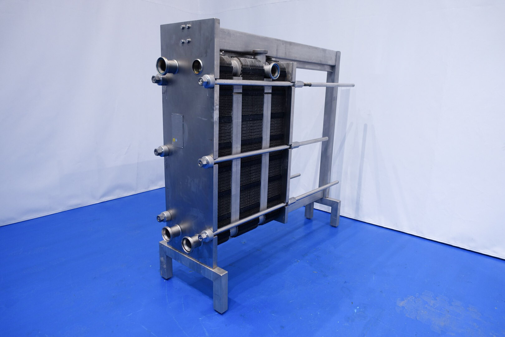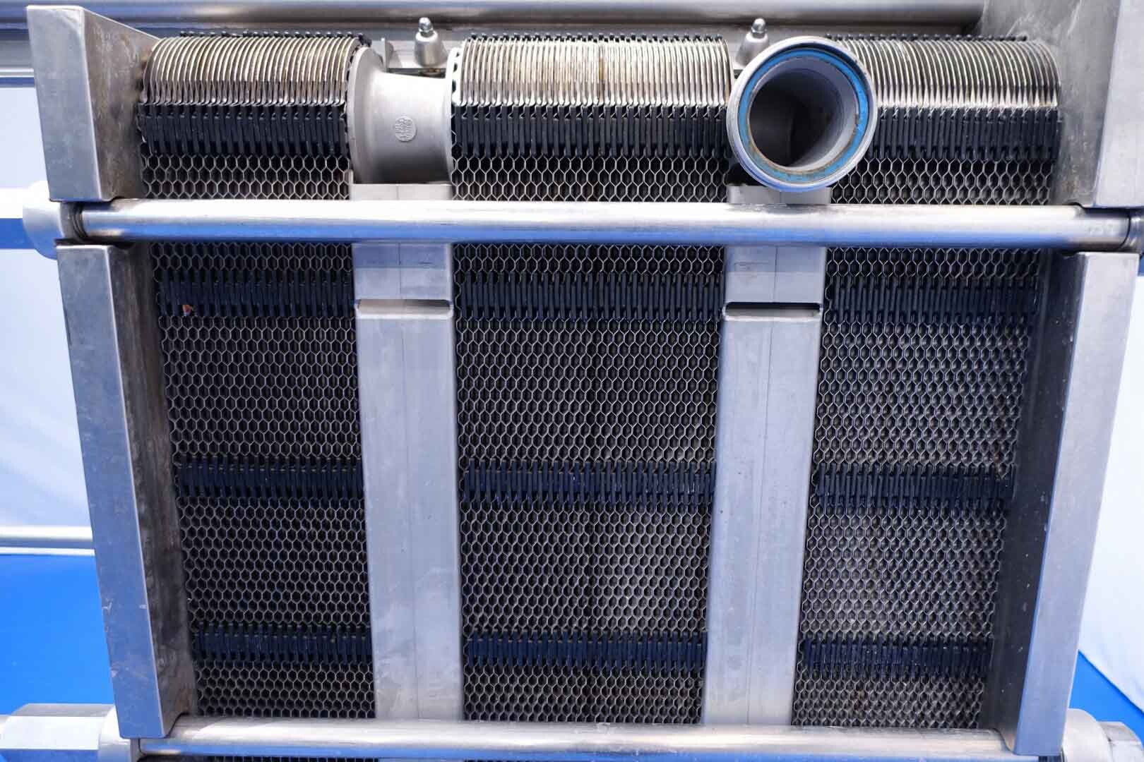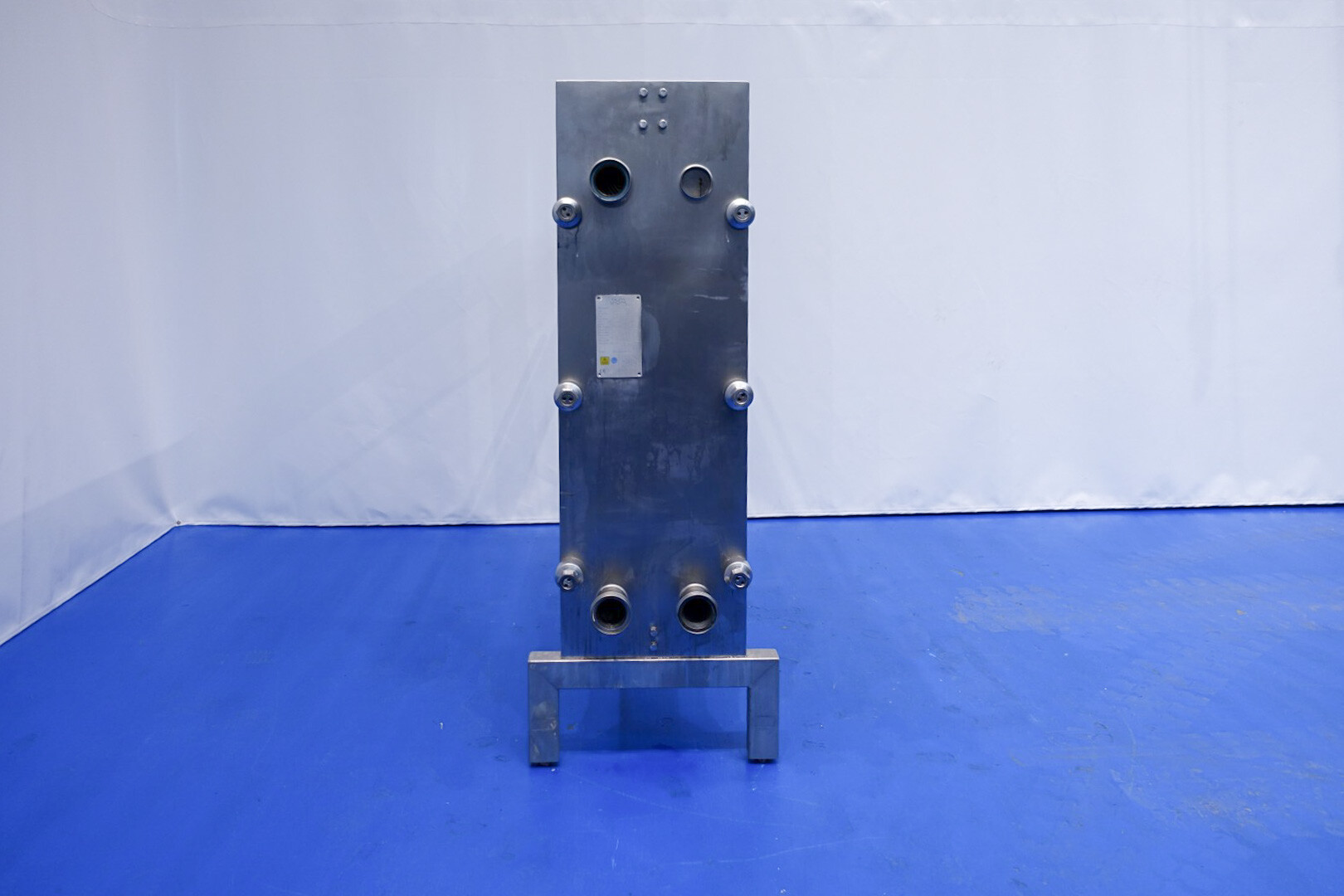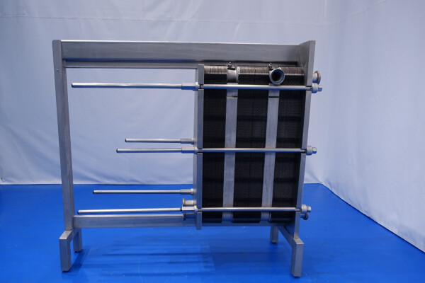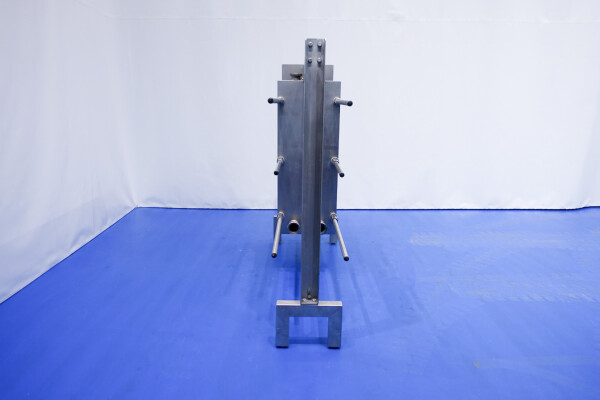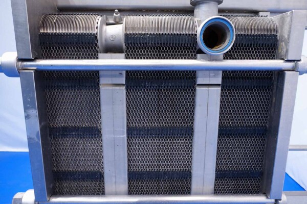 Plattenwärmeübertrager, sanitär (PHE). Druck: 10,0 bar. Strahlengrad: 180 cm. Anschlüsse: 8 x 3" Din. Aktuelle Konfiguration: 3 Abschnitte: 37-48-36 Platten (insgesamt 121 Platten). Anschlusskopf: 2 oben und 2 unten, Nachfolger 2 unten.
