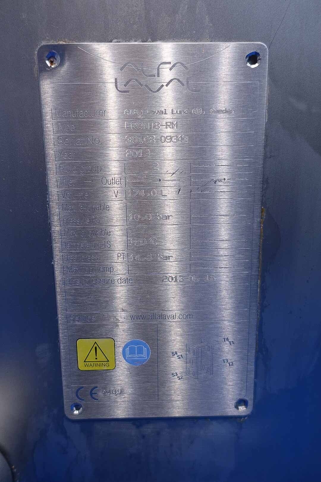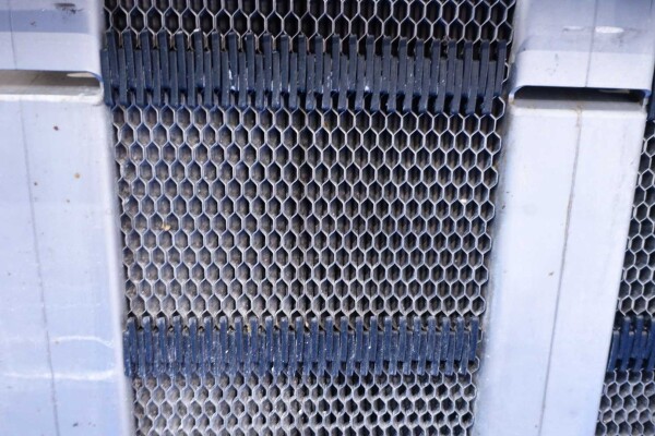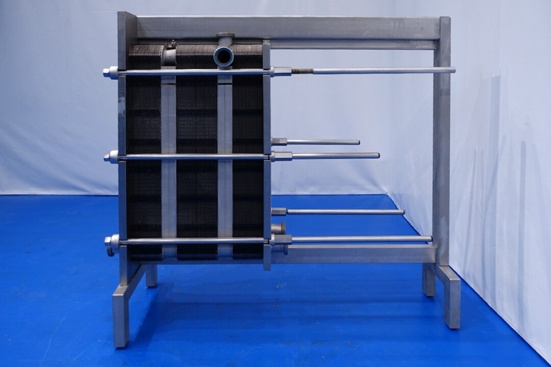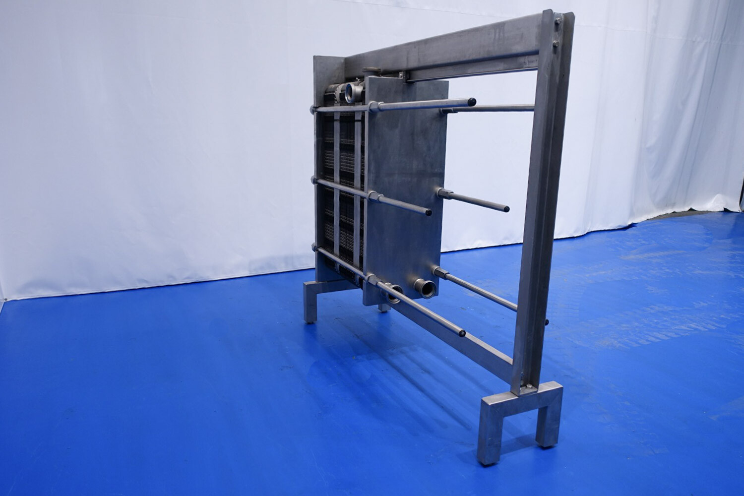 Plattenwärmeübertrager, sanitär (PHE). Druck: 10,0 bar. Strahlengrad: 180 cm. Anschlüsse: 8 x 3" Din. Aktuelle Konfiguration: 3 Abschnitte: 37-48-36 Platten (insgesamt 121 Platten). Anschlusskopf: 2 oben und 2 unten, Nachfolger 2 unten.