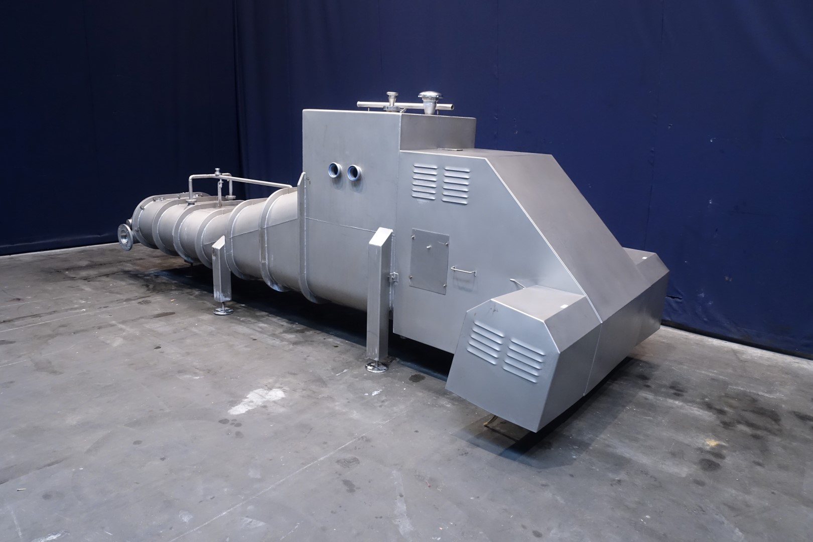 Reworker without front plate mixer. Reworker for pre-conditioned butter (+ 4...8°C) not for frozen butter. Volume: 1.950 liter. Worms: 2 x 400 mm diameter. Power: 2 gearbox motors, each 11 kW, 400 V. Sprayballs: 4 pcs. (each 8/12 m3/h). Material: Stainless-Steel 1.4301. 2x Control cabinets for Reworker with MCC, frequency converter and Siemens S7-300 PLC, operator panel cabinet for reworker with Siemens HMI-Touchscreen. Total dimensions: 450 x 180 x 172 cm. Weight: 2,400 kg. Will be sold in combination with 1 or 2 pinmixers, STN14909 + STN14910.