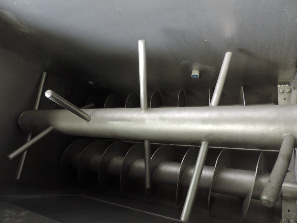 Stainless steel mixer doser for dry ingredients with 2 outfeed screws. (used for dosing dry ingredients on to a conveyor) by loadcells and start stop dosing screws. Horizontal. Single jacketed. Manual cleanable. Motor: 2,2 kW - 380 V - 4,5 A - 50 Hz - n1: 1450 rpm - n2: 715 rpm. Pinnen axle speed controlable with variator. Outlet manual tiltable. Half closed cover. No controls. Dimensions product room: 120 x 60 x 100 cm. Total outside dimensions 160 x 80 x 225 cm.