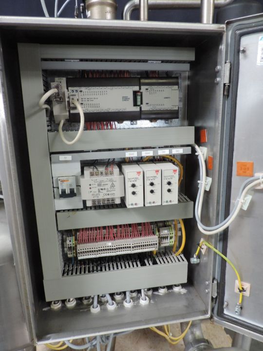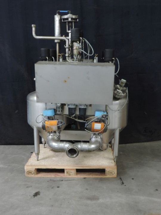 Transport system for liquid products which need extreme gentle treatment of the pumped product. No moving parts touch the product, specially designed for curds of soft cheese. 2x Level tanks. 1x Tank will be filled with curd by vacuum and other tank curd will be emptied with compressed air. This gives a minimum damage to the curd or any other product which cannot resist any shear. Product connections NW100. Working pressure 0,3 bar. Air consumption: ± 800 ltr/min. Control panel with Omron PLC. Dimensions (lxwxh):1,20 x 1,65 x 1,70 mtr. Weight: ca. 450 kg's.