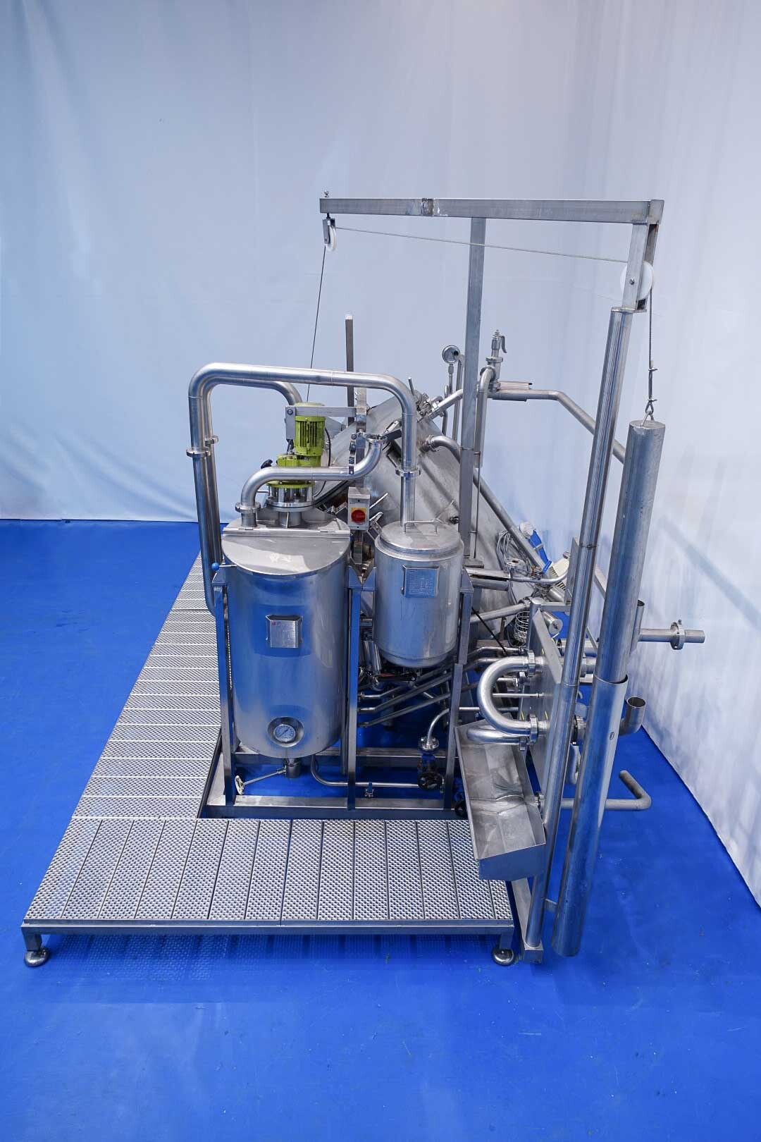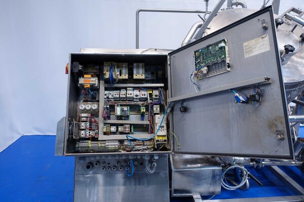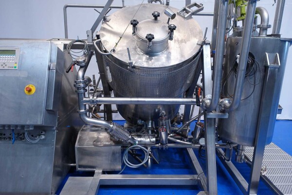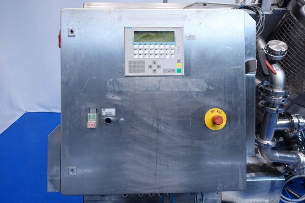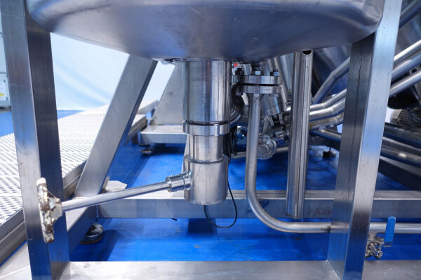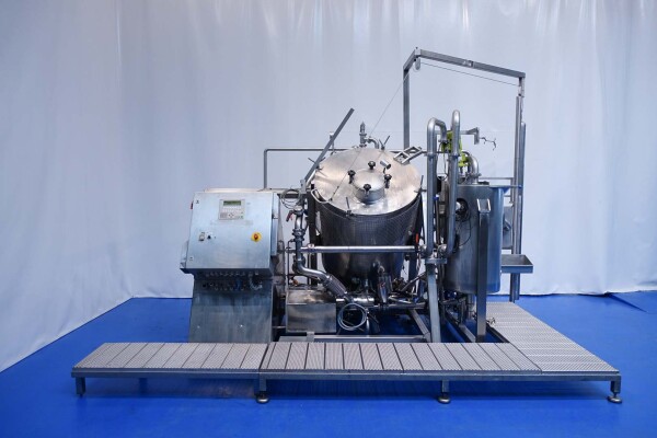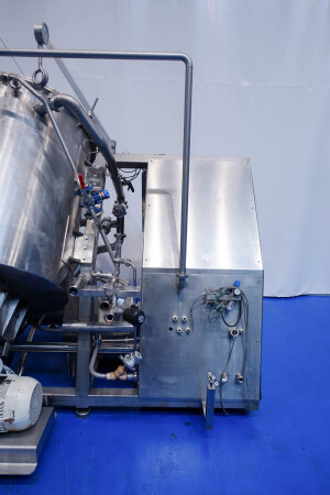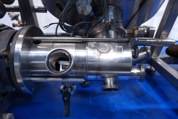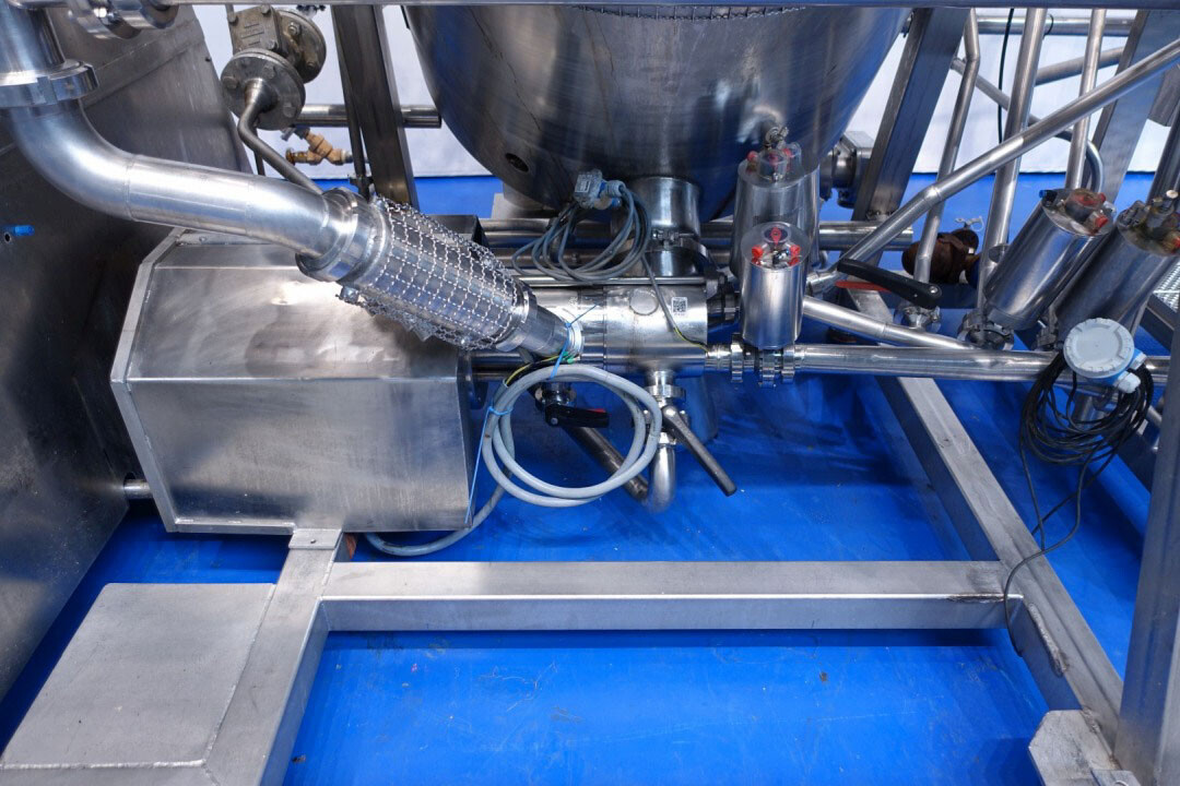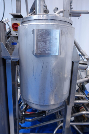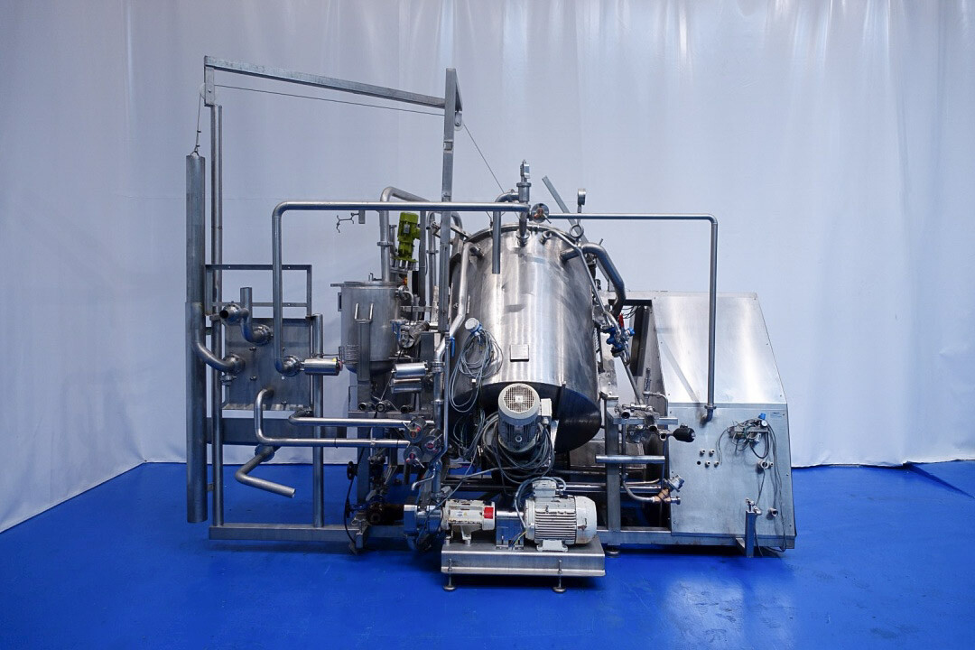 Batch sauce processor with Fryma Koruma Disho homogenising head. Diameter 140mm and ingredient injections on the head to emulsify and disperge ingredients for sauces like Mayonnaise. The Koruma head has a custom build vacuum tank (Make IDS) on top with scraper agitator (5,5kW), Capacity approx 500ltr per batch (total volume tank: 870ltr) with double jacketed (6bar) for indirect heating. Pressure in tank Vacuum to over pressure: 0,2 bar. Max working temperature: 130°C. Vacuum system with build in vacuum pump (Sihi model: Lema 26 AZ,  0,75kW), a product circulation system. Including a pre-mix tank for ingredients with agitator (150ltr) and feed make: Bornemann spin pump model: SLH80-40 year: 2006.