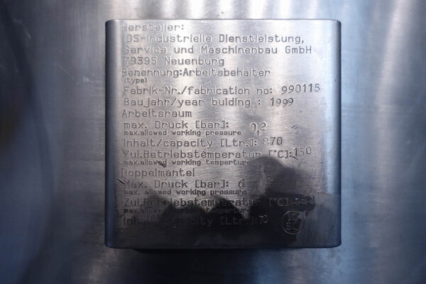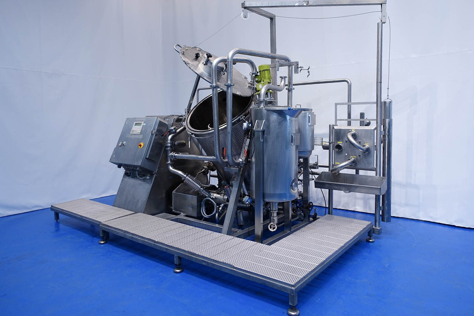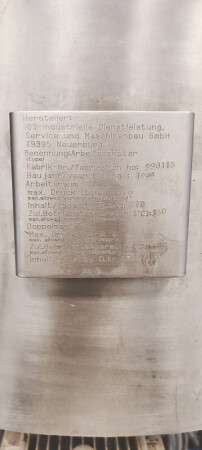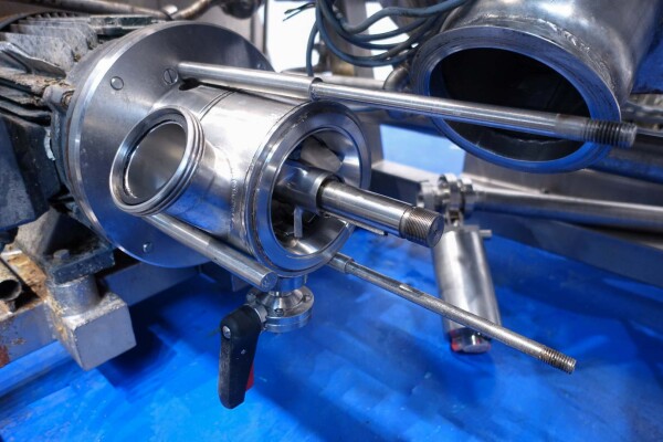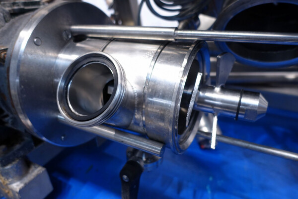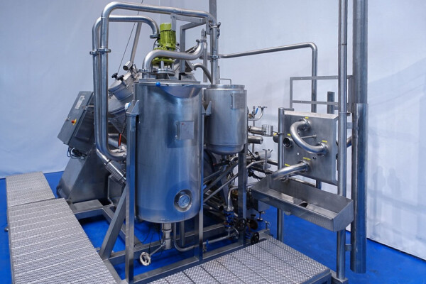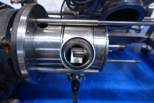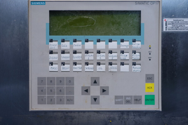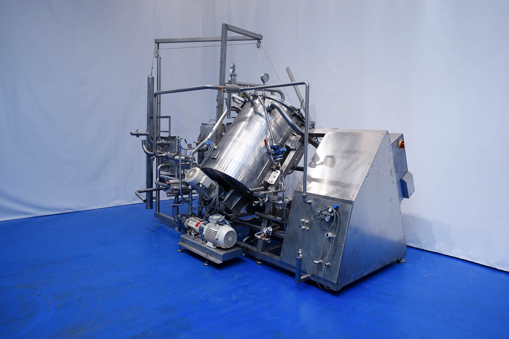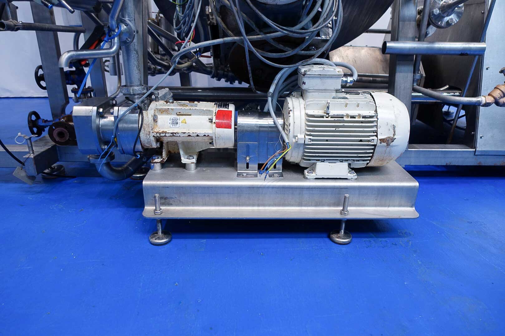 Batch sauce processor with Fryma Koruma Disho homogenising head. Diameter 140mm and ingredient injections on the head to emulsify and disperge ingredients for sauces like Mayonnaise. The Koruma head has a custom build vacuum tank (Make IDS) on top with scraper agitator (5,5kW), Capacity approx 500ltr per batch (total volume tank: 870ltr) with double jacketed (6bar) for indirect heating. Pressure in tank Vacuum to over pressure: 0,2 bar. Max working temperature: 130°C. Vacuum system with build in vacuum pump (Sihi model: Lema 26 AZ,  0,75kW), a product circulation system. Including a pre-mix tank for ingredients with agitator (150ltr) and feed make: Bornemann spin pump model: SLH80-40 year: 2006.