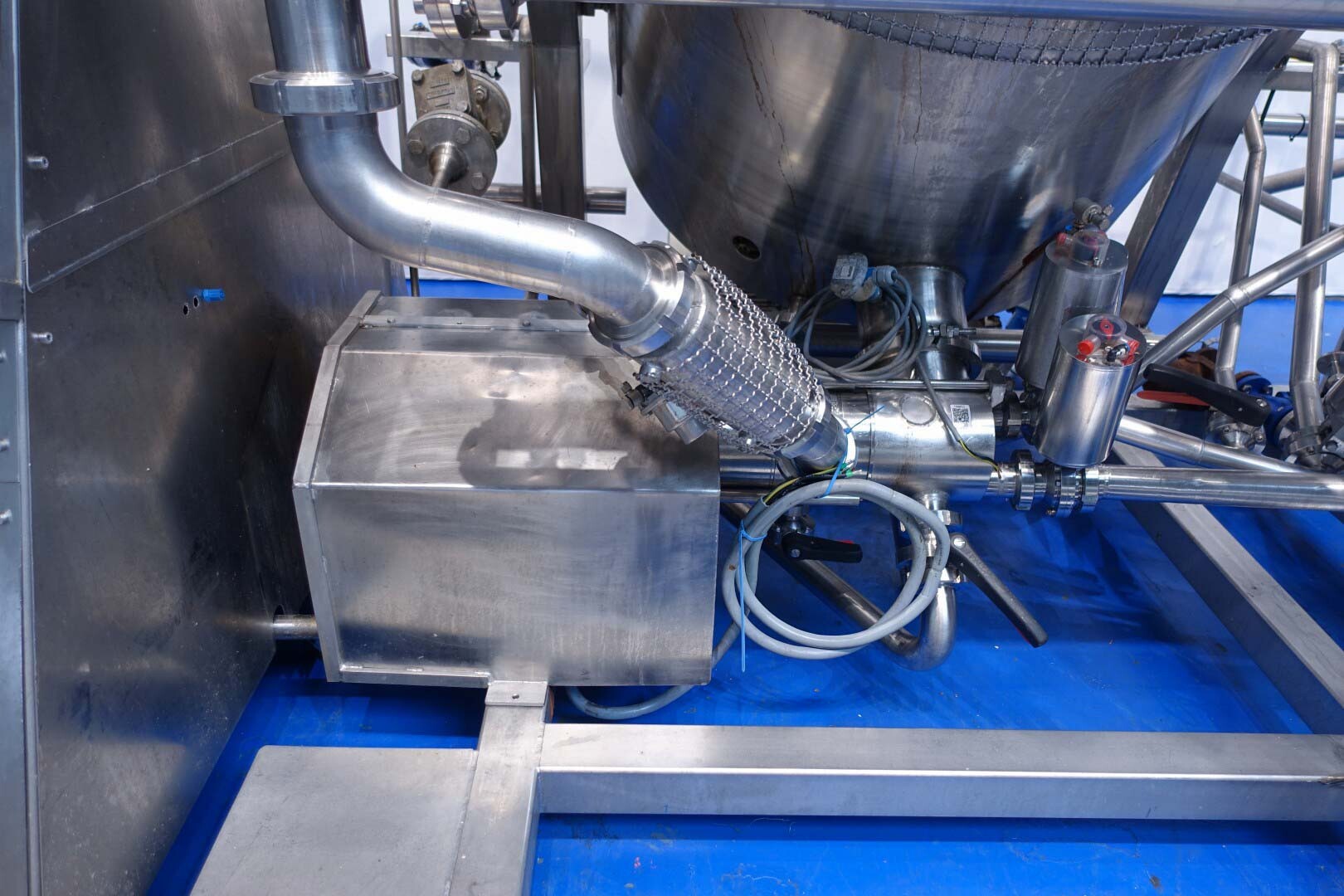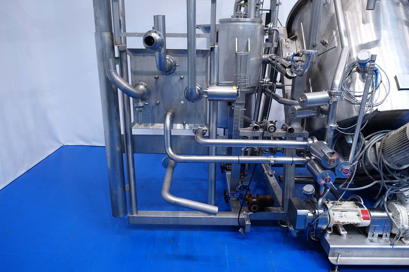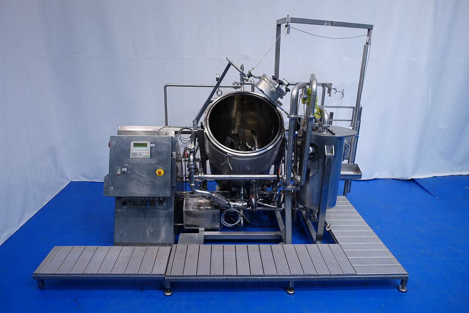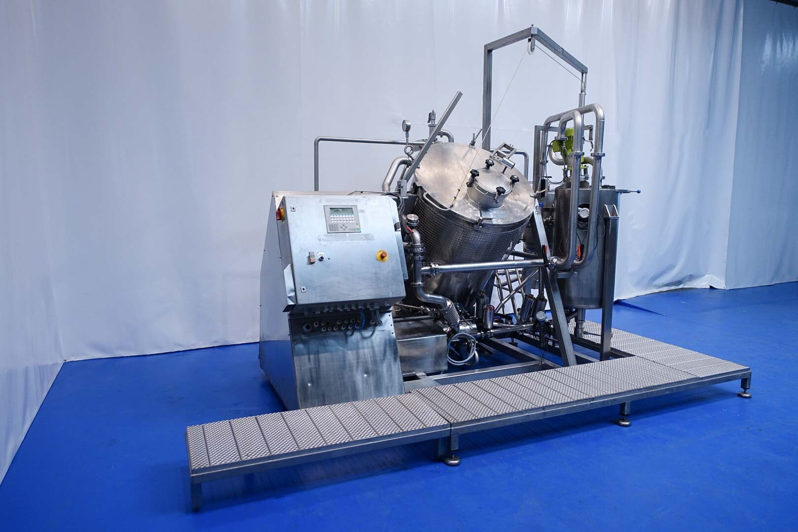 Batch sauce processor with Fryma Koruma Disho homogenising head. Diameter 140mm and ingredient injections on the head to emulsify and disperge ingredients for sauces like Mayonnaise. The Koruma head has a custom build vacuum tank (Make IDS) on top with scraper agitator (5,5kW), Capacity approx 500ltr per batch (total volume tank: 870ltr) with double jacketed (6bar) for indirect heating. Pressure in tank Vacuum to over pressure: 0,2 bar. Max working temperature: 130°C. Vacuum system with build in vacuum pump (Sihi model: Lema 26 AZ,  0,75kW), a product circulation system. Including a pre-mix tank for ingredients with agitator (150ltr) and feed make: Bornemann spin pump model: SLH80-40 year: 2006.