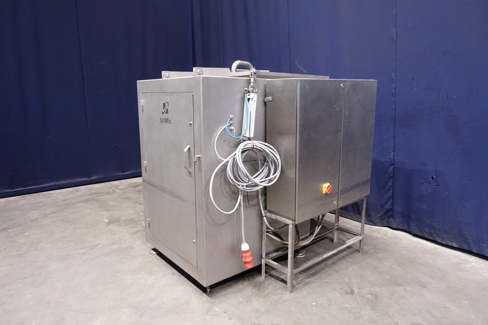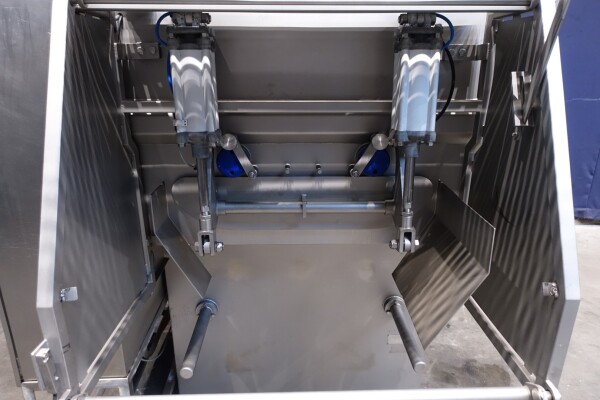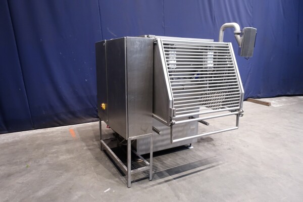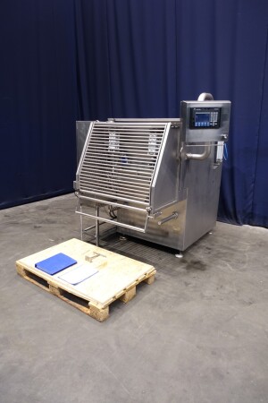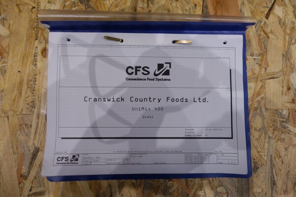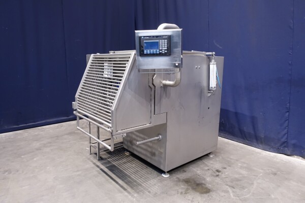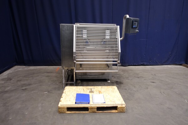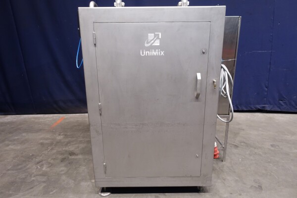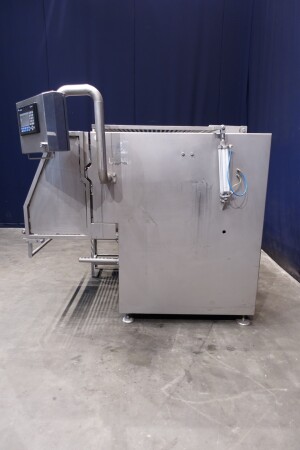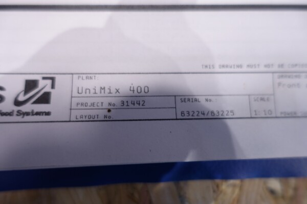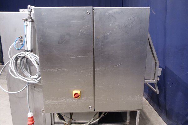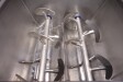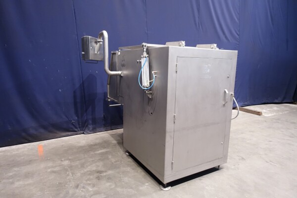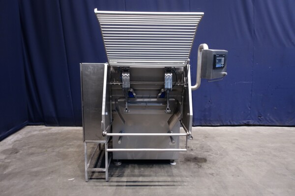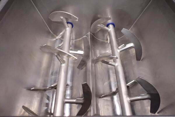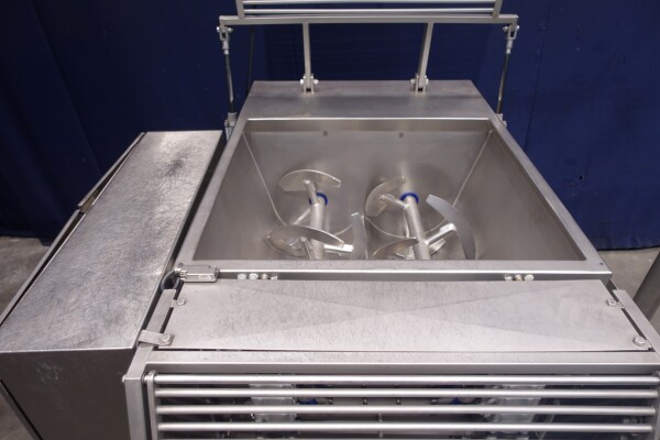 Peddle mixer with 2 axles. Horizontal. Single jacketed. Manual cleanable. Outlet slide, pneumatic controlled. Framework cover. Cover manual tiltable. 2x New independent motors: 7,5 kW - 400 V - 15,5 A - 50 Hz - 965/1450 rpm. Reduction box: i = 40. N2: 24/36 rpm. Dimensions product room: 80 x 90 x 60 cm. Control panel with PLC and Allen-Bradley PanelView 550 operation panel. Total outside dimensions 190 x 185 x 182 cm.
