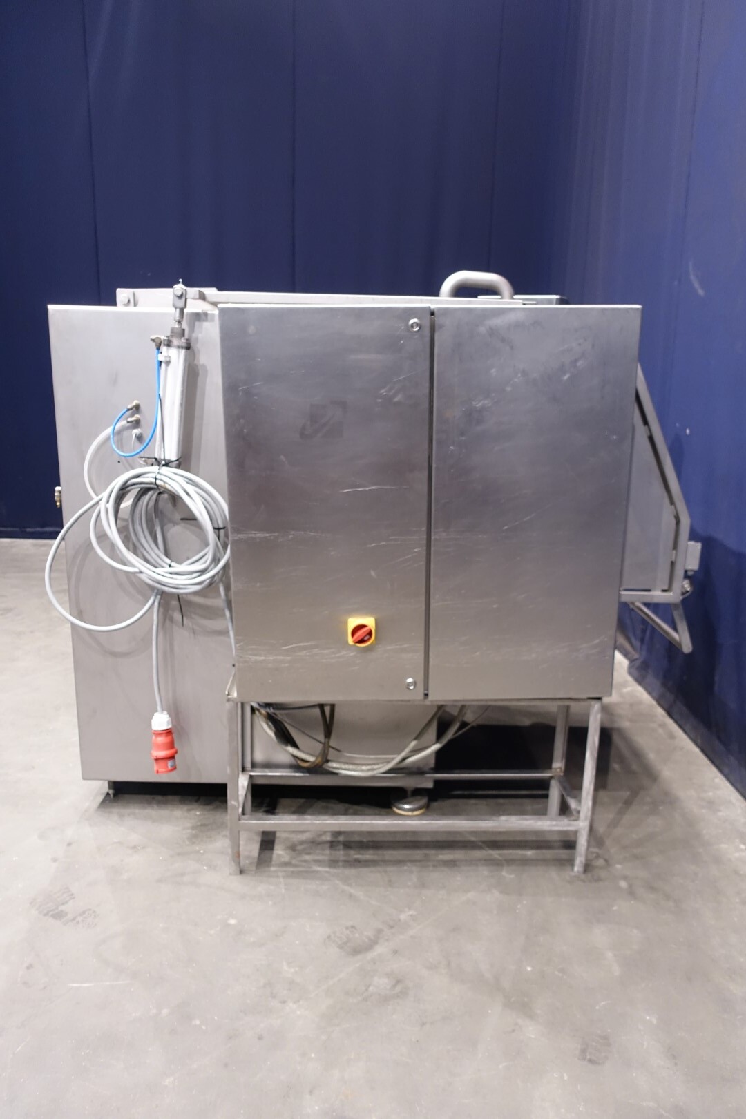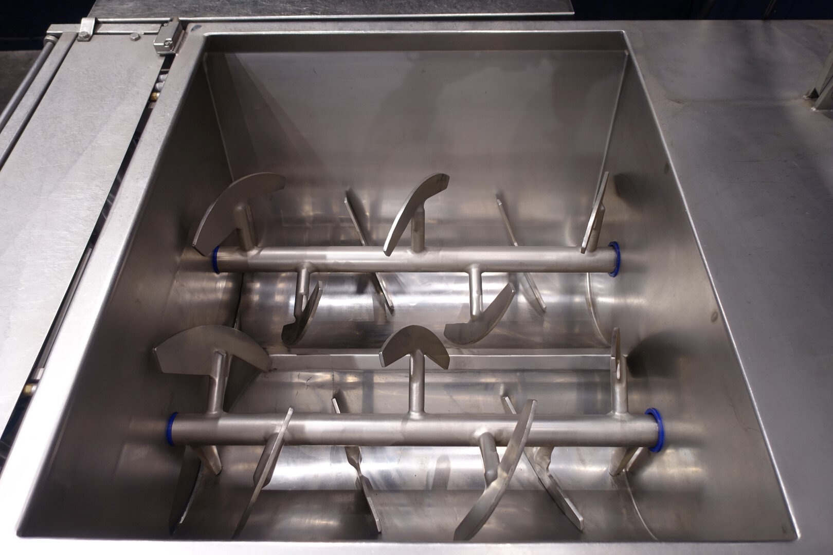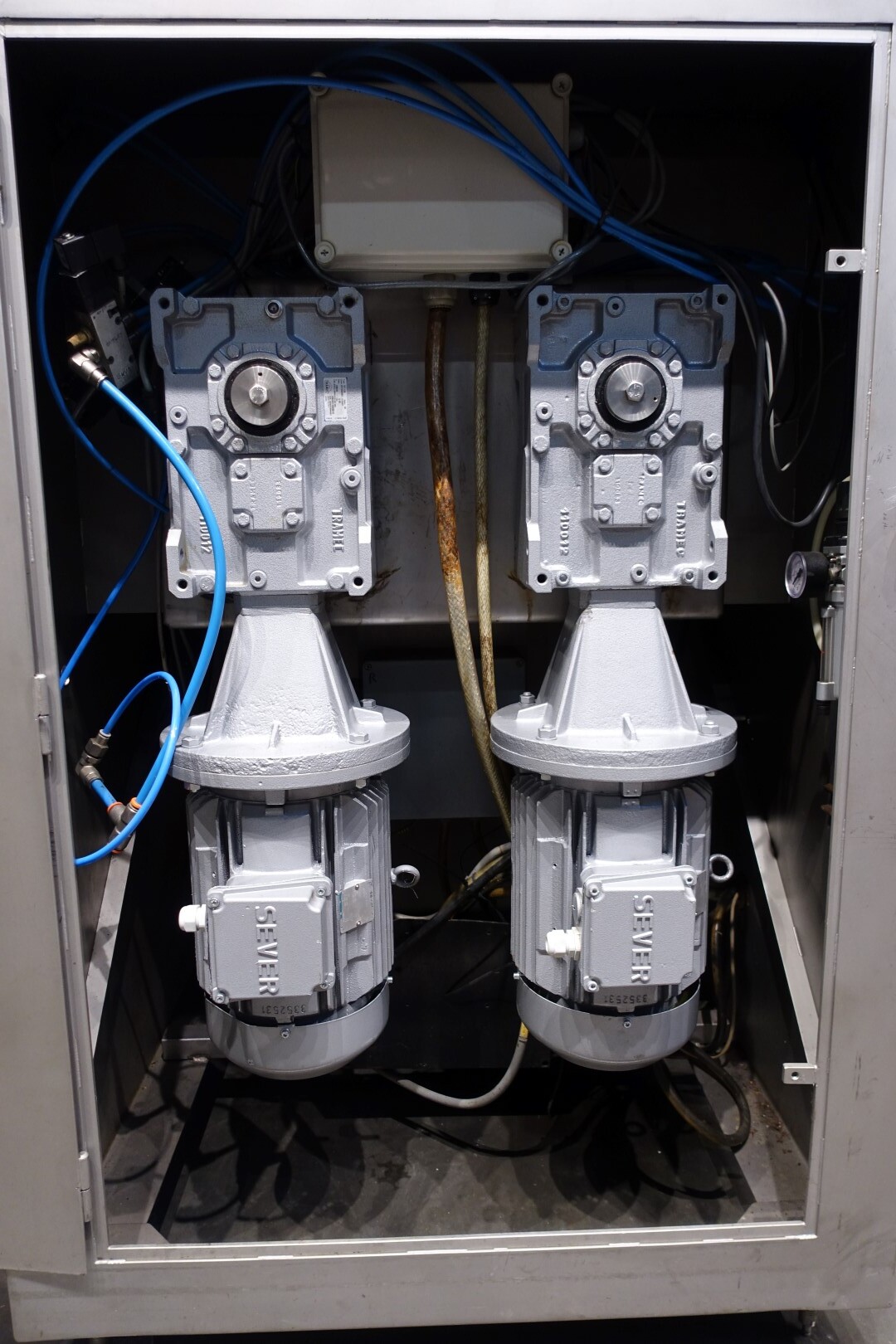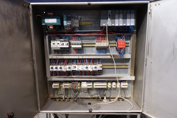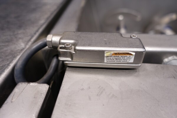 Peddle mixer with 2 axles. Horizontal. Single jacketed. Manual cleanable. Outlet slide, pneumatic controlled. Framework cover. Cover manual tiltable. 2x New independent motors: 7,5 kW - 400 V - 15,5 A - 50 Hz - 965/1450 rpm. Reduction box: i = 40. N2: 24/36 rpm. Dimensions product room: 80 x 90 x 60 cm. Control panel with PLC and Allen-Bradley PanelView 550 operation panel. Total outside dimensions 190 x 185 x 182 cm.