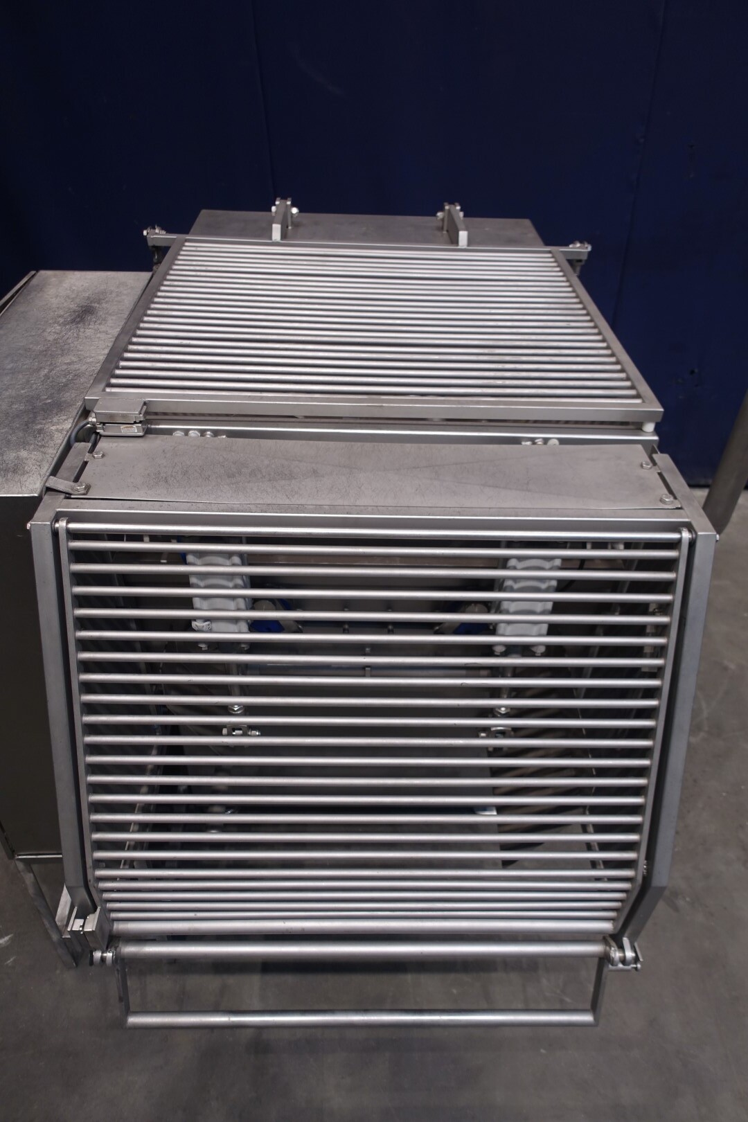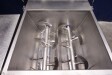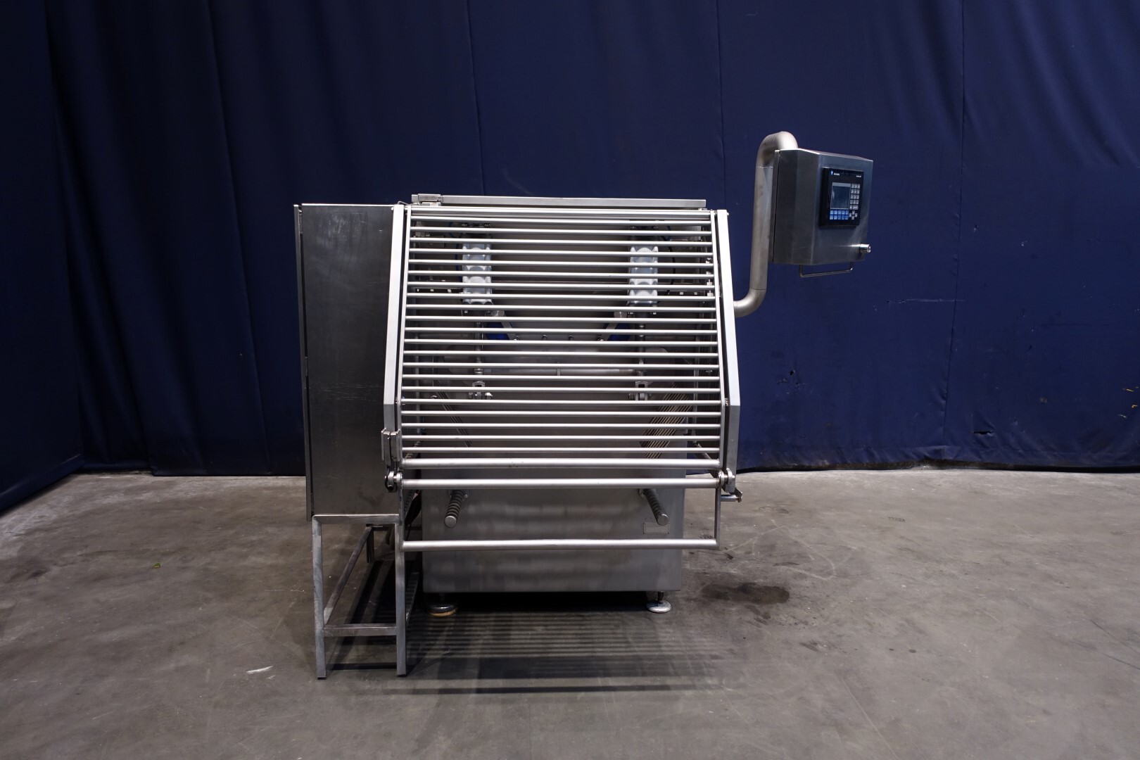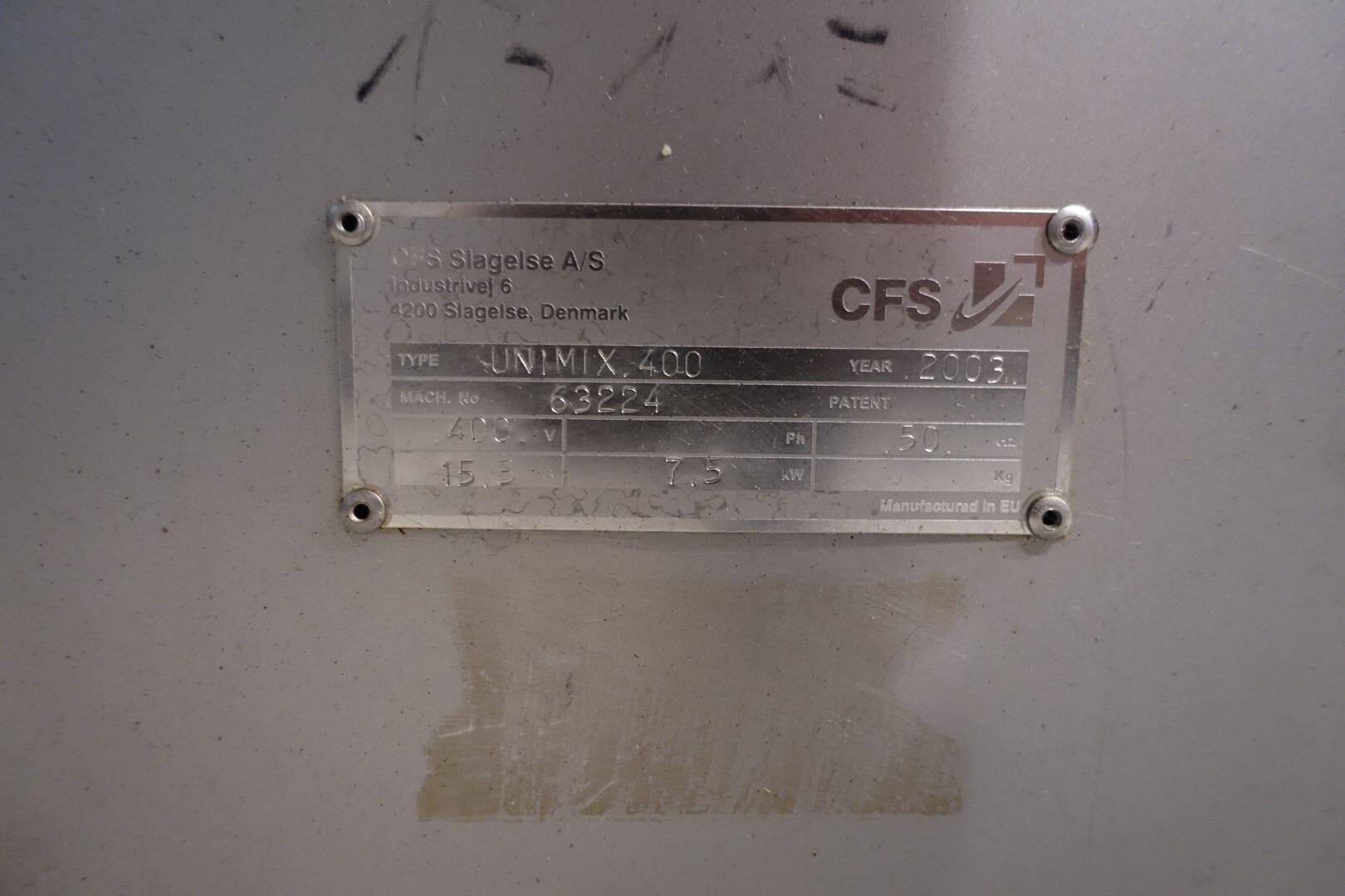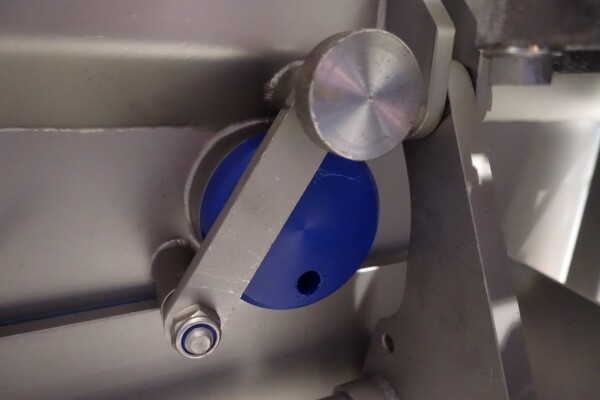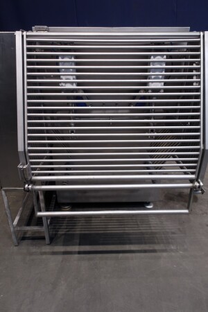Peddle mixer with 2 axles. Horizontal. Single jacketed. Manual cleanable. Outlet slide, pneumatic controlled. Framework cover. Cover manual tiltable. 2x New independent motors: 7,5 kW - 400 V - 15,5 A - 50 Hz - 965/1450 rpm. Reduction box: i = 40. N2: 24/36 rpm. Dimensions product room: 80 x 90 x 60 cm. Control panel with PLC and Allen-Bradley PanelView 550 operation panel. Total outside dimensions 190 x 185 x 182 cm.
