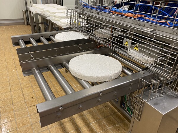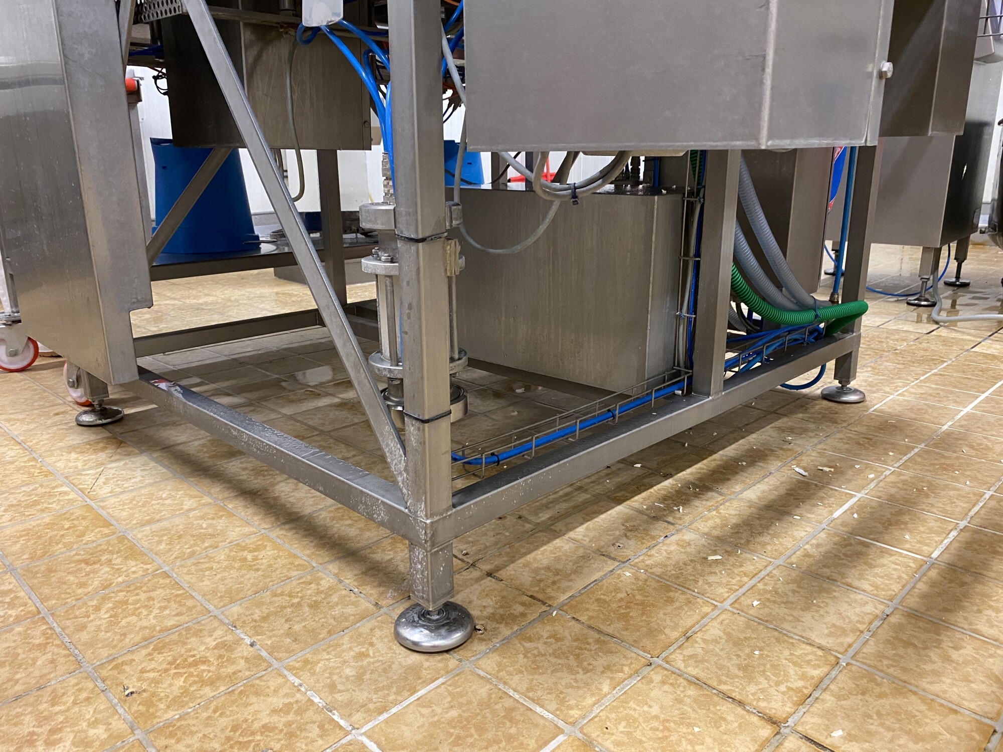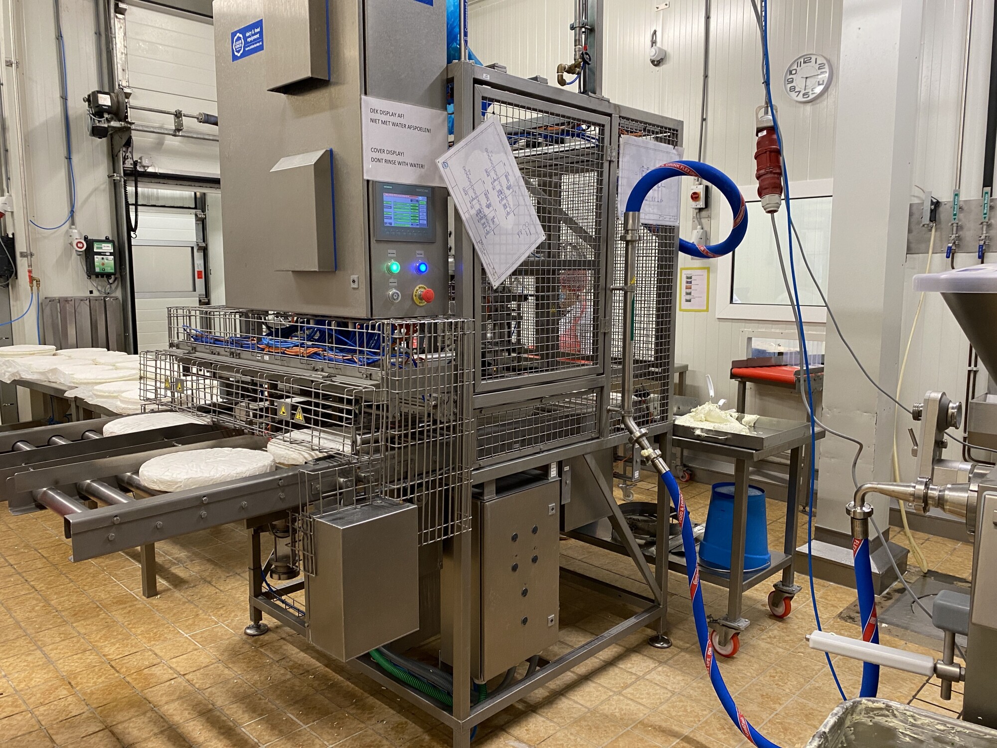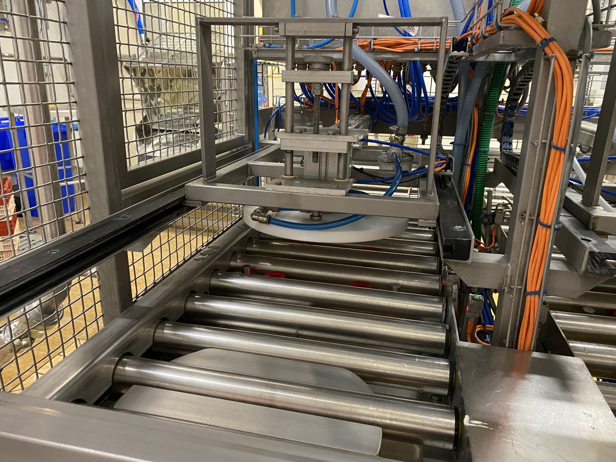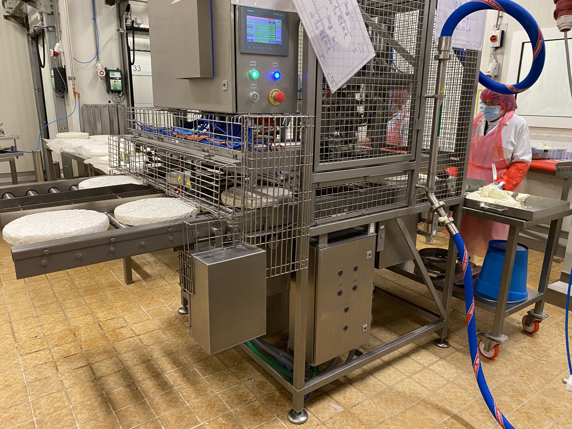 Unique design machine for making stuffed cheese from a standard semi soft cheese like Brie, Camembert or Columbier etc. A round cheese with a diameter of around 330 mm and with a weight of around 3-5 kg are cut, stuffed with a pumpable cream cheese. Working principle: inlet by a roller conveyor, then cut the cheese in half horizontally. Pick-up the top of part of the cheese and lift it. Then the underside of the brie is stuffed with a layer of a viscose product like a pumpable cream cheese or processed cheese. The last step is to place the upperpart of the cheese back on top. Ideal for ‘bites’ like products with different cheeses mixed. Stand-alone unit. Including SS safety fences, CE marked. Including Siemens S7 and HMI control panel. A video of the machine in production is on our website.