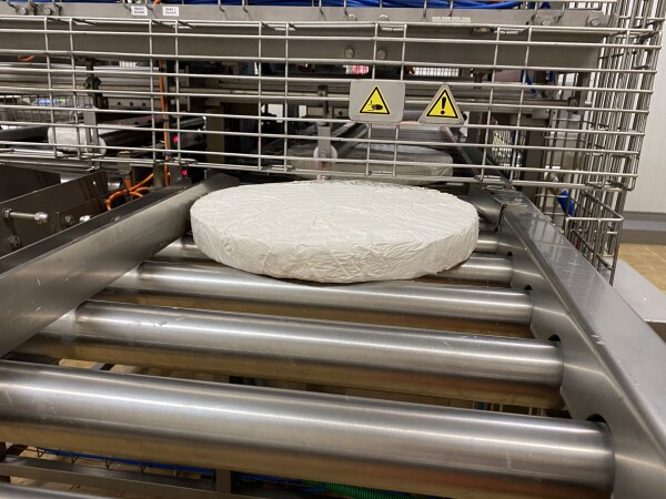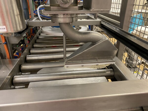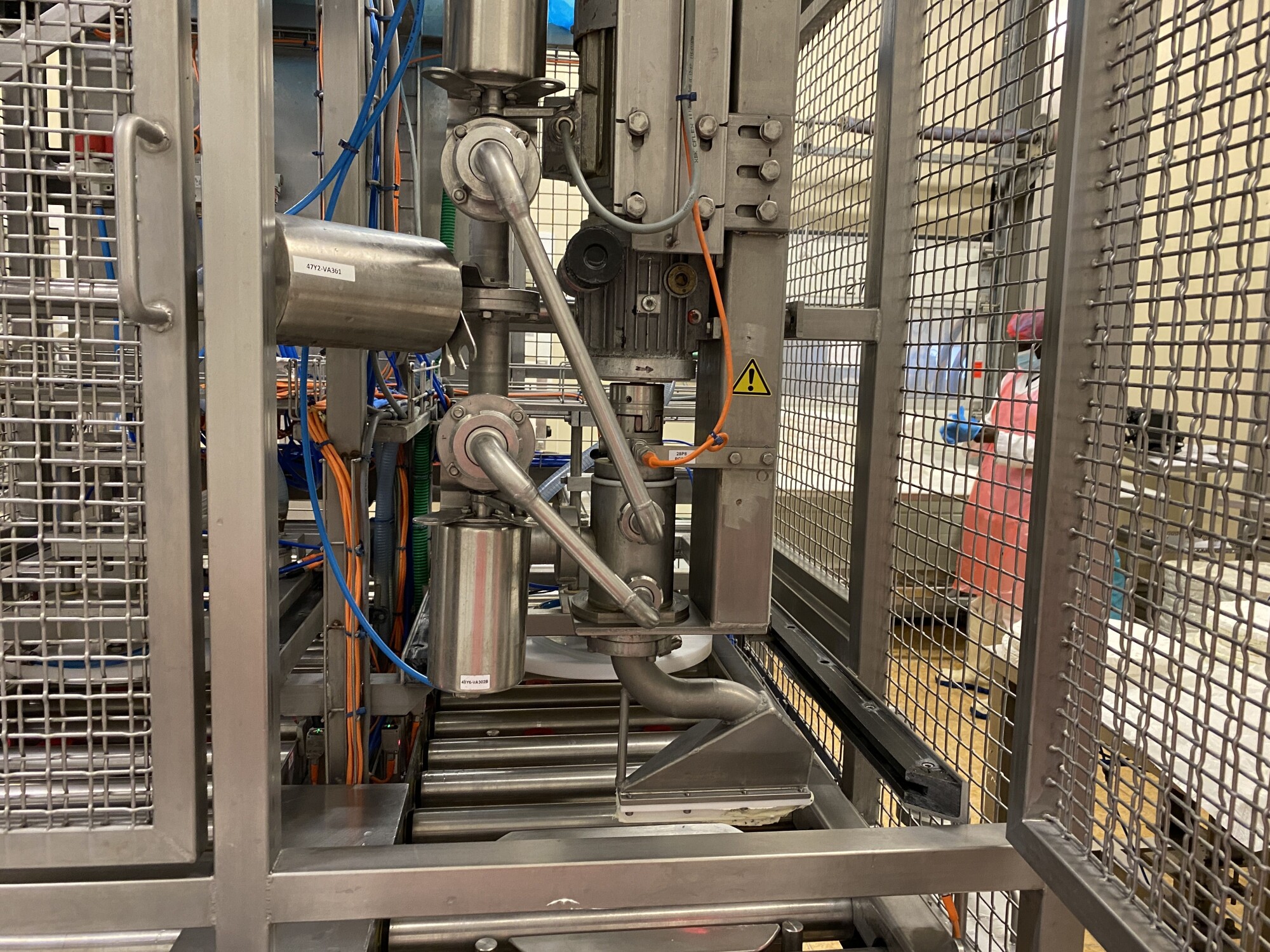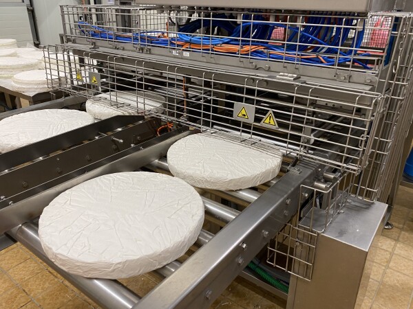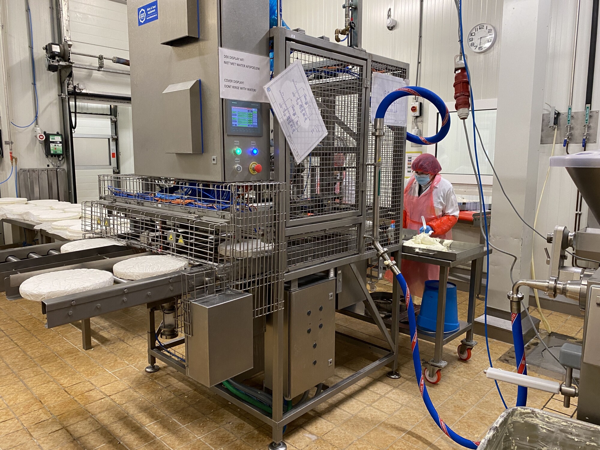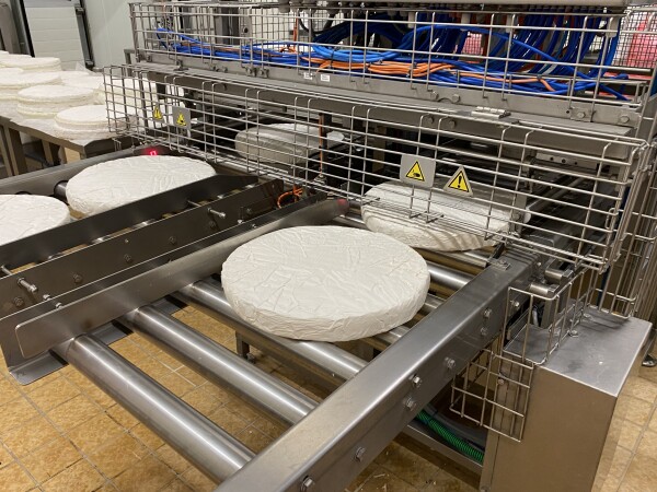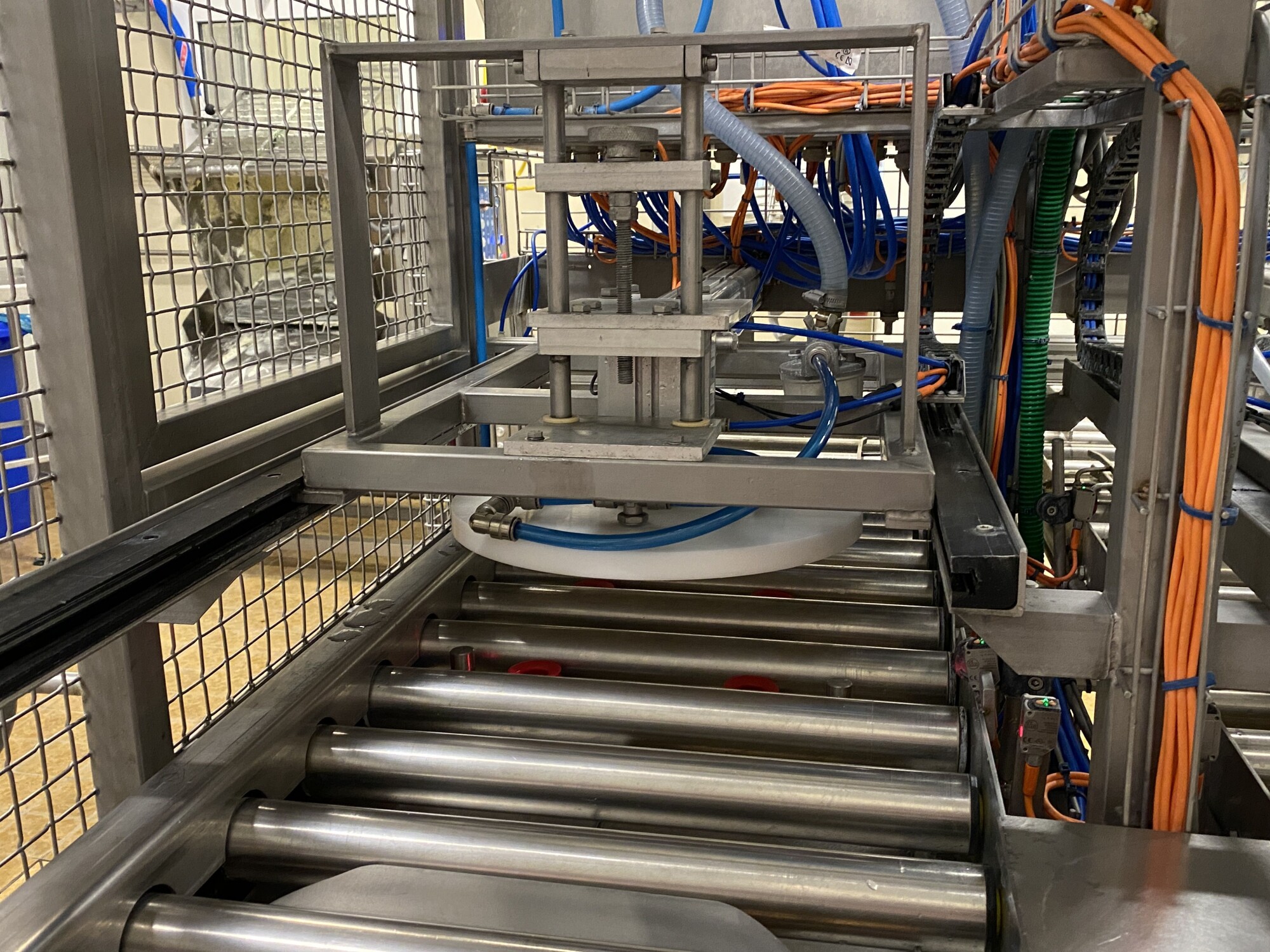 Unique design machine for making stuffed cheese from a standard semi soft cheese like Brie, Camembert or Columbier etc. A round cheese with a diameter of around 330 mm and with a weight of around 3-5 kg are cut, stuffed with a pumpable cream cheese. Working principle: inlet by a roller conveyor, then cut the cheese in half horizontally. Pick-up the top of part of the cheese and lift it. Then the underside of the brie is stuffed with a layer of a viscose product like a pumpable cream cheese or processed cheese. The last step is to place the upperpart of the cheese back on top. Ideal for ‘bites’ like products with different cheeses mixed. Stand-alone unit. Including SS safety fences, CE marked. Including Siemens S7 and HMI control panel. A video of the machine in production is on our website.