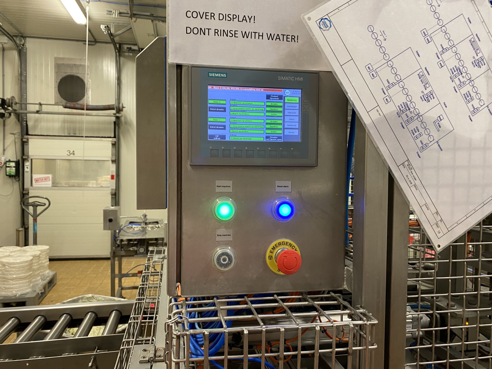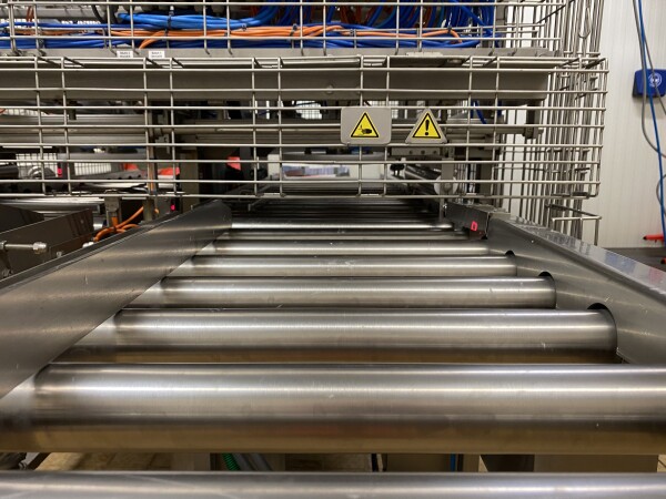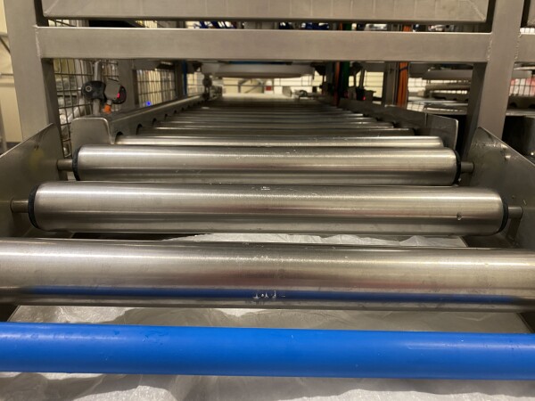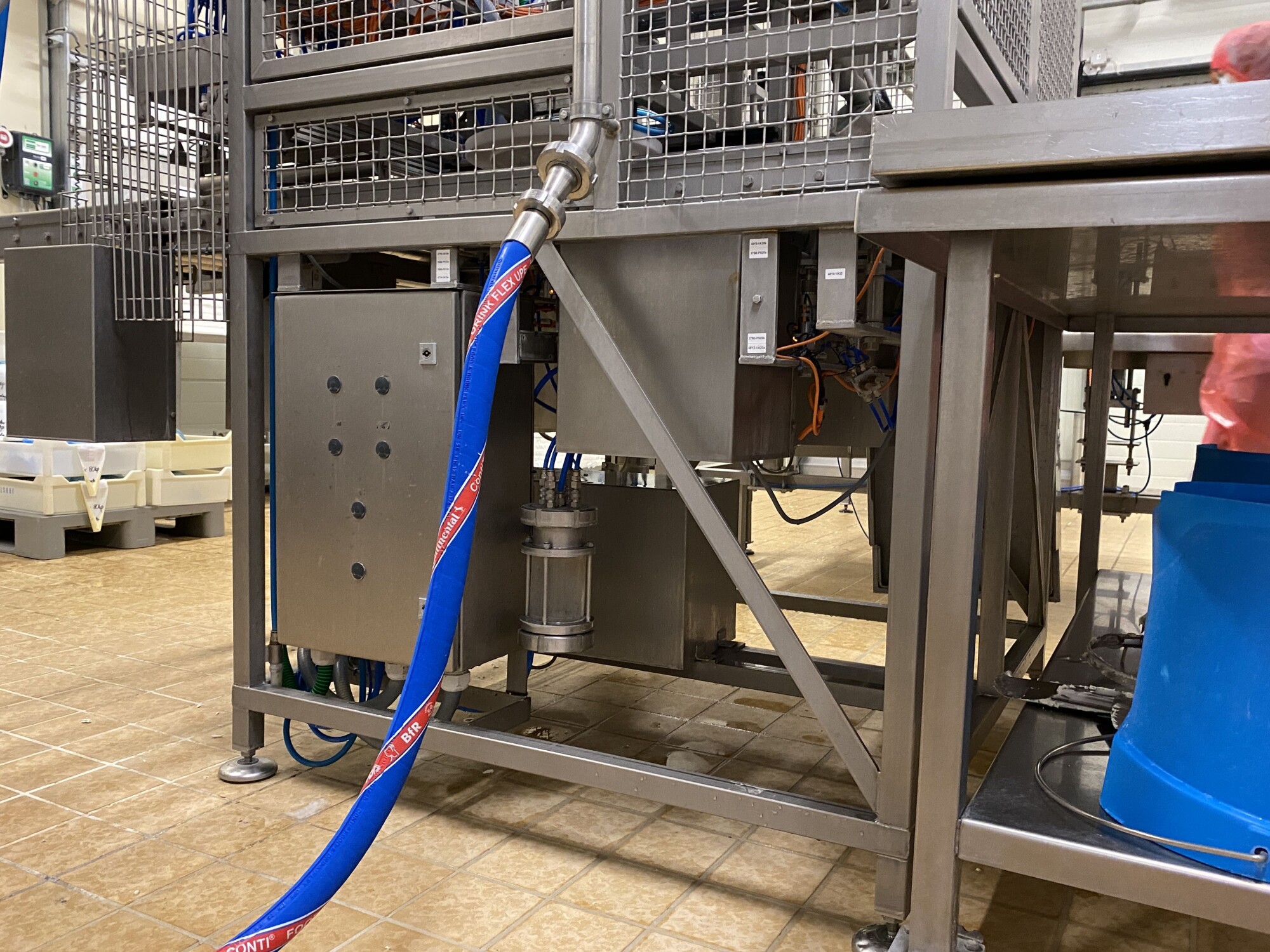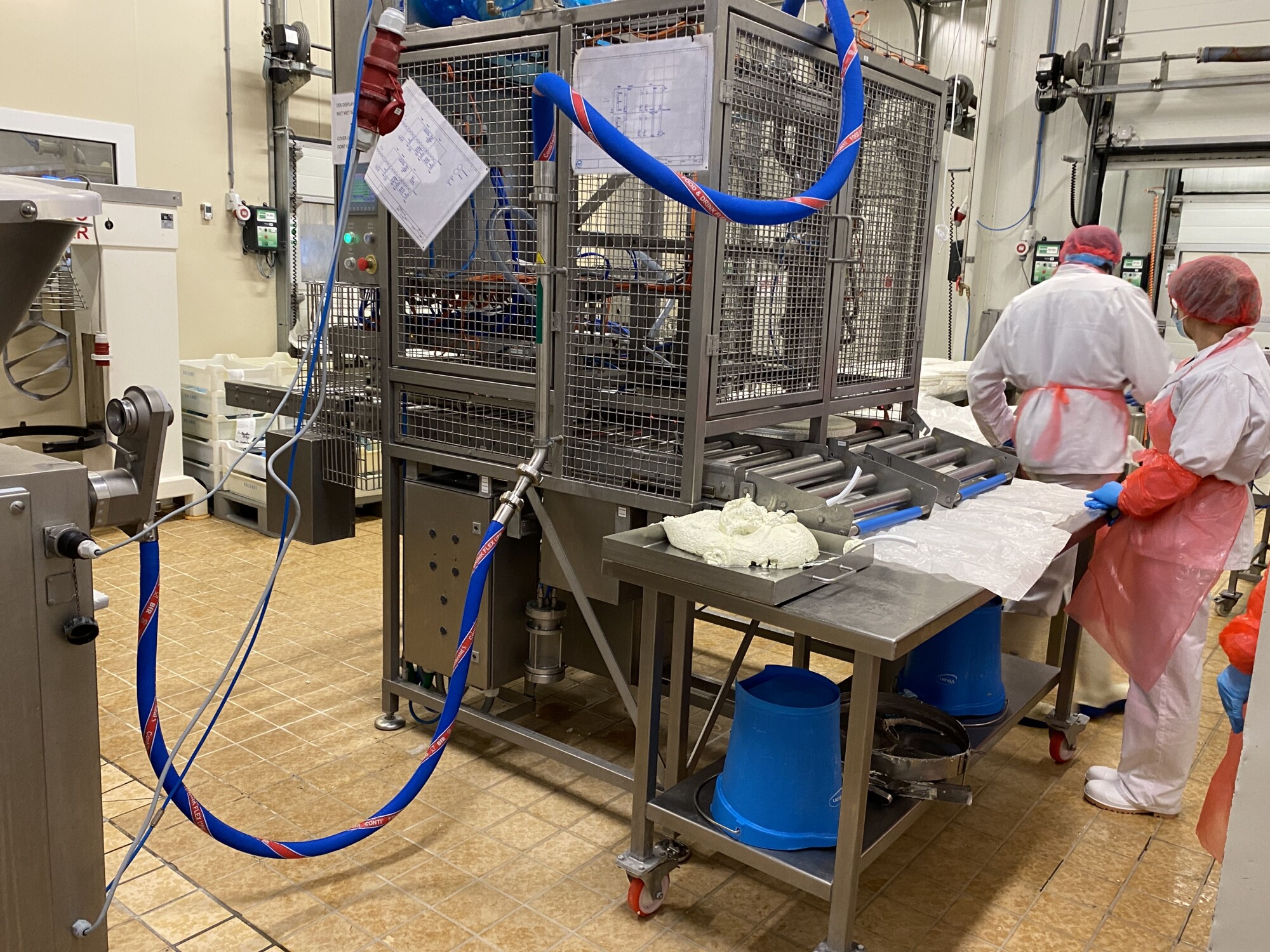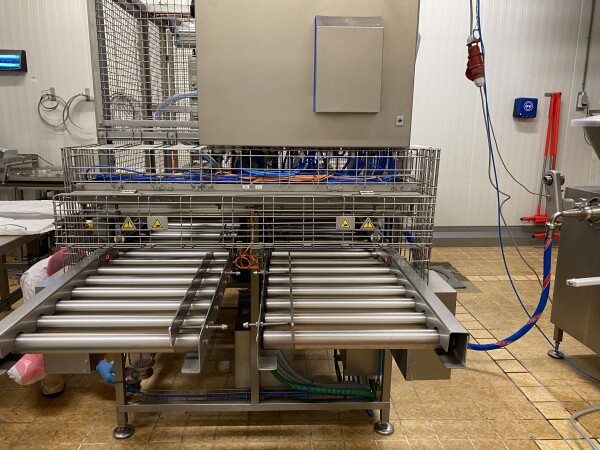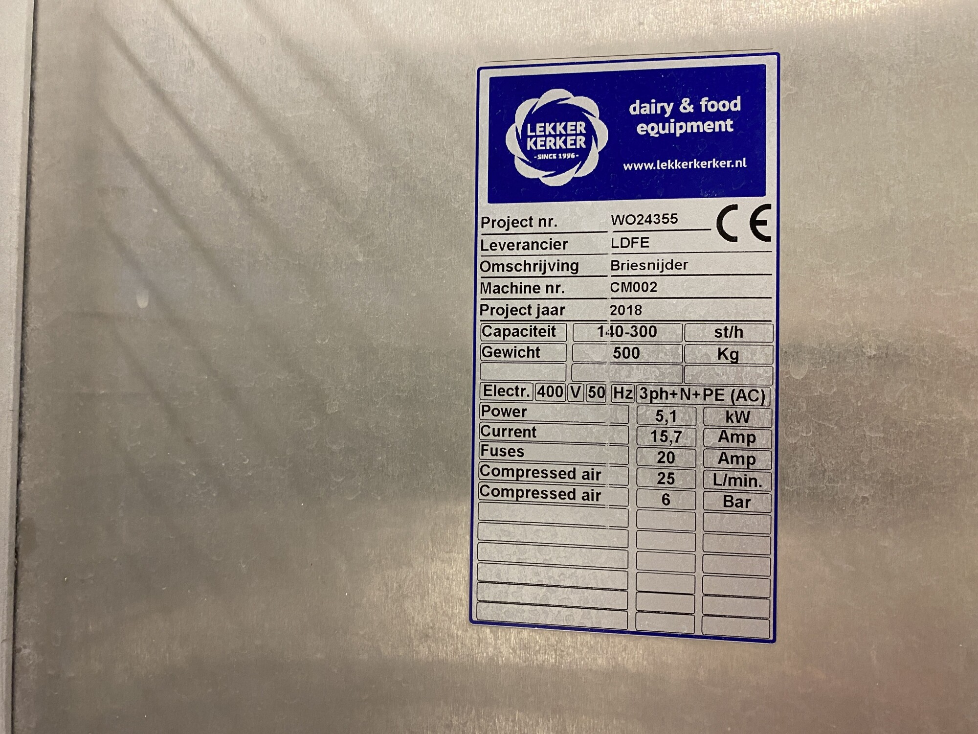 Unique design machine for making stuffed cheese from a standard semi soft cheese like Brie, Camembert or Columbier etc. A round cheese with a diameter of around 330 mm and with a weight of around 3-5 kg are cut, stuffed with a pumpable cream cheese. Working principle: inlet by a roller conveyor, then cut the cheese in half horizontally. Pick-up the top of part of the cheese and lift it. Then the underside of the brie is stuffed with a layer of a viscose product like a pumpable cream cheese or processed cheese. The last step is to place the upperpart of the cheese back on top. Ideal for ‘bites’ like products with different cheeses mixed. Stand-alone unit. Including SS safety fences, CE marked. Including Siemens S7 and HMI control panel. A video of the machine in production is on our website.