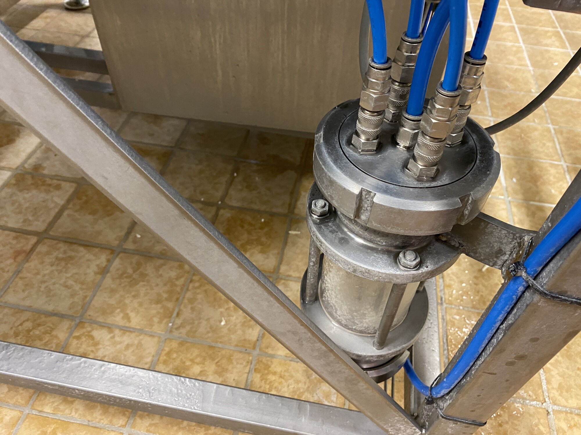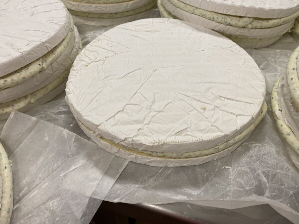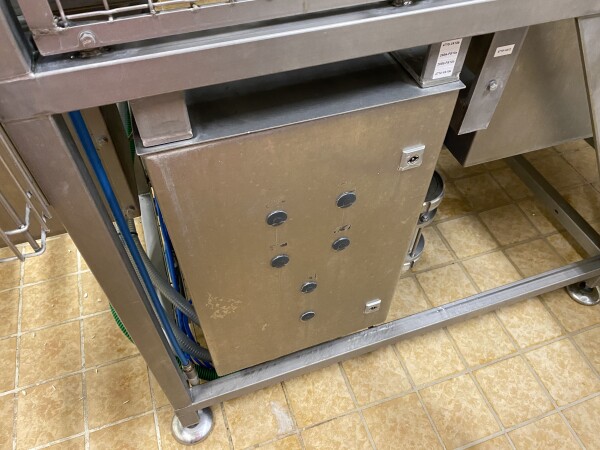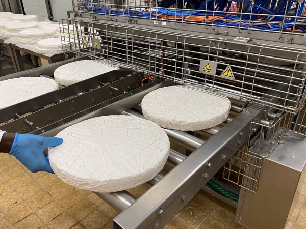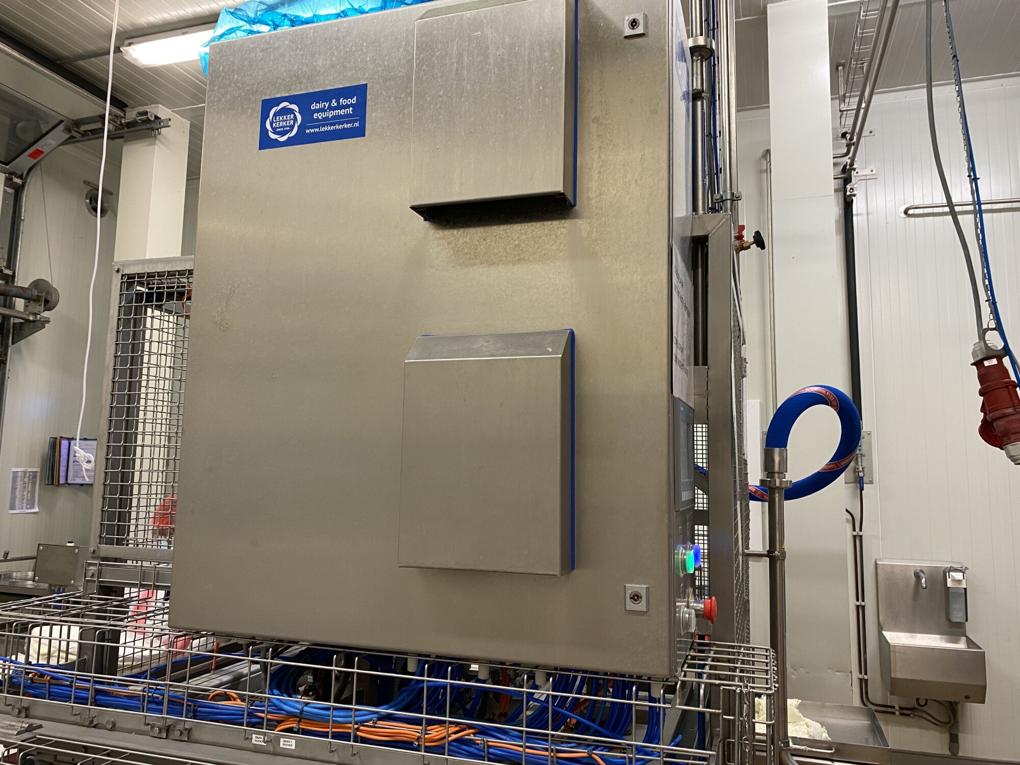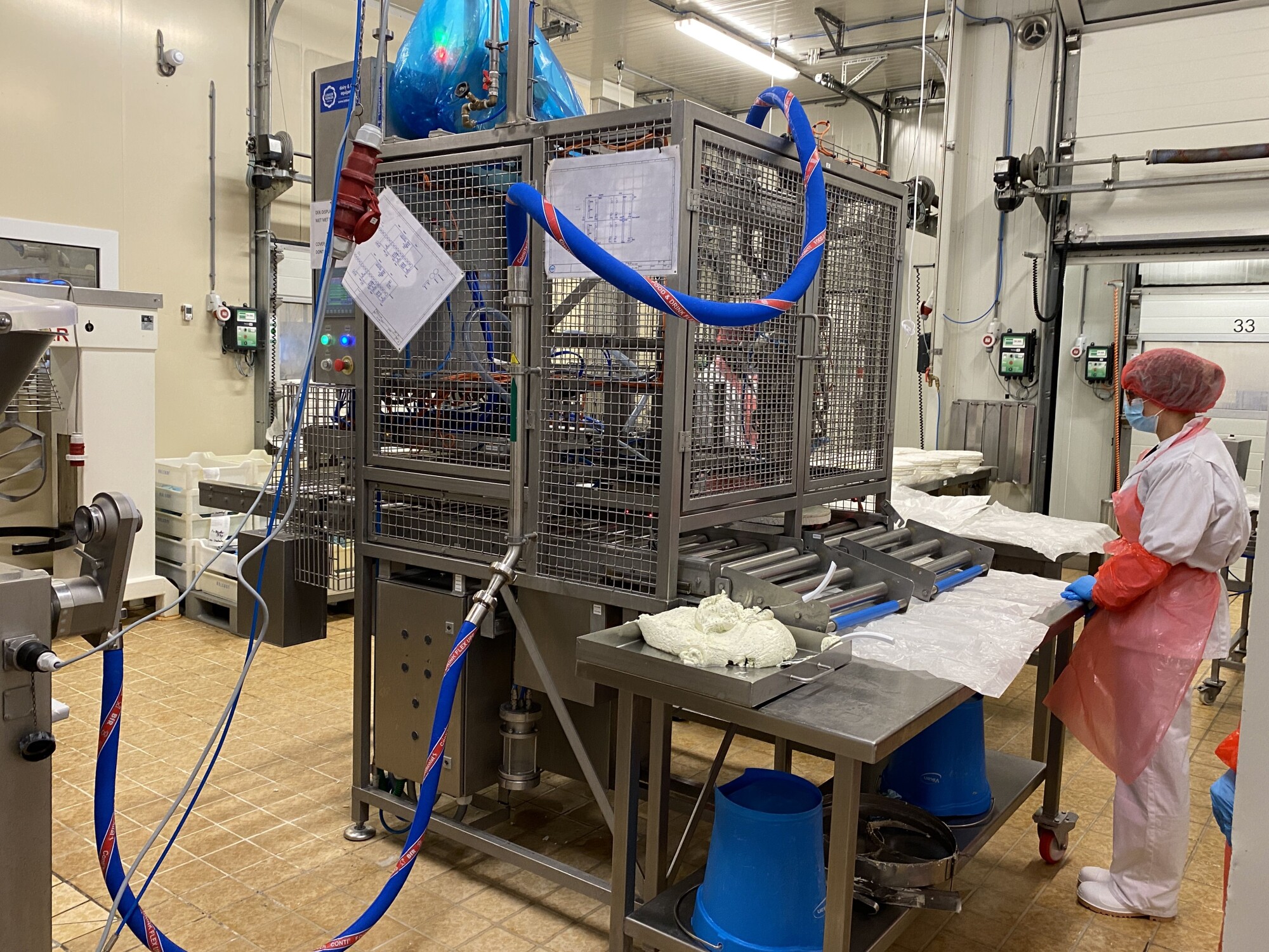 Unique design machine for making stuffed cheese from a standard semi soft cheese like Brie, Camembert or Columbier etc. A round cheese with a diameter of around 330 mm and with a weight of around 3-5 kg are cut, stuffed with a pumpable cream cheese. Working principle: inlet by a roller conveyor, then cut the cheese in half horizontally. Pick-up the top of part of the cheese and lift it. Then the underside of the brie is stuffed with a layer of a viscose product like a pumpable cream cheese or processed cheese. The last step is to place the upperpart of the cheese back on top. Ideal for ‘bites’ like products with different cheeses mixed. Stand-alone unit. Including SS safety fences, CE marked. Including Siemens S7 and HMI control panel. A video of the machine in production is on our website.