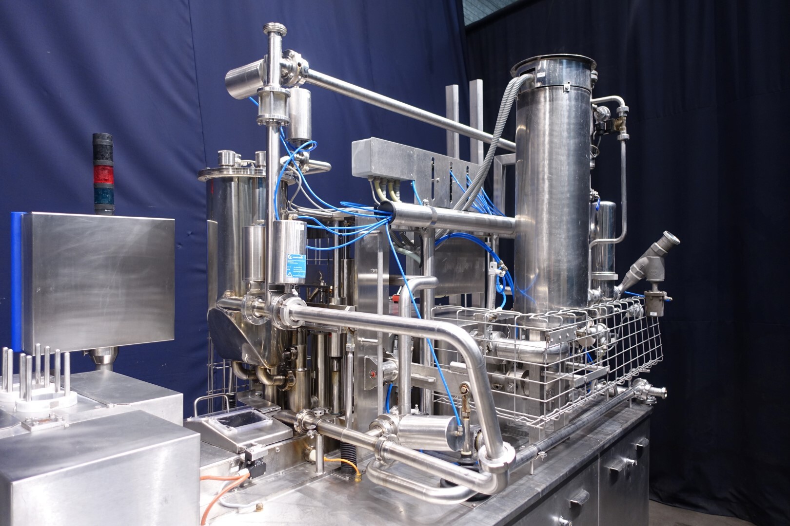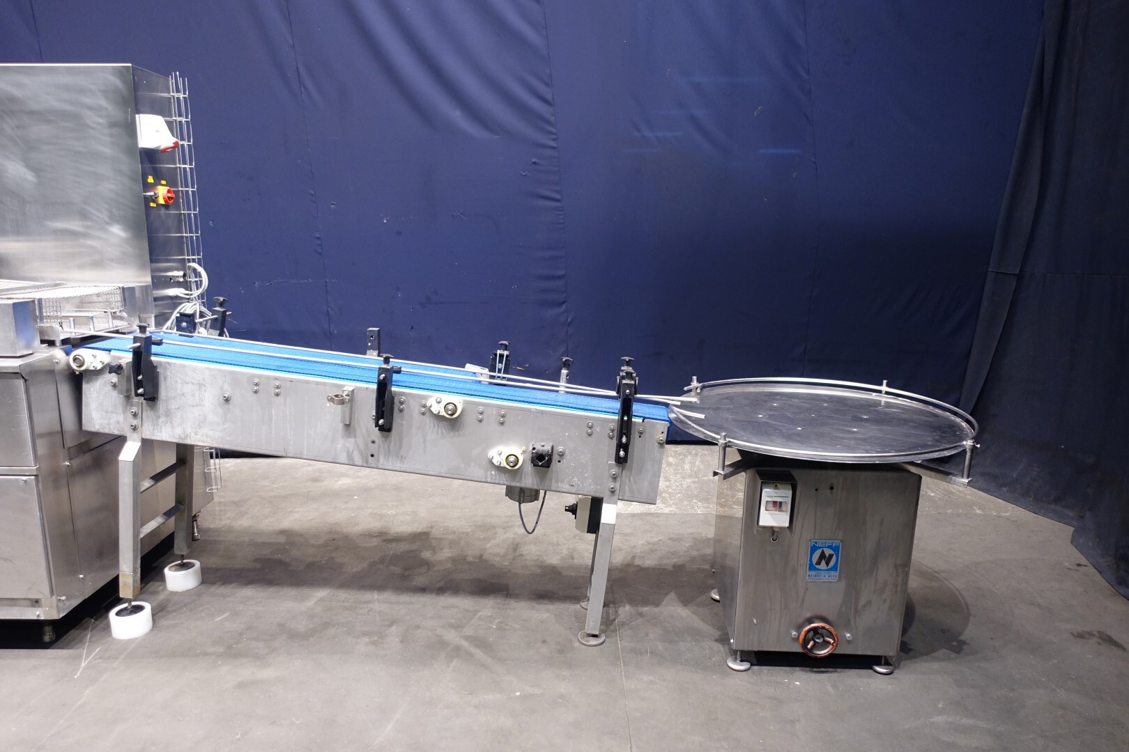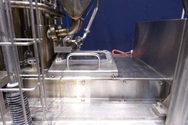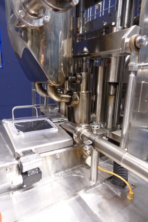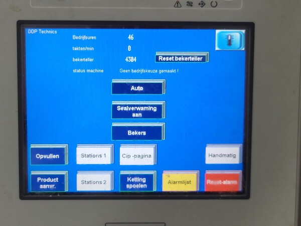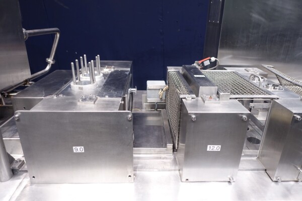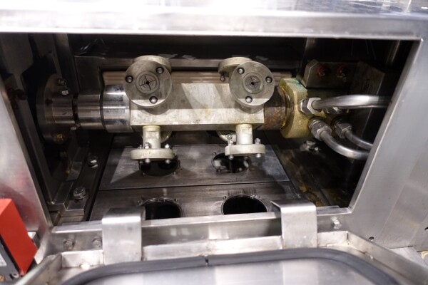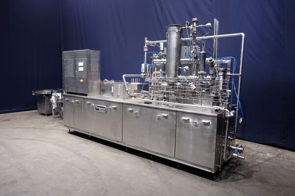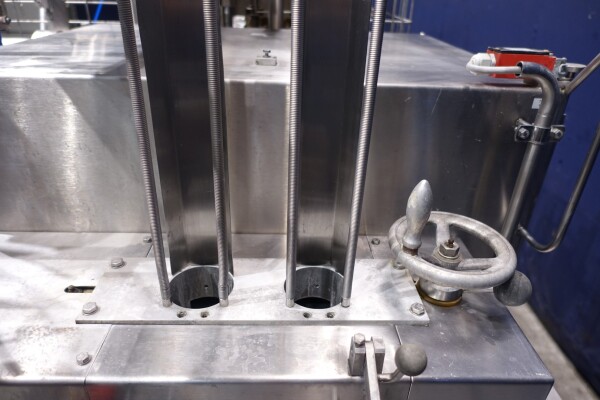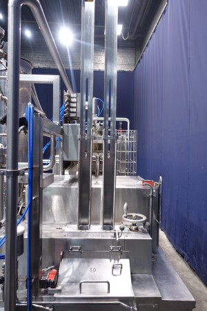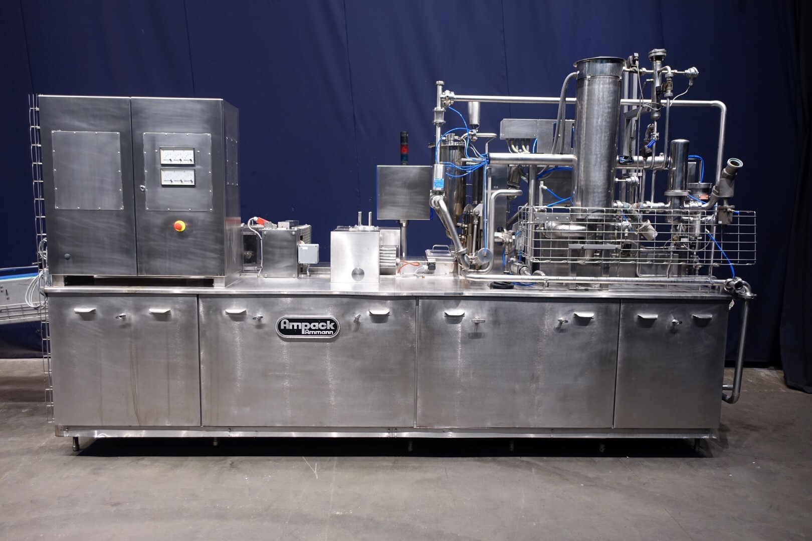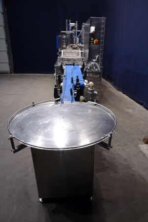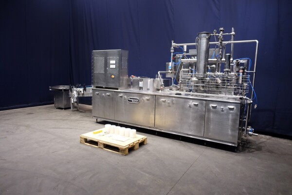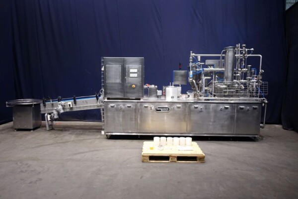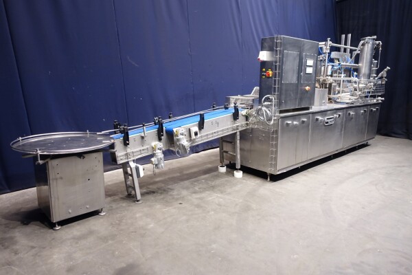 Llenadora de vasos ultra clean de 2 líneas, diámetro de vaso 75 mm. Descontaminación de vasos con H2o2, predosificador para pulpa de fruta en el fondo del vaso de 10 a 50 ml, dosificador principal (100-275 ml), limpieza CIP, tapa dispensadora, descontaminación de tapas con luz infrarroja y termosellado. transportador de salida y Lazy suzan, 'mesa giratoria' para recogida en salida. Dimensiones totales: 430 x 140 x 260 cm. Peso de la máquina 3.400 kg - mesa giratoria Ø 100 cm, peso 106 kg - longitud de la cinta transportadora 210 cm, ancho total 35 cm, peso 140 kg. Nuevo panel de control con nuevo PLC Hitachi y HMI con pantalla táctil y revisión completa de la máquina, fabricado en 2010. Excluyendo soplador y bomba de retorno CIP (Pomac).