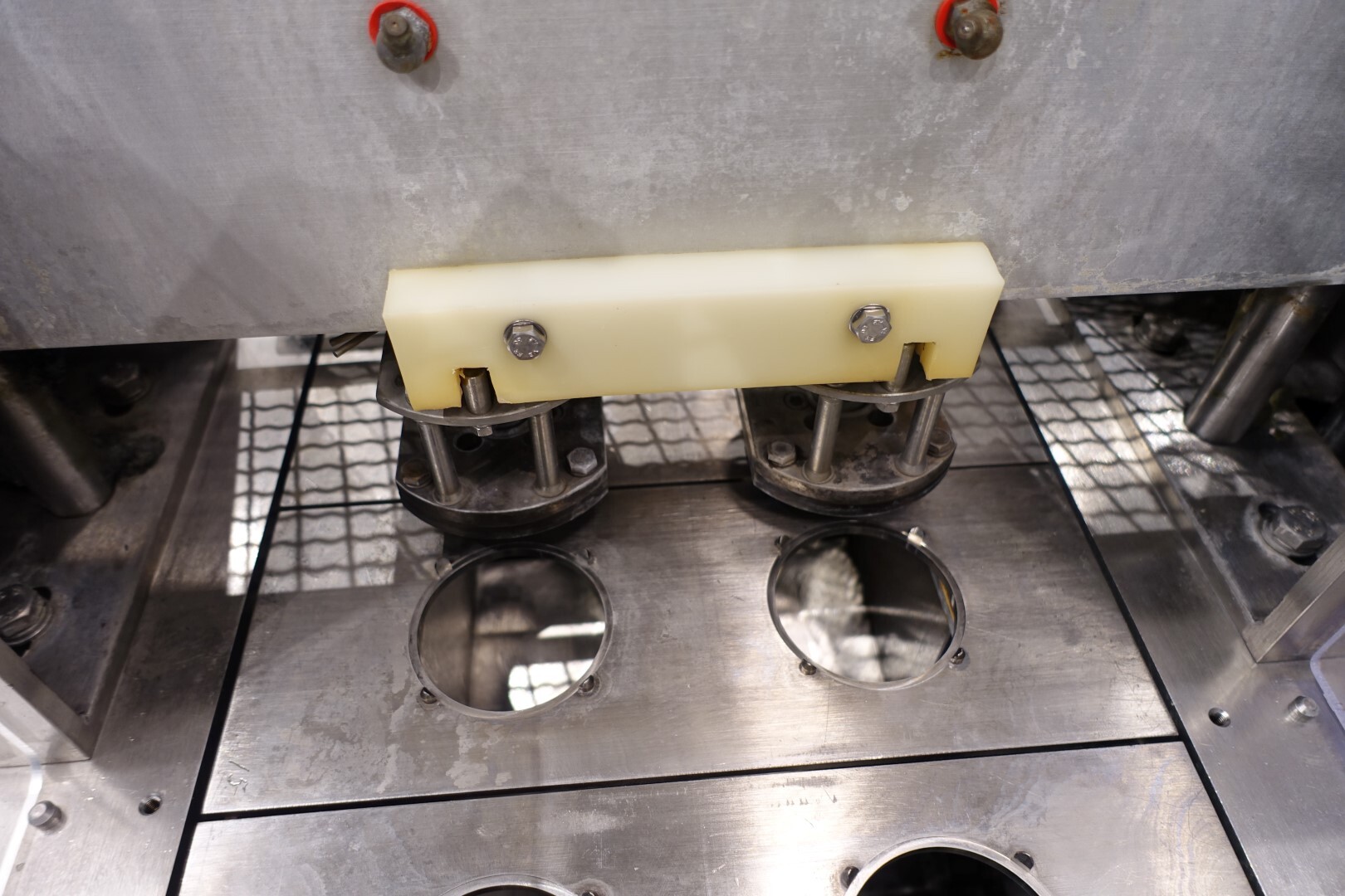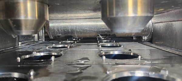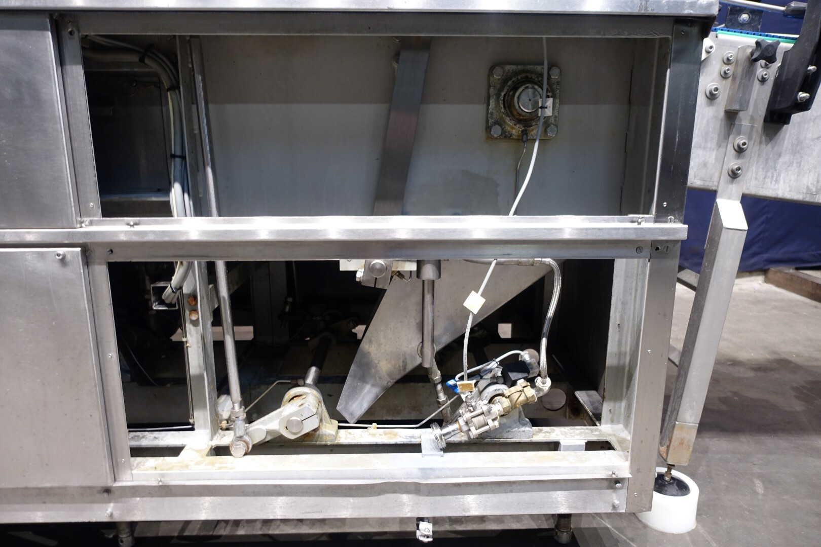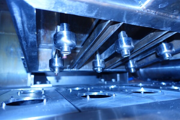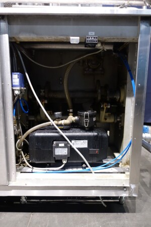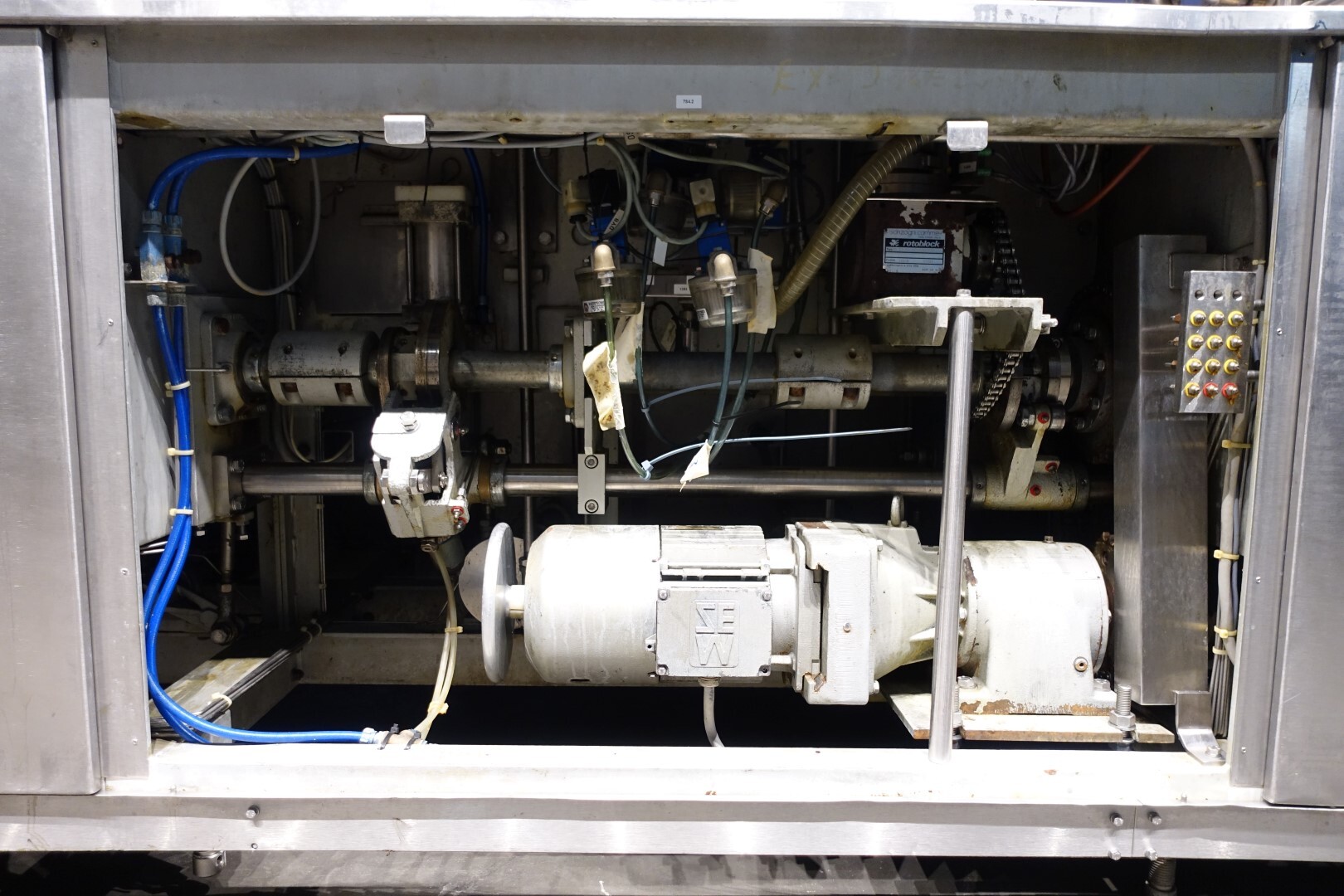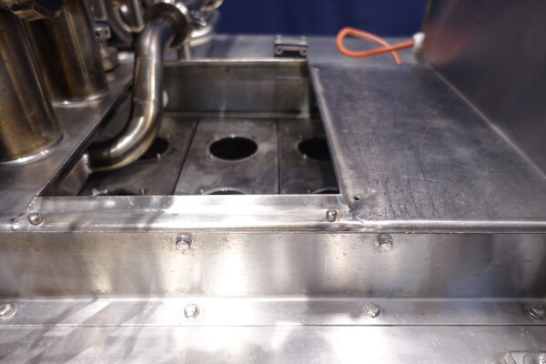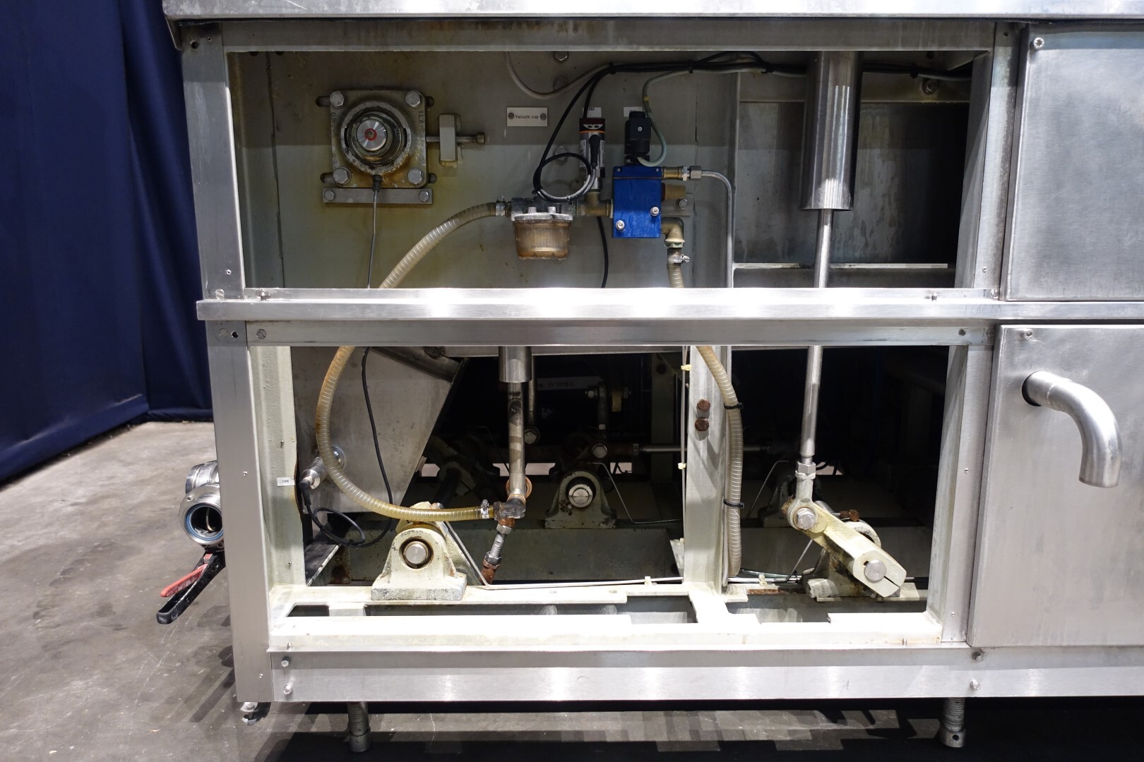 Llenadora de vasos ultra clean de 2 líneas, diámetro de vaso 75 mm. Descontaminación de vasos con H2o2, predosificador para pulpa de fruta en el fondo del vaso de 10 a 50 ml, dosificador principal (100-275 ml), limpieza CIP, tapa dispensadora, descontaminación de tapas con luz infrarroja y termosellado. transportador de salida y Lazy suzan, 'mesa giratoria' para recogida en salida. Dimensiones totales: 430 x 140 x 260 cm. Peso de la máquina 3.400 kg - mesa giratoria Ø 100 cm, peso 106 kg - longitud de la cinta transportadora 210 cm, ancho total 35 cm, peso 140 kg. Nuevo panel de control con nuevo PLC Hitachi y HMI con pantalla táctil y revisión completa de la máquina, fabricado en 2010. Excluyendo soplador y bomba de retorno CIP (Pomac).