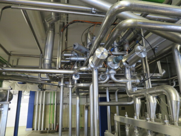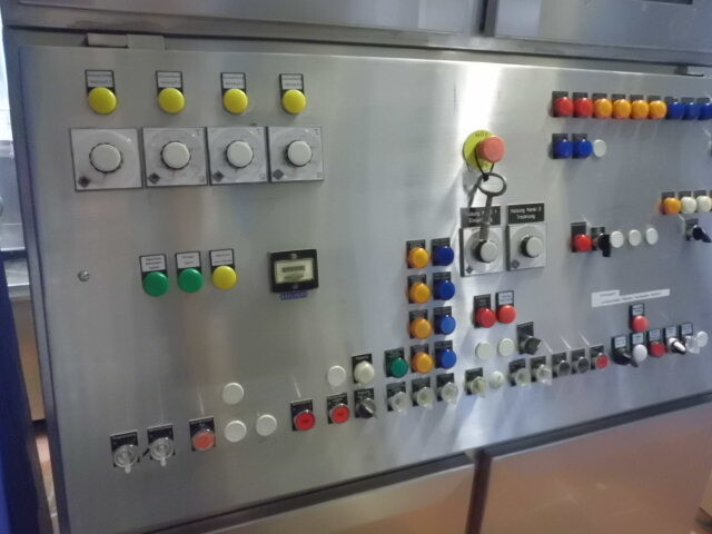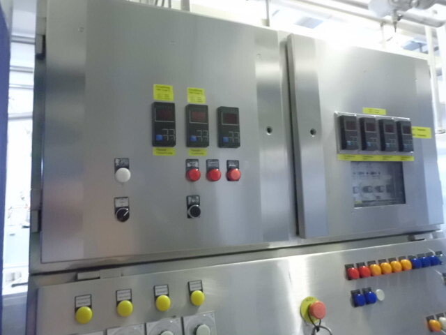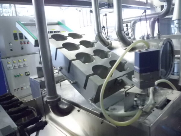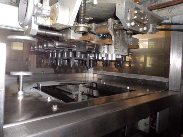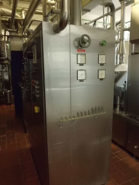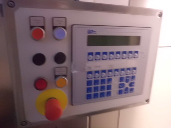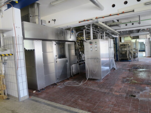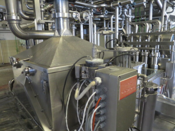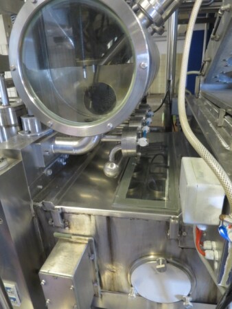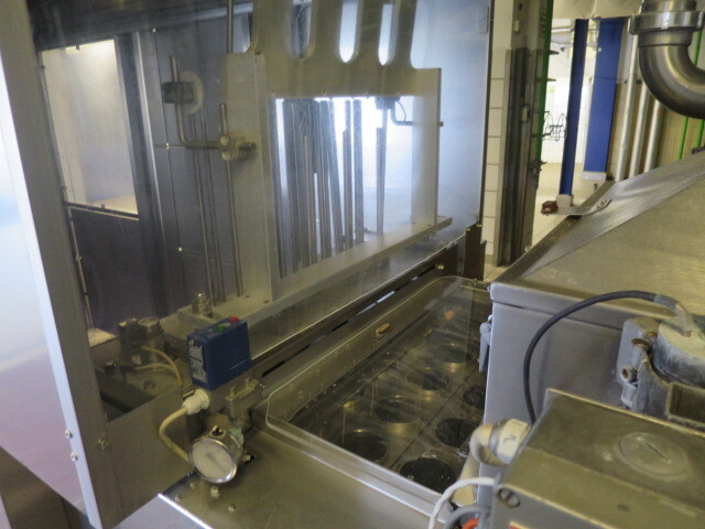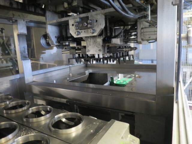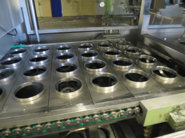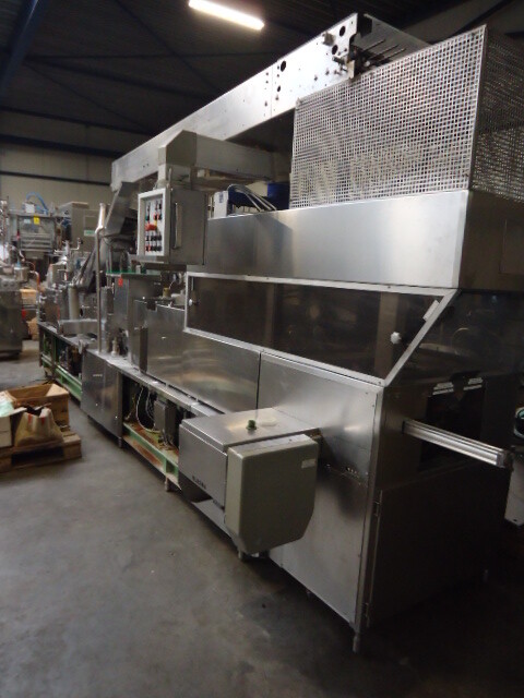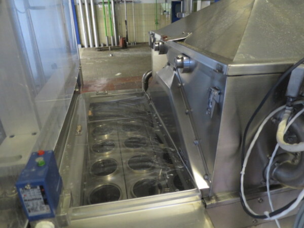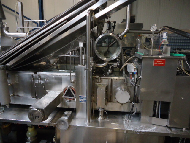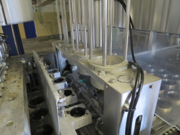 Llenadora y selladora de vasos, lineal 4 líneas con sistema de alimentación de vasos completamente automático para cajas enteras (marca: Sema, año 1999), ejecución ultra limpia con inyección de vapor y peróxido (H2O2) en 3 pasos en vasos y esterilización con luz UV en los precintos, sistema de aire estéril caja separada con filtros de aire y soplador, llenadora, con boquillas para productos finos y gruesos, estación de sellado y tapón a presión. Válvulas de alimentación con grupo de válvulas asépticas (marca: Aseptomag) independientes para cada 2 líneas. Se puede limpiar con CIP, incluido el tanque recolector de cip. Envasadora automática 3x4 en bandeja (o 2 bandejas o 6 tazas) con transportador. Máquina robusta completamente mecánica. Incluyendo panel de control y documentación.