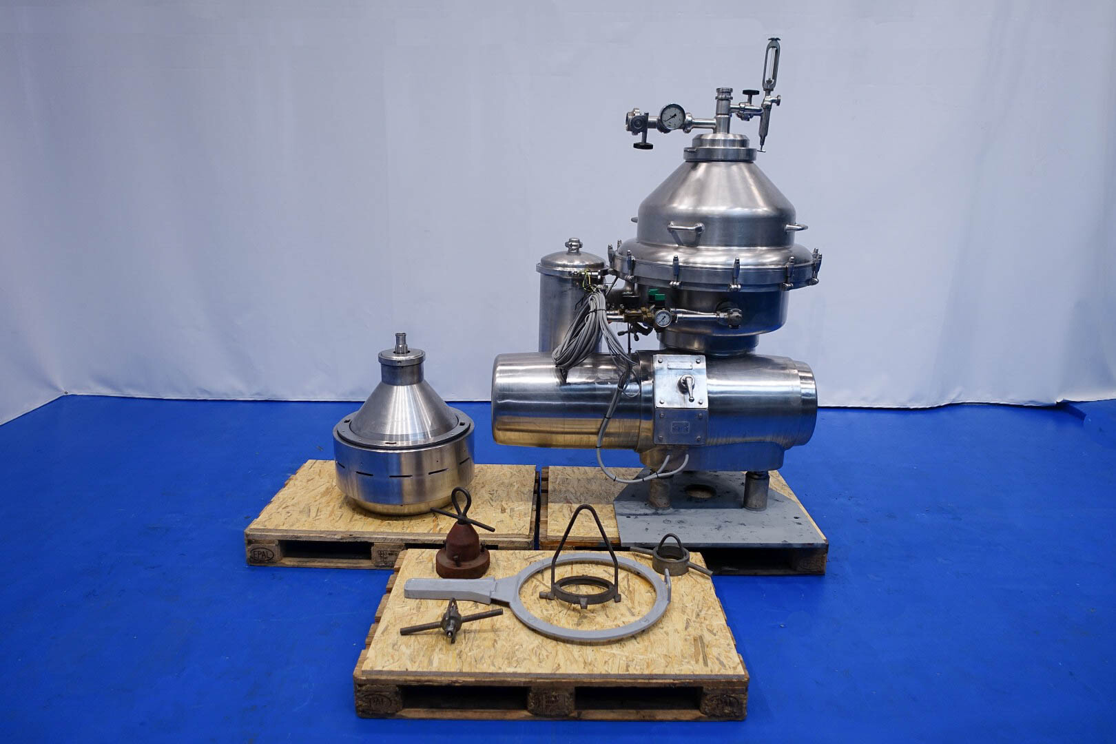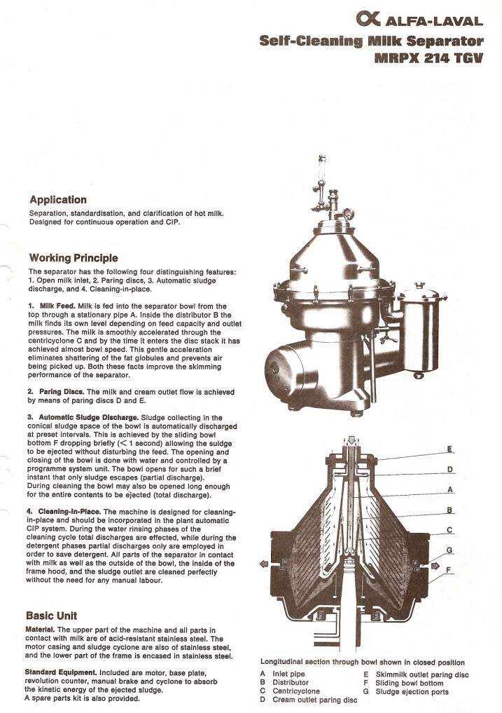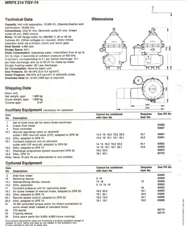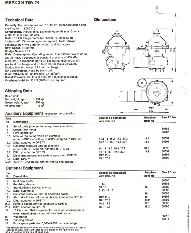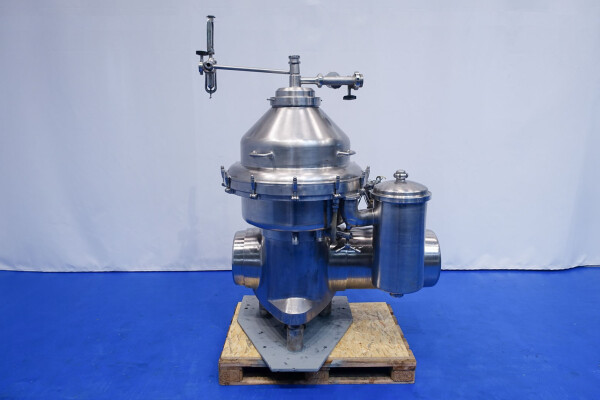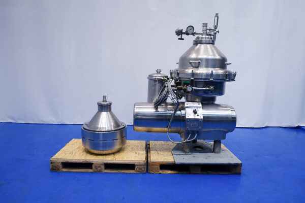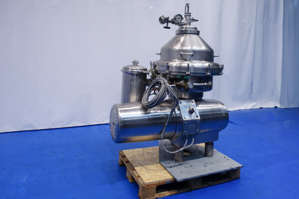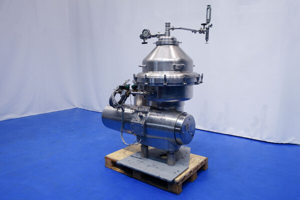 Desnatadora de leche, autolimpiable, completo con tambor, motor, tapa motor, ciclón, bastidor base, válvula manual de regulación de caudal e indicador de nata, válvula manual de contrapresión e indicador de presión en leche desnatada, válvulas de agua, parte de herramientas con llave de anilla. Velocidad de cuba: 4.450 rpm. Sin cuadro de mandos.