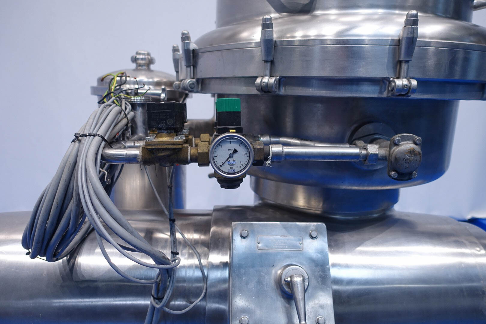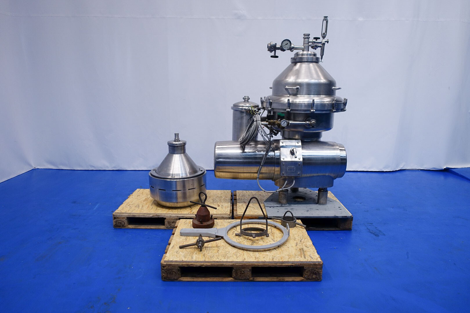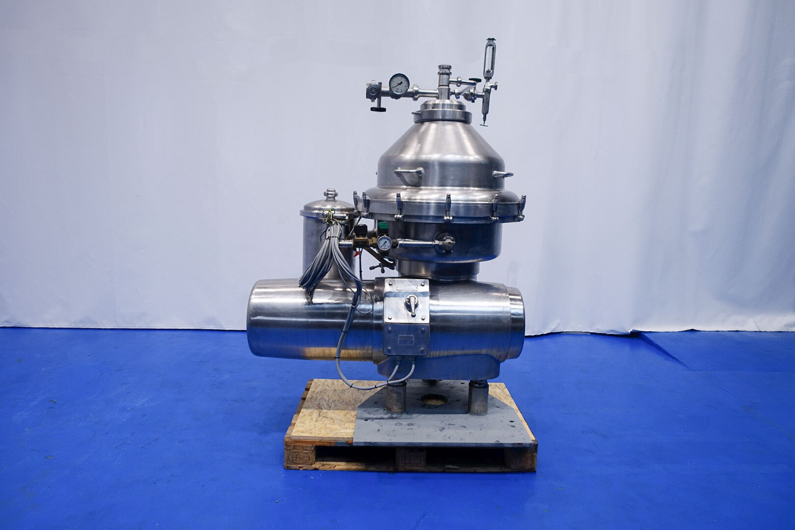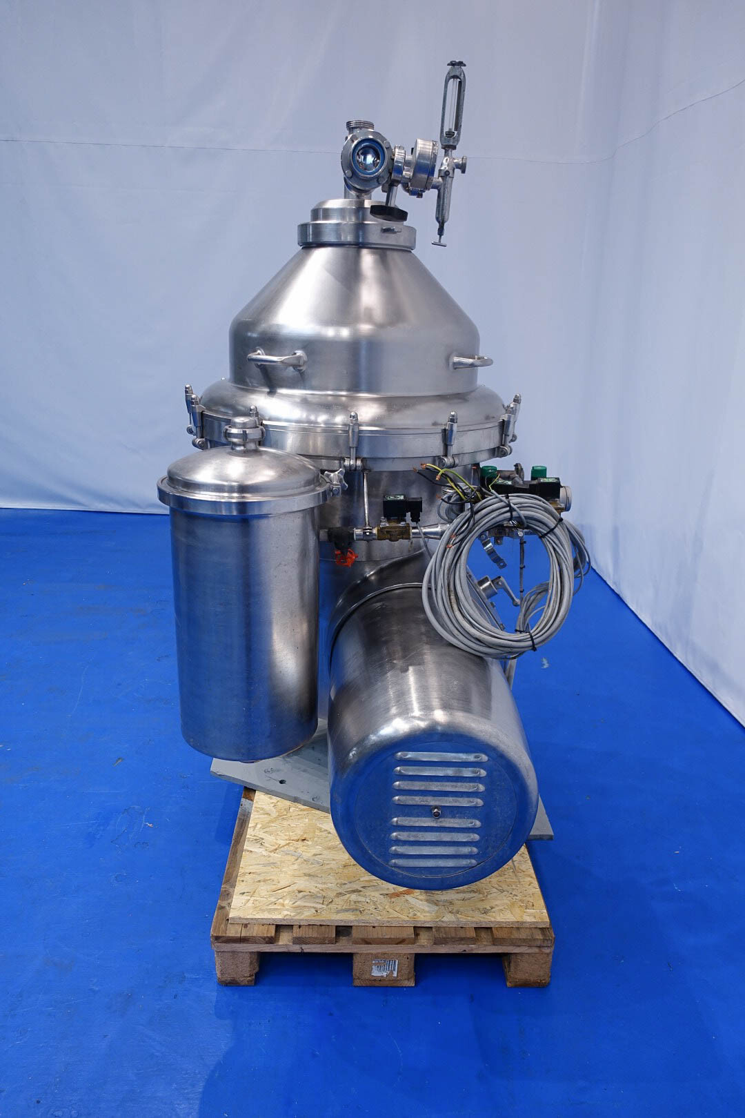 Desnatadora de leche, autolimpiable, completo con tambor, motor, tapa motor, ciclón, bastidor base, válvula manual de regulación de caudal e indicador de nata, válvula manual de contrapresión e indicador de presión en leche desnatada, válvulas de agua, parte de herramientas con llave de anilla. Velocidad de cuba: 4.450 rpm. Sin cuadro de mandos.