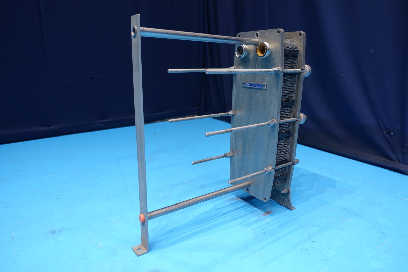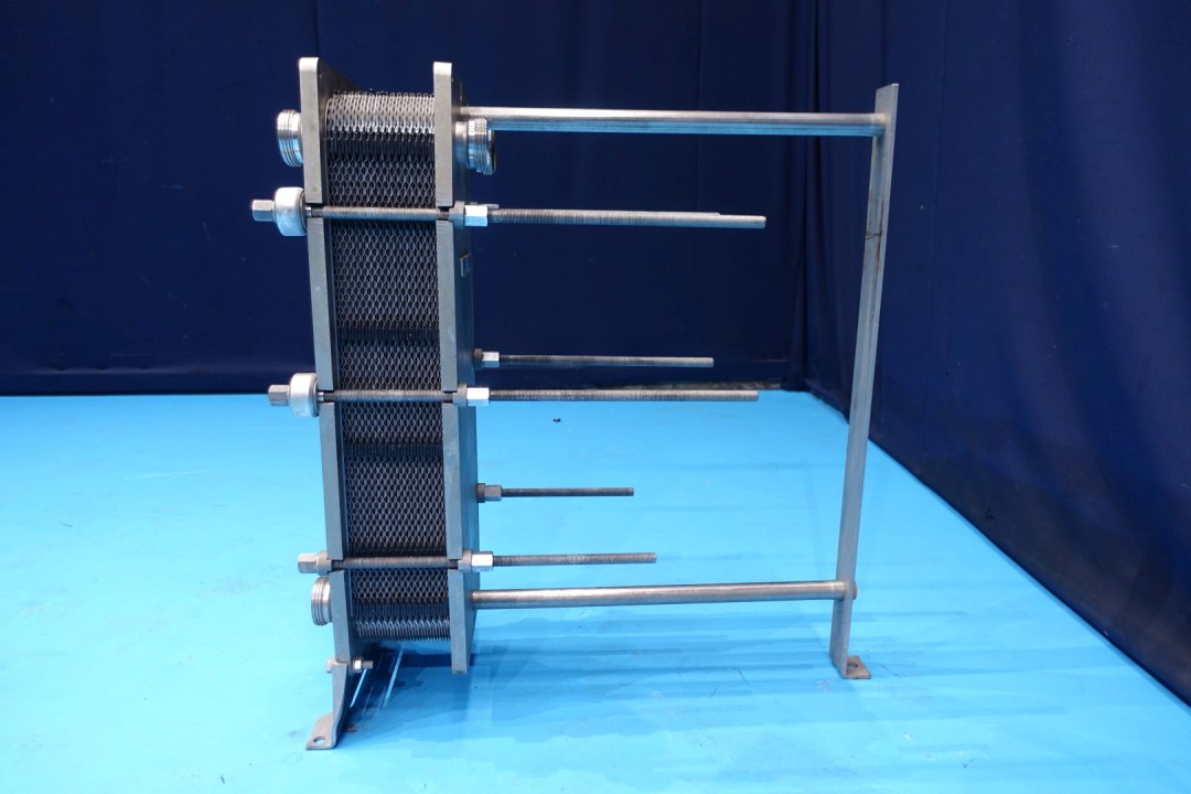 Plate heat exchanger, sanitary (PHE). Design pressure: 6,0 bar. Beam length: 74,5 cm, connections: 2" SMS. Current configuration: 1 Section: 30 plates - Connections head: 2 up/2 down, follower 2 up. Total dimensions: 84x34x91 (lxwxh) cm - weight: 122 kg.