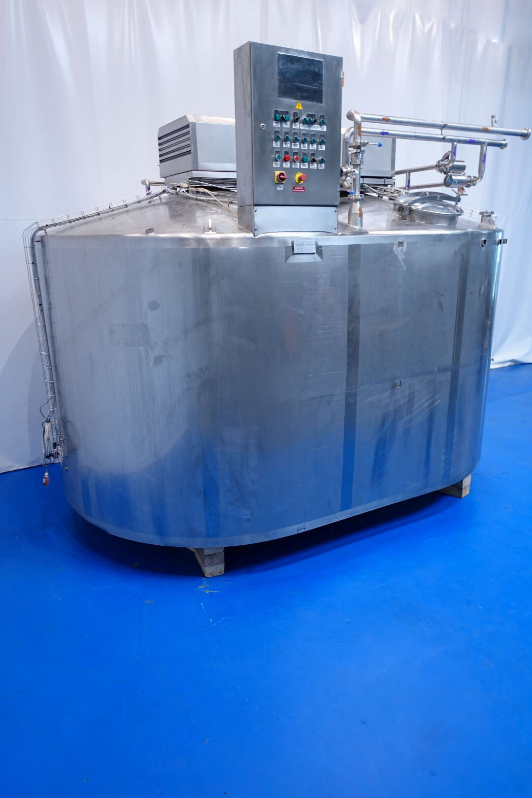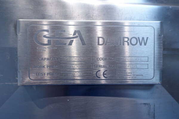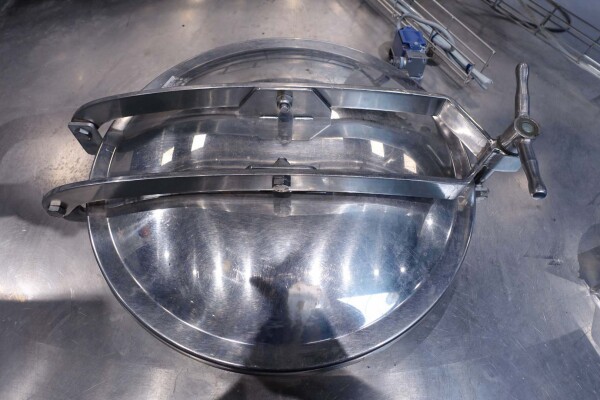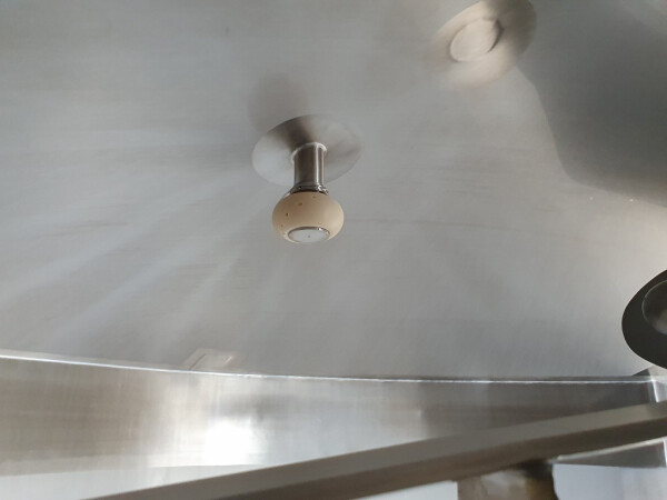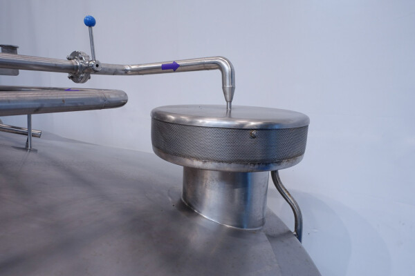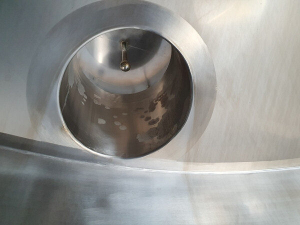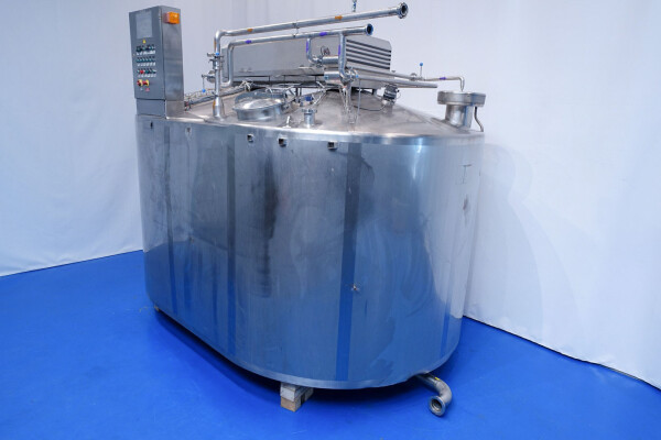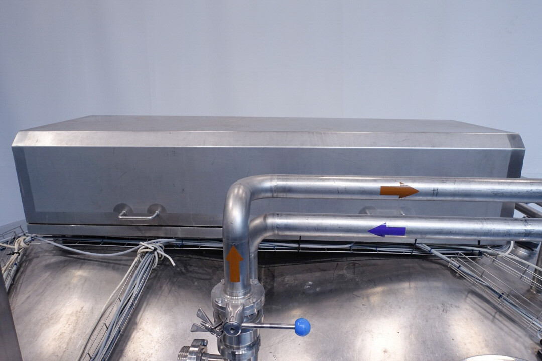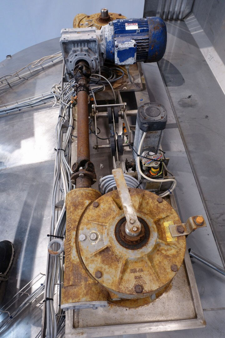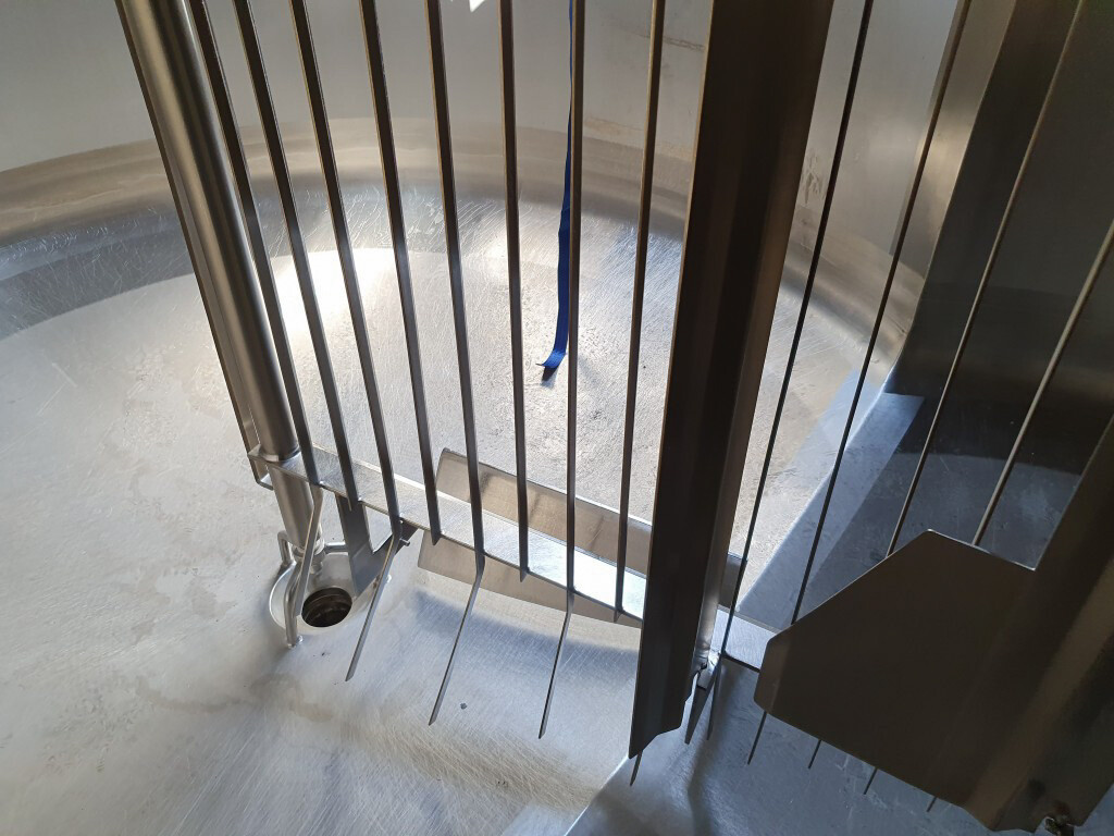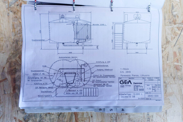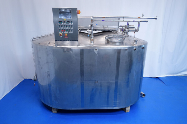 Cuve de caillage horizontale. Double paroi. Aspiration du lactosérum par le haut avec capteurs. Trou d'homme de 45 cm avec protection de sécurité et capteur. Moteur d'entraînement de 4,0 kW. Nettoyage NEP possible, équipé de deux boules de pulvérisation. Aérateur sur le dessus avec cuve NEP, tuyau NEP avec vanne papillon manuelle. Lampe d'inspection sur le dessus. Hauteur de sortie (caillé) (avec pieds) : environ 35 cm, diamètre du tuyau : environ 100 mm. Manuel d'utilisation et schéma électrique (en allemand) disponibles.