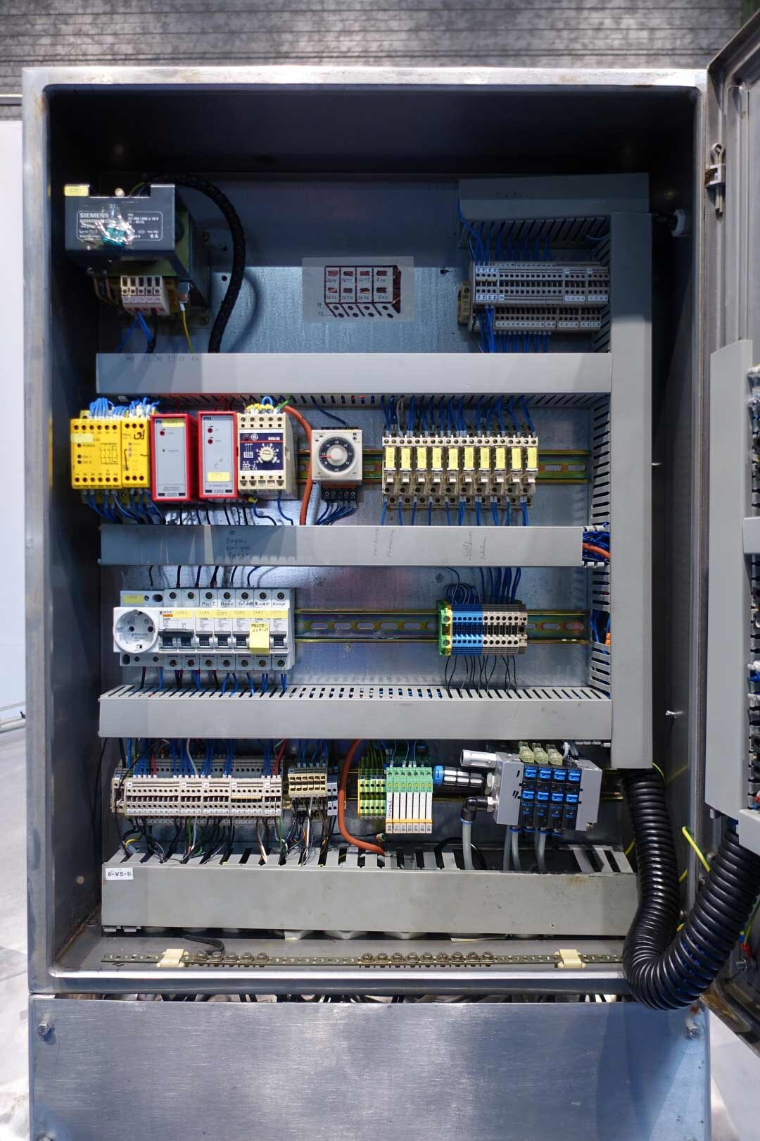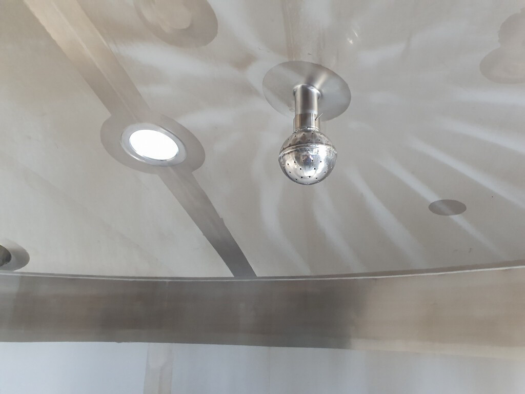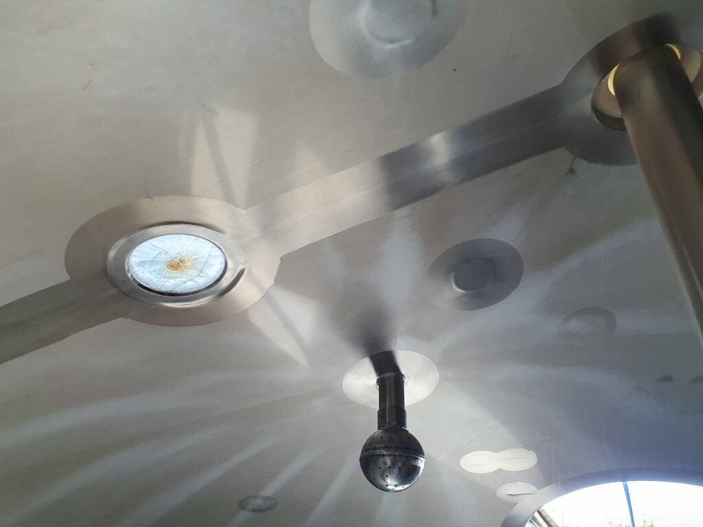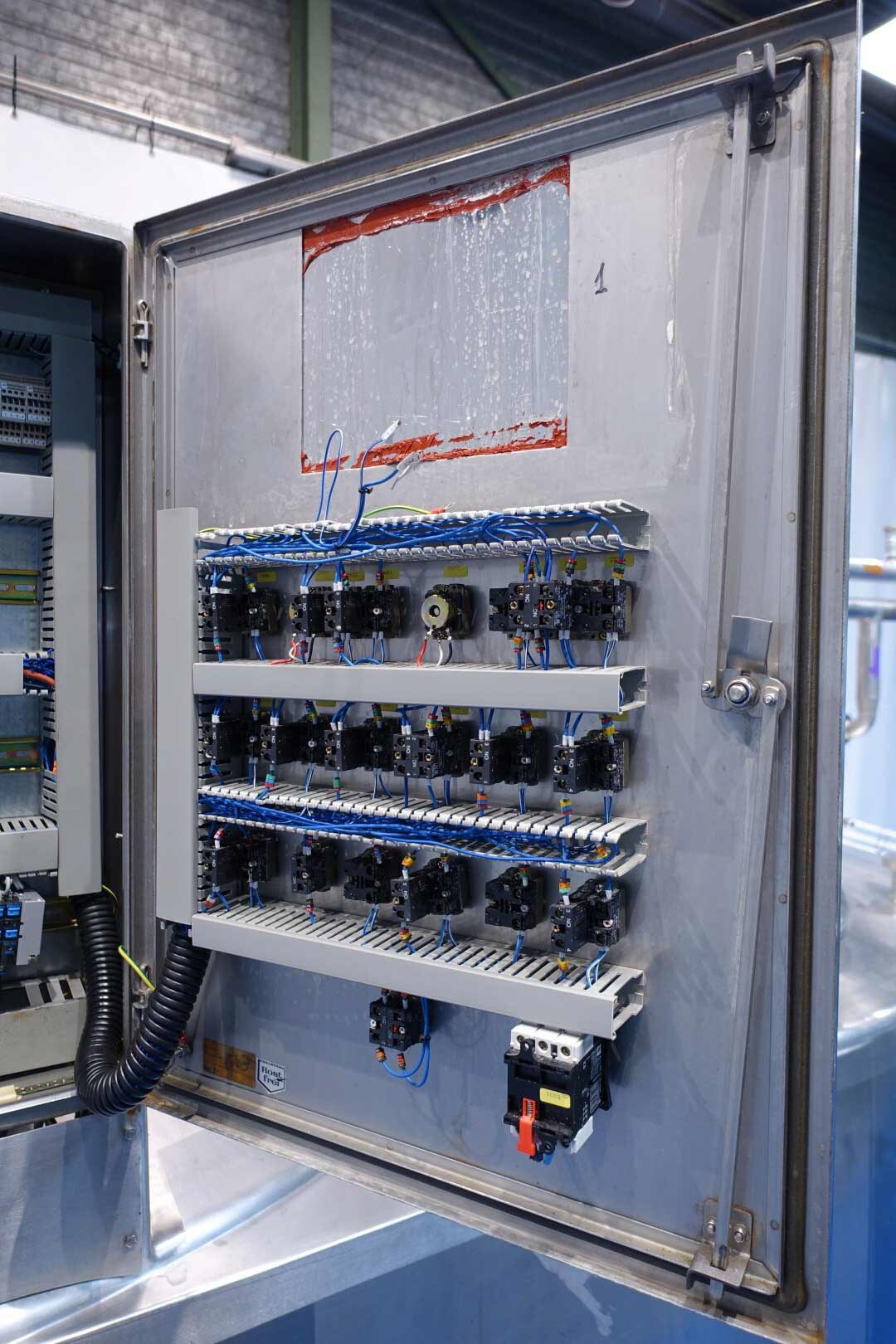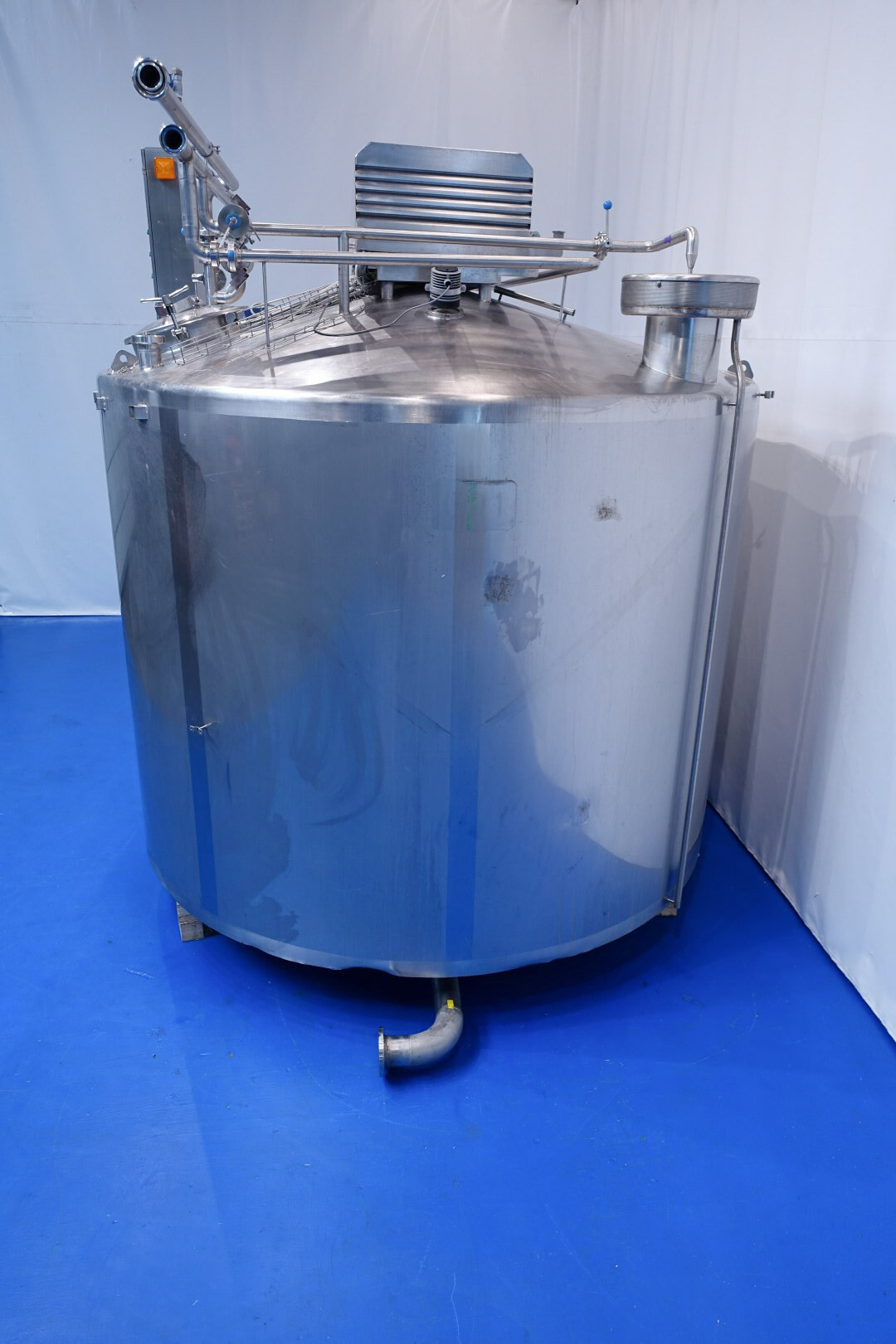 Cuve de caillage horizontale. Double paroi. Aspiration du lactosérum par le haut avec capteurs. Trou d'homme de 45 cm avec protection de sécurité et capteur. Moteur d'entraînement de 4,0 kW. Nettoyage NEP possible, équipé de deux boules de pulvérisation. Aérateur sur le dessus avec cuve NEP, tuyau NEP avec vanne papillon manuelle. Lampe d'inspection sur le dessus. Hauteur de sortie (caillé) (avec pieds) : environ 35 cm, diamètre du tuyau : environ 100 mm. Manuel d'utilisation et schéma électrique (en allemand) disponibles.