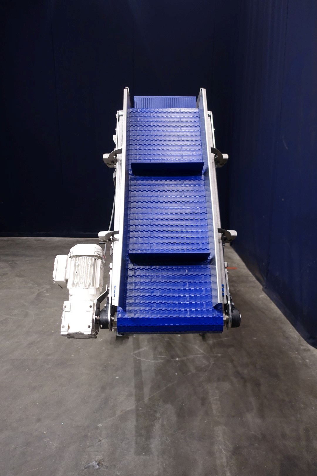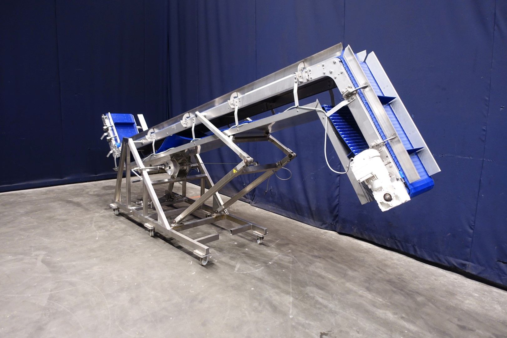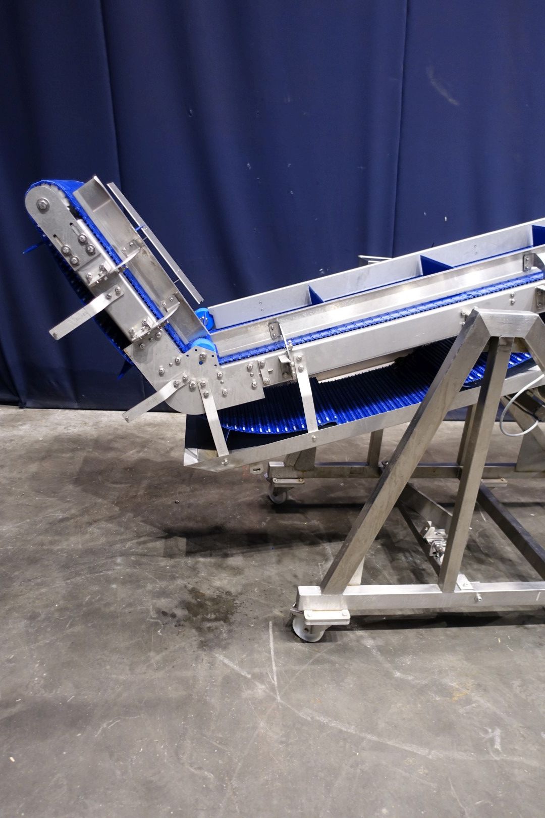 Mobile elevating belt with dividers. Elevating height adjustable through manual hoist. Built on stainless steel frame. Plastic mesh belt. Belt width: 380 mm. Distance between dividers: 385 mm. Divider height: 75 mm. Elevating height: 1800 mm. Total dimensions: 440x105x255 cm (lxwxh) - weight: 305 kg.