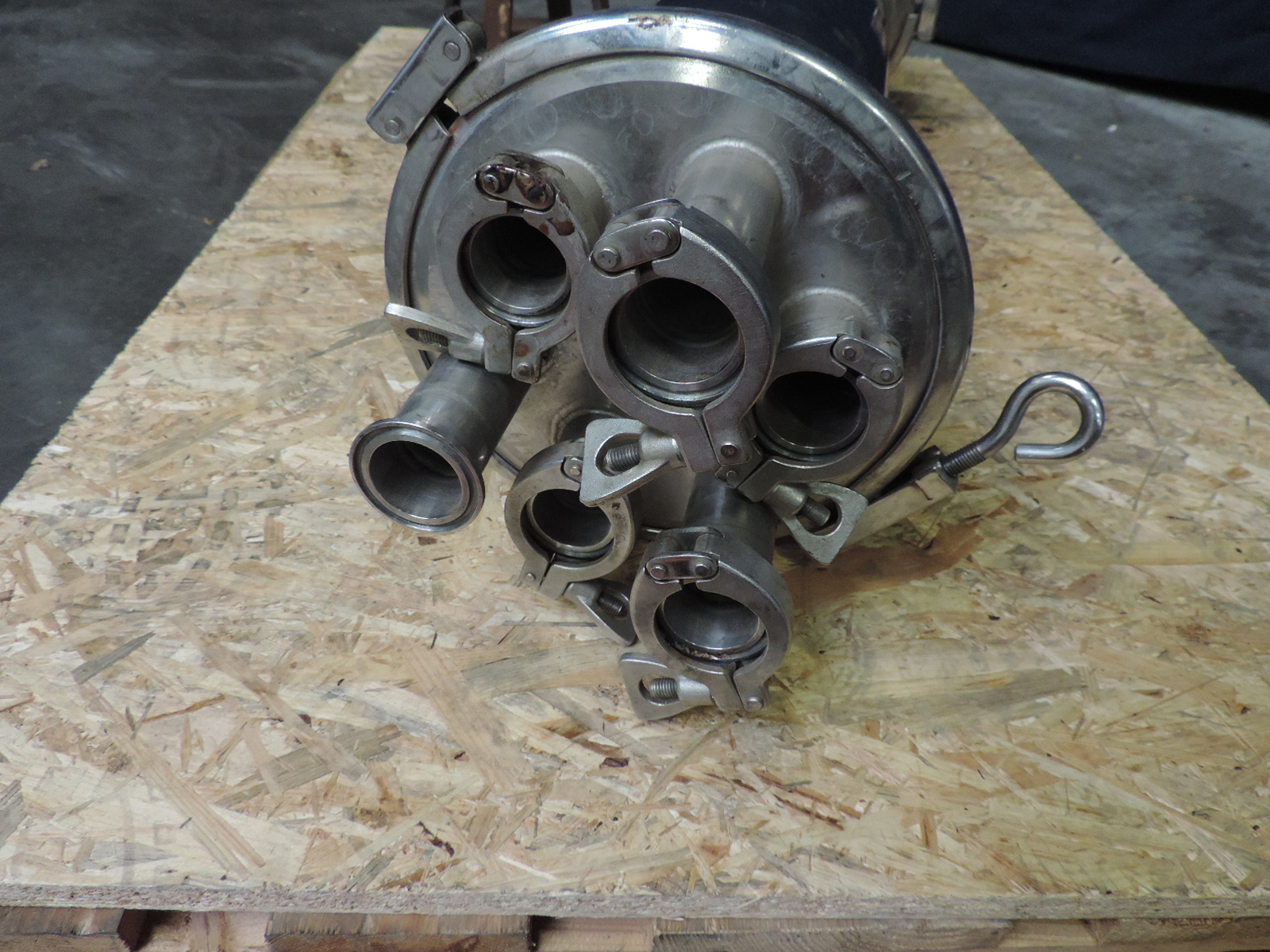 Inline mixer with 2 screw shaped spiral mixers, integrated into each other. Excluding motor. Connections inlet 2.5'' Flange/ outlet 6x 1.5''Clamp.