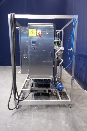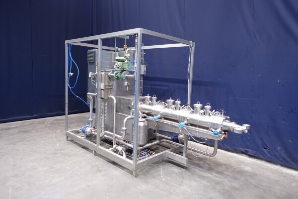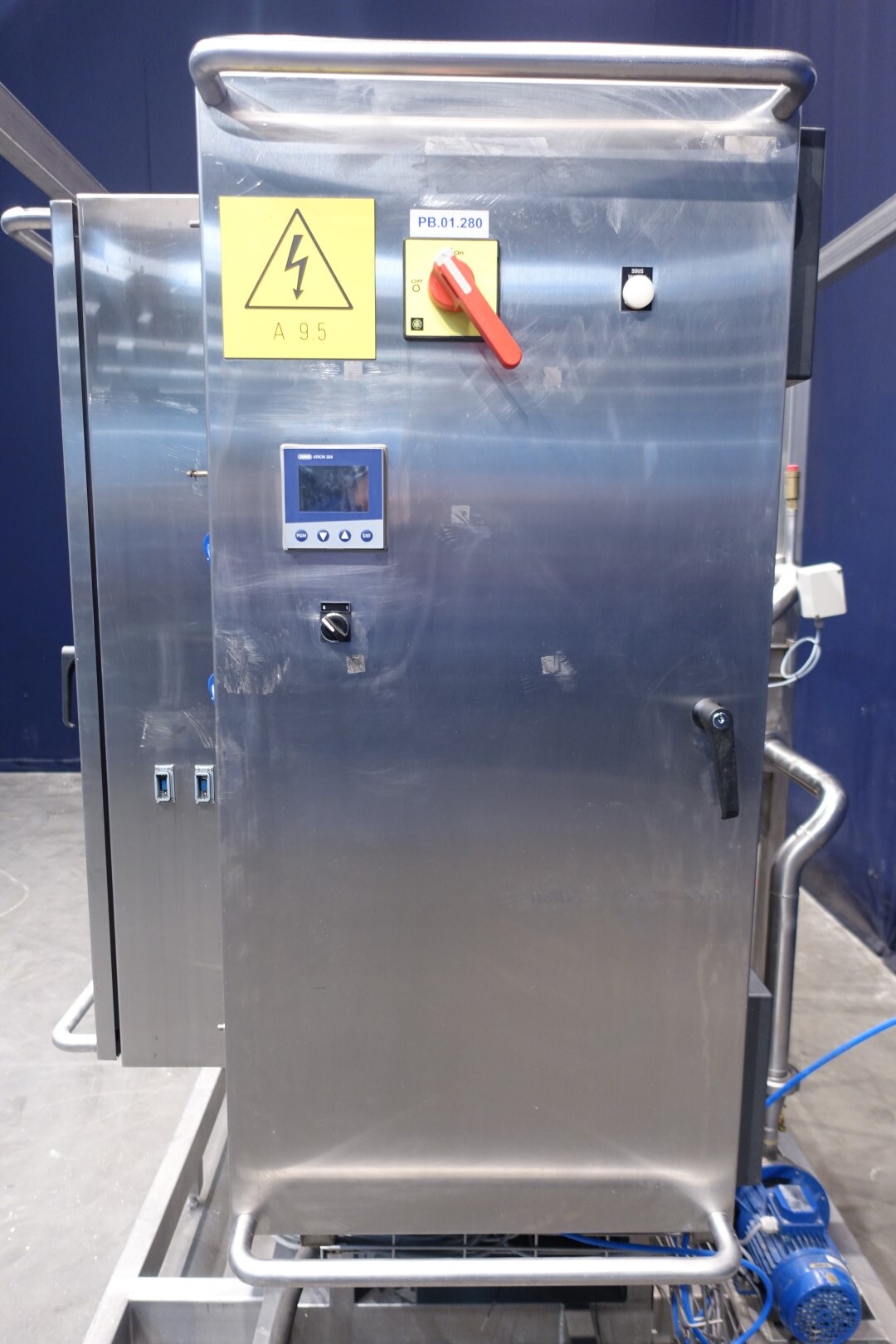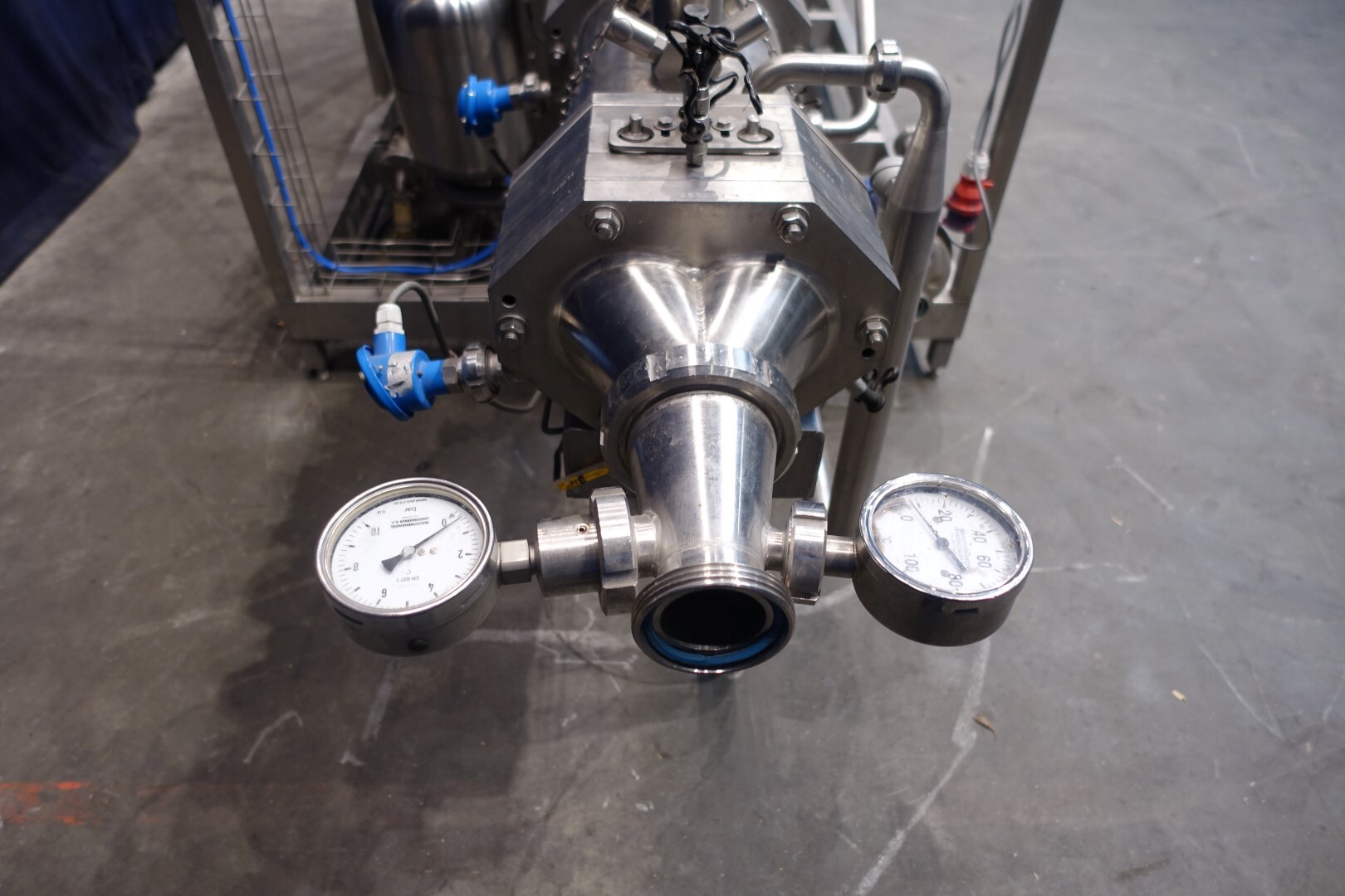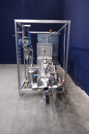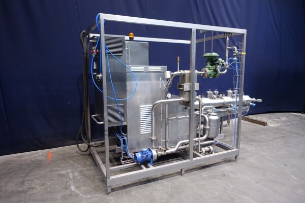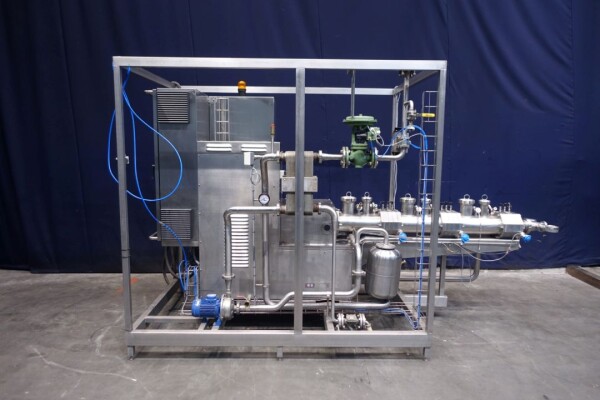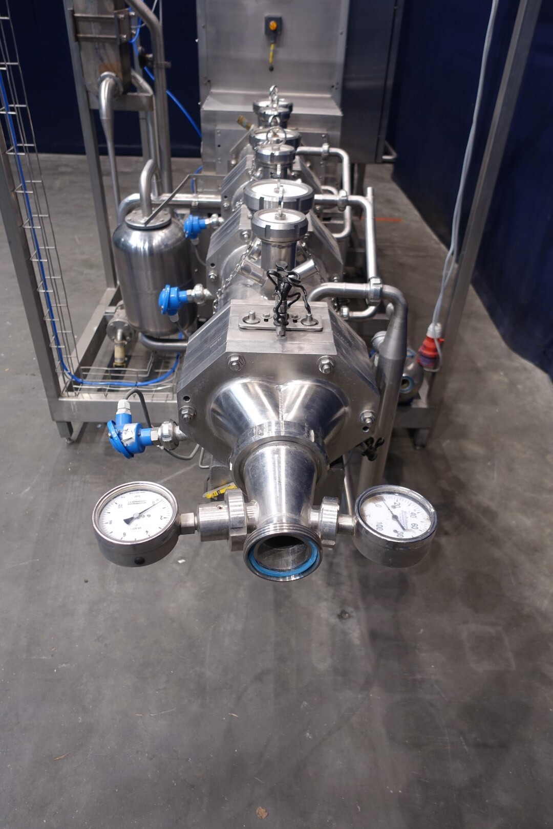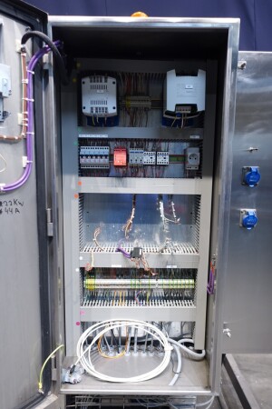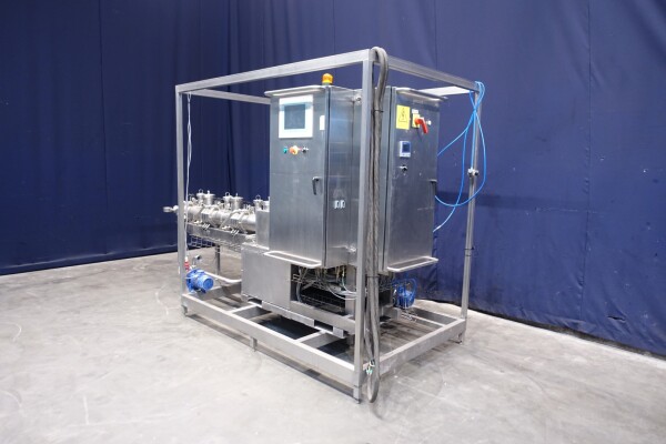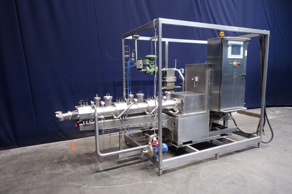 Mélangeur de beurre continu en ligne. Avec 2 vis (diamètre ± 110 mm), double enveloppe, longueur des vis : 1,6 m, 3 sections de 52 cm chacune avec alimentation SMS 4", 3", points d'injection d'air, points d'injection de liquide dans chaque section. Nettoyable CIP, un système de vide peut être ajouté. Actuellement équipé d'un chauffage sur la veste (normal, c'est un refroidissement). Pression d'air maximale 6 bars. Moteur 22 kW (vitesse variable 50-180 tr/min)- 40,7 A - 400 V - 50 Hz - 1468 tr/min. Avec 1 x pompe centrifuge - 2 x 2" Din. Dimensions totales : 340 x 140 x 215 cm. Poids 1.350 kg. Panneau de commande avec convertisseur de fréquence 22kw, avec PLC et écran HMI (pas de logiciel).