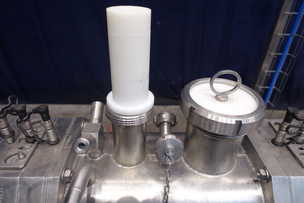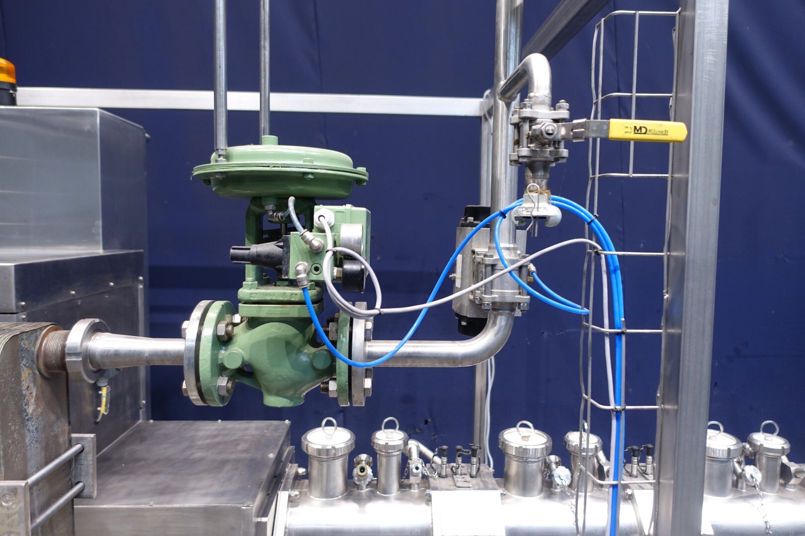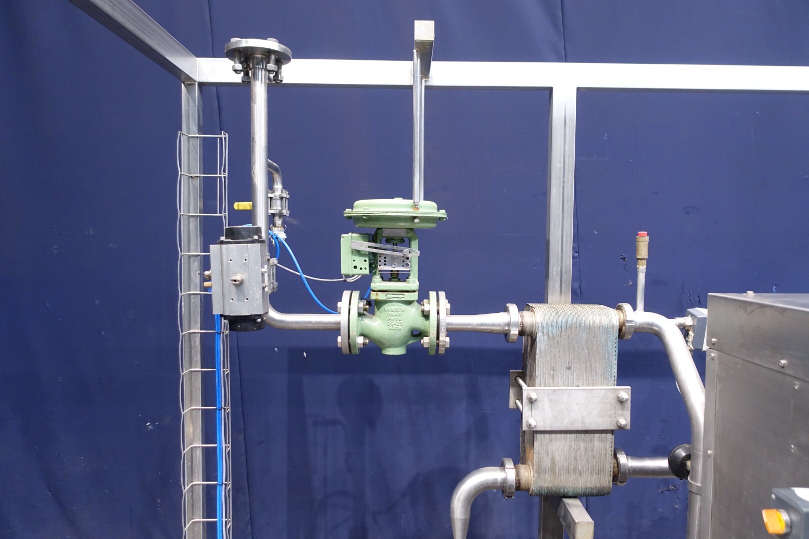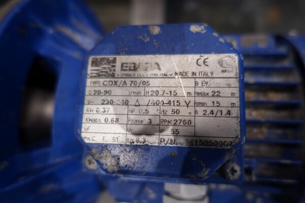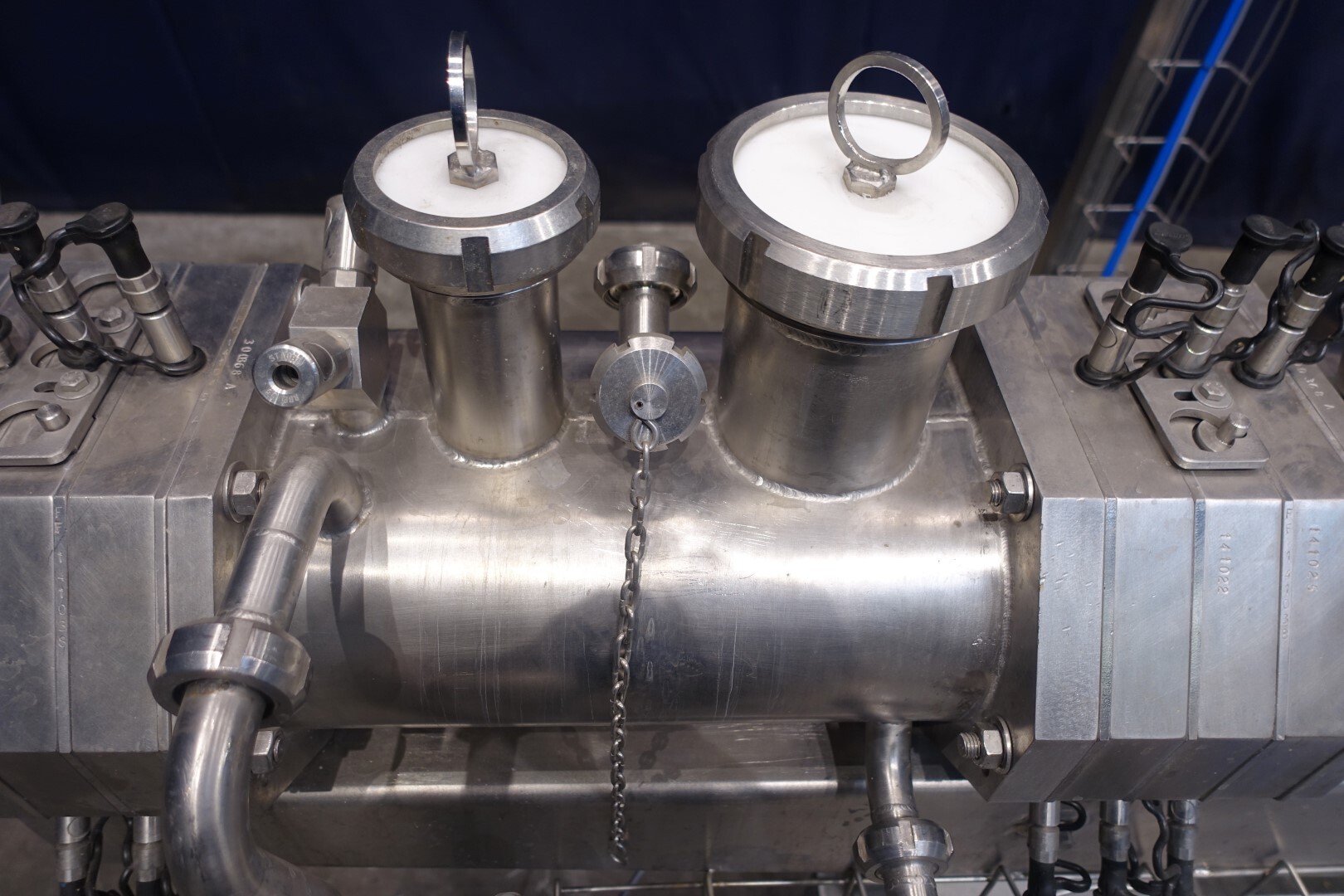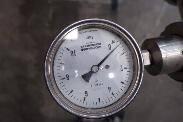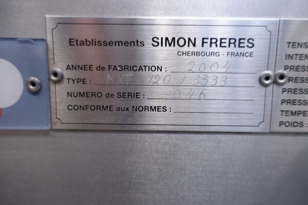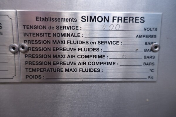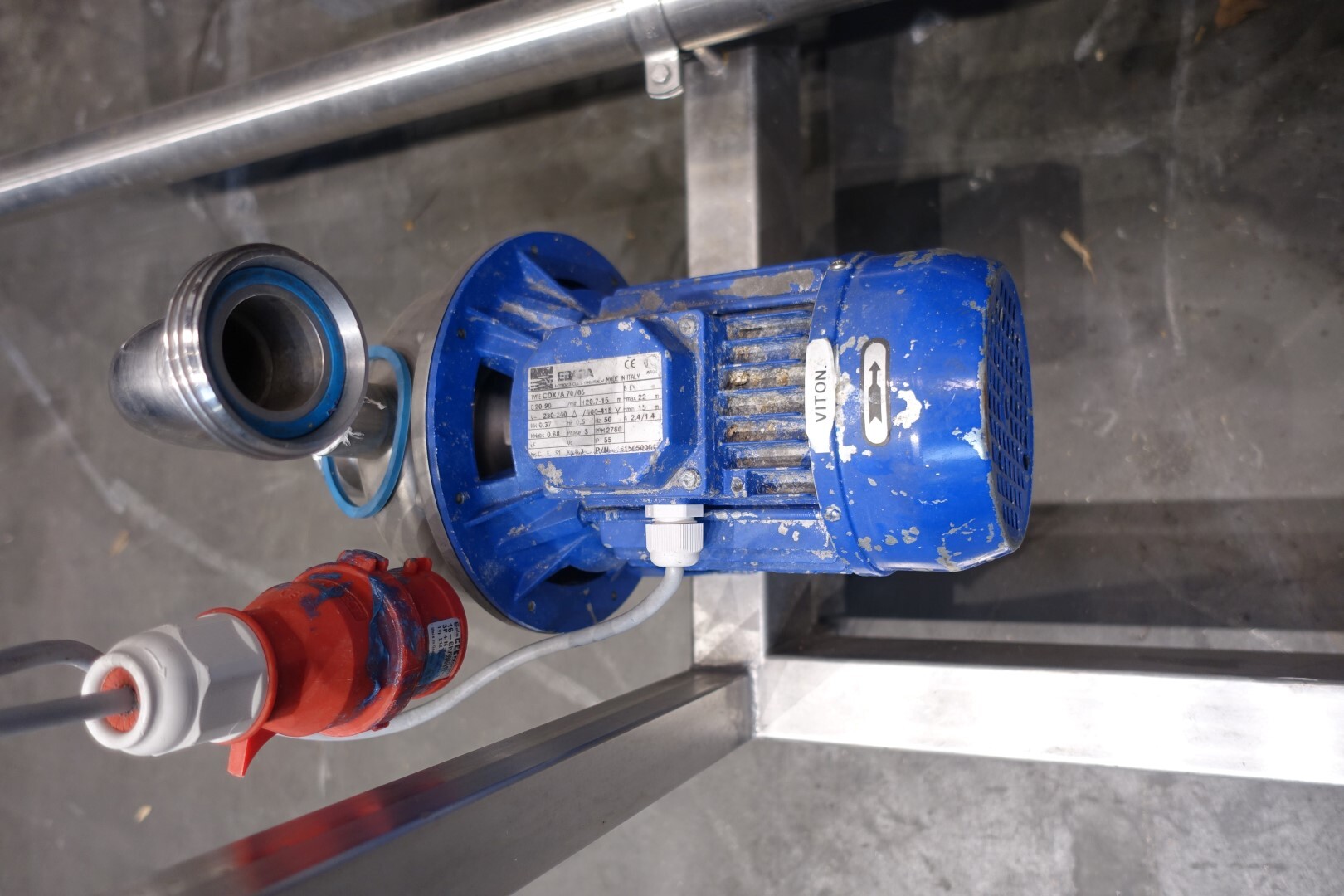 Mélangeur de beurre continu en ligne. Avec 2 vis (diamètre ± 110 mm), double enveloppe, longueur des vis : 1,6 m, 3 sections de 52 cm chacune avec alimentation SMS 4", 3", points d'injection d'air, points d'injection de liquide dans chaque section. Nettoyable CIP, un système de vide peut être ajouté. Actuellement équipé d'un chauffage sur la veste (normal, c'est un refroidissement). Pression d'air maximale 6 bars. Moteur 22 kW (vitesse variable 50-180 tr/min)- 40,7 A - 400 V - 50 Hz - 1468 tr/min. Avec 1 x pompe centrifuge - 2 x 2" Din. Dimensions totales : 340 x 140 x 215 cm. Poids 1.350 kg. Panneau de commande avec convertisseur de fréquence 22kw, avec PLC et écran HMI (pas de logiciel).