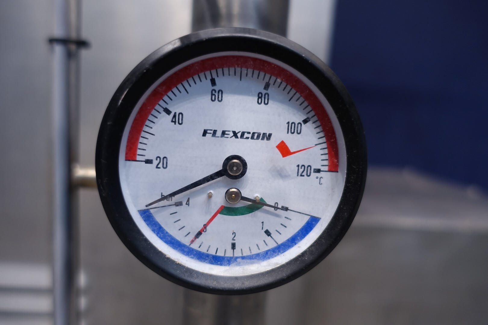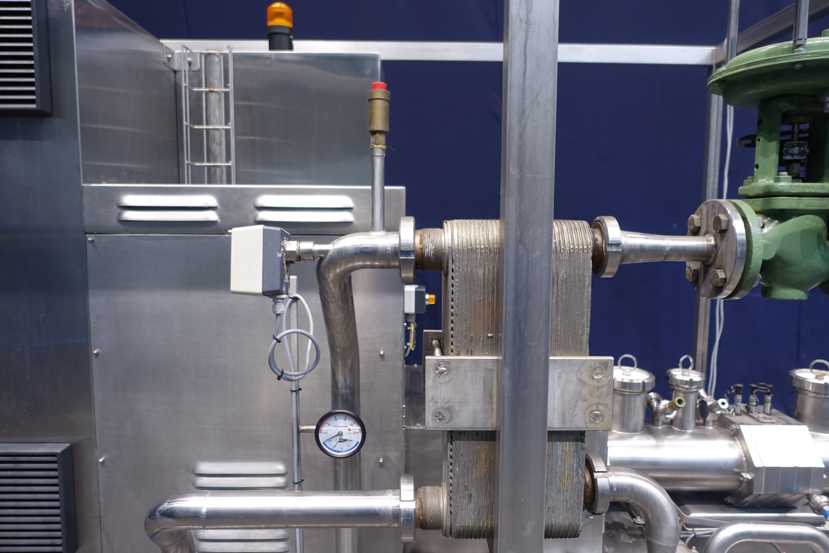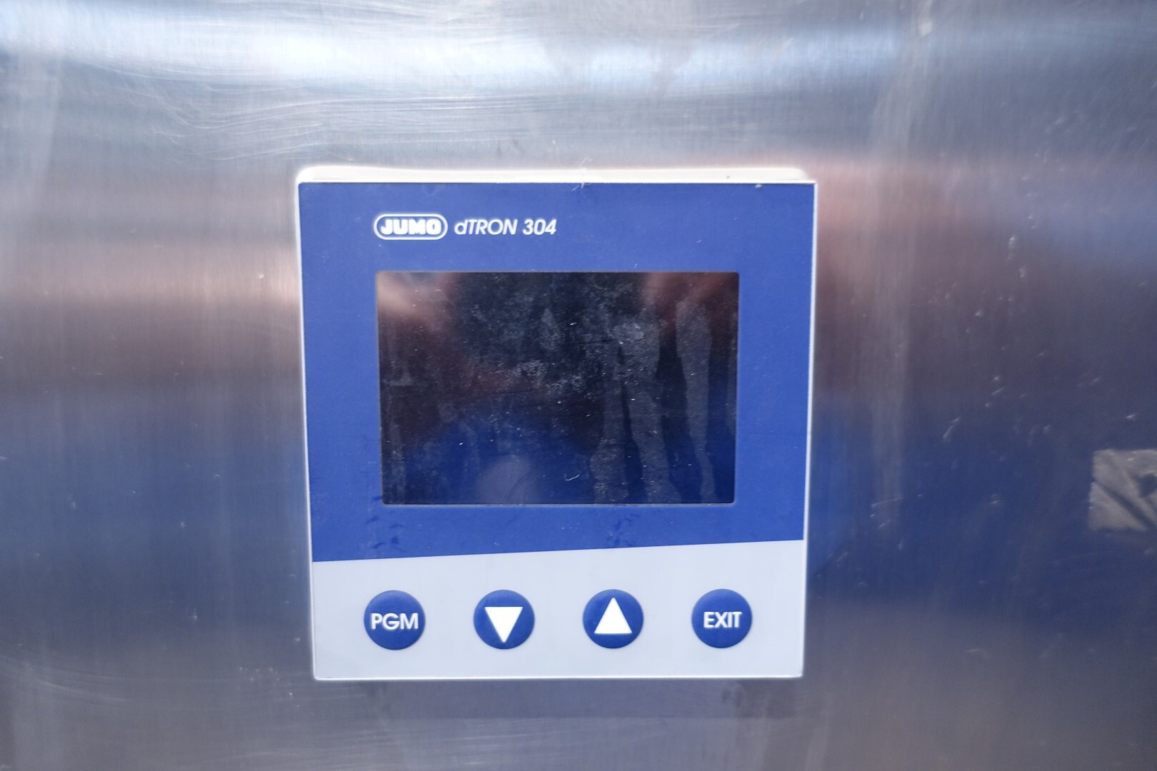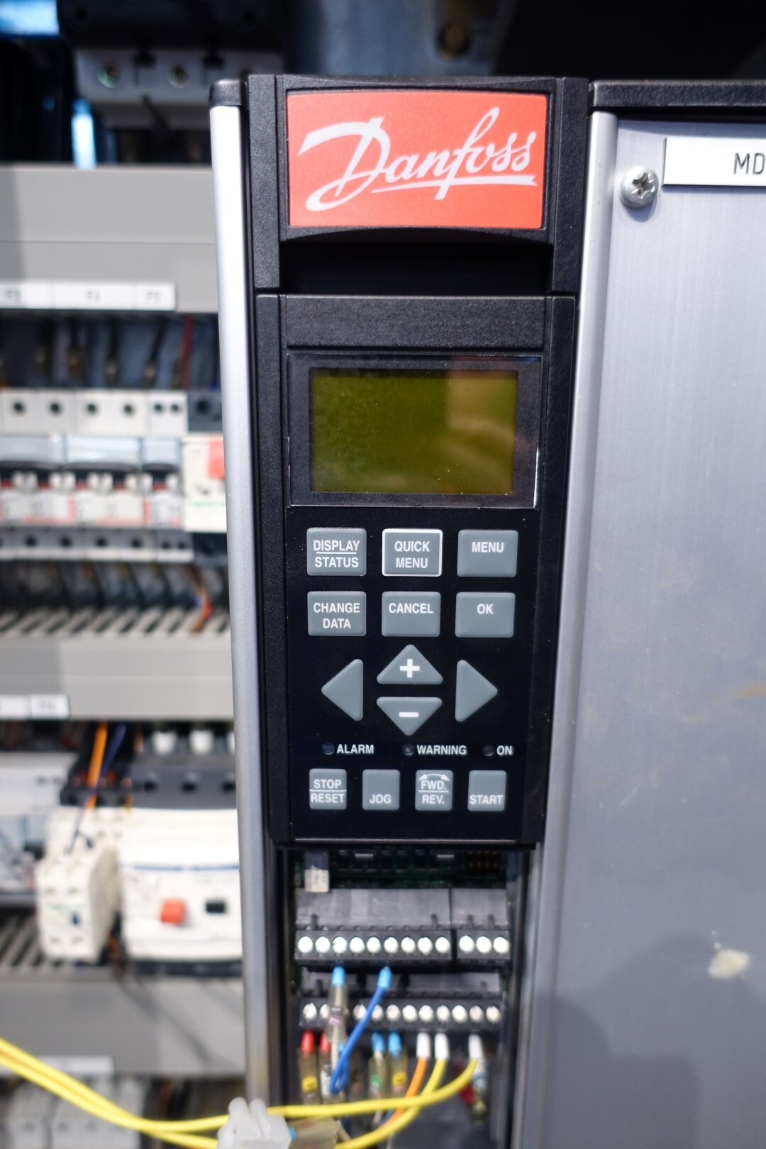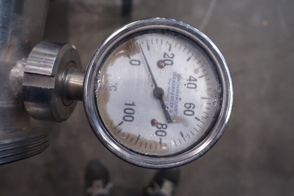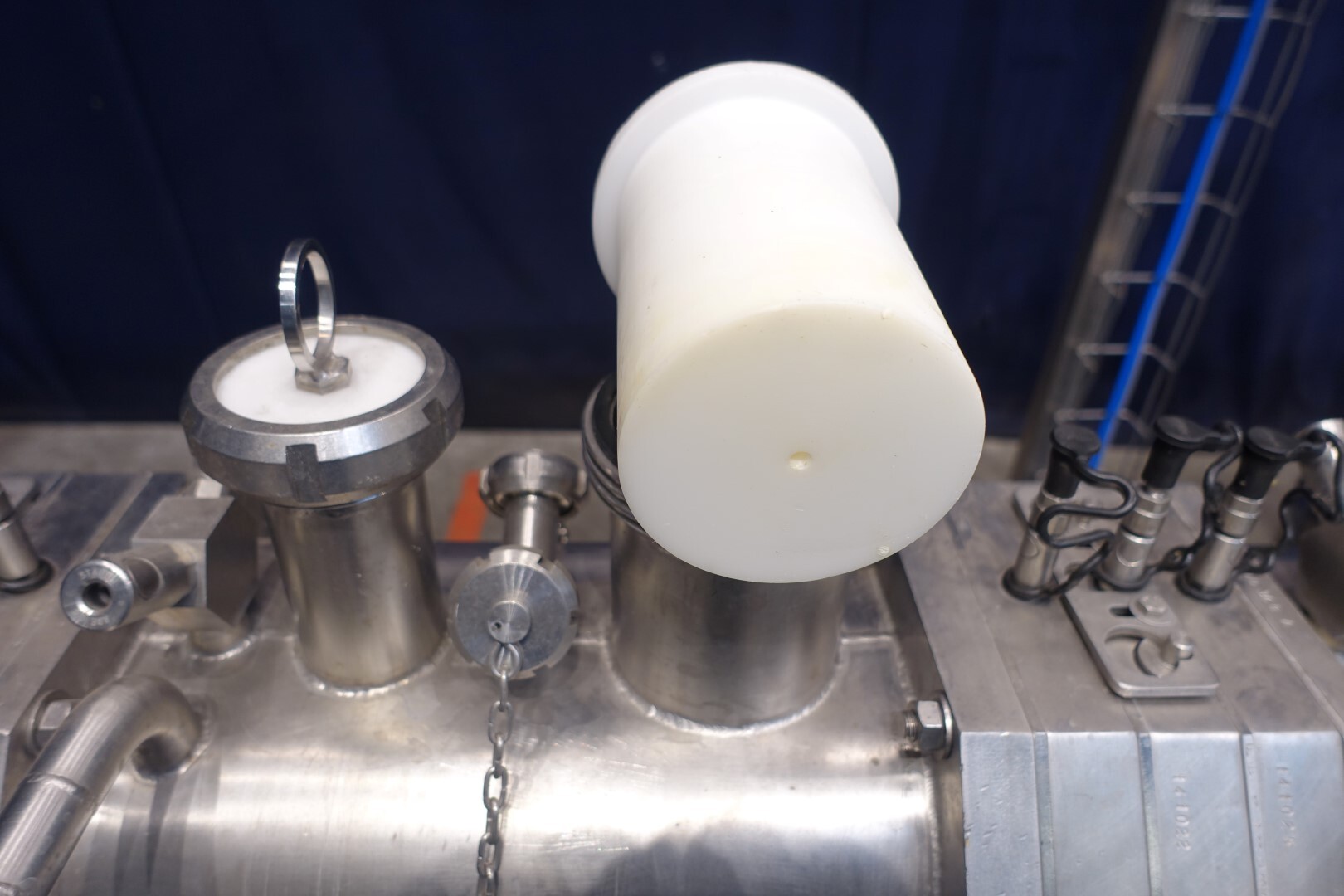 Mélangeur de beurre continu en ligne. Avec 2 vis (diamètre ± 110 mm), double enveloppe, longueur des vis : 1,6 m, 3 sections de 52 cm chacune avec alimentation SMS 4", 3", points d'injection d'air, points d'injection de liquide dans chaque section. Nettoyable CIP, un système de vide peut être ajouté. Actuellement équipé d'un chauffage sur la veste (normal, c'est un refroidissement). Pression d'air maximale 6 bars. Moteur 22 kW (vitesse variable 50-180 tr/min)- 40,7 A - 400 V - 50 Hz - 1468 tr/min. Avec 1 x pompe centrifuge - 2 x 2" Din. Dimensions totales : 340 x 140 x 215 cm. Poids 1.350 kg. Panneau de commande avec convertisseur de fréquence 22kw, avec PLC et écran HMI (pas de logiciel).