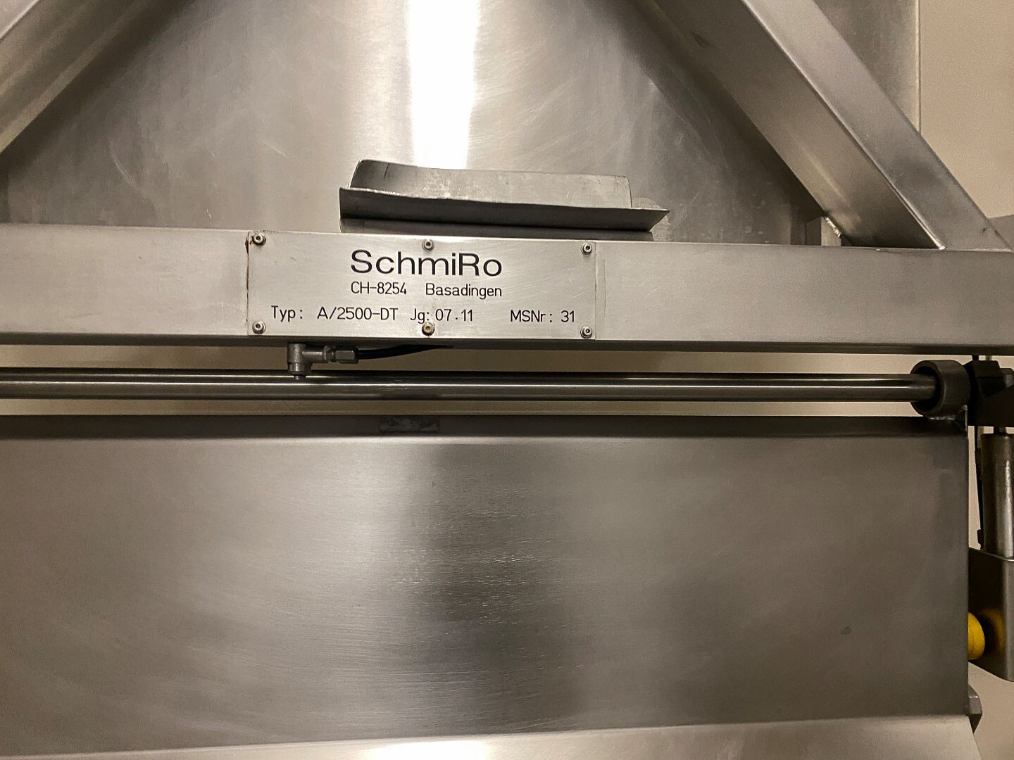 Les robots de graissage et de soin des fromages SchmiRo A/2500-DT sont principalement utilisés dans les fromageries et les caves d'affinage pour les fromages à pâte mi-dure et en tranches provenant des étagères à fromages. Ce robot fonctionne de manière entièrement automatique et est équipé de plusieurs options. Ce robot est conçu pour graisser et traiter des fromages de 6 kg de 300 mm de diamètre, avec une hauteur maximale de 100 mm par fromage. Il peut traiter des planches en bois ou en plastique. Concernant les types de planches, ce robot est utilisé pour les étagères à fromages en bois (105 x 30,5 cm). Environ 2 200 étagères à fromages sont disponibles. Les mouvements sont à entraînement électrique et pneumatique. Grâce à sa conception compacte, le robot est très convivial.
