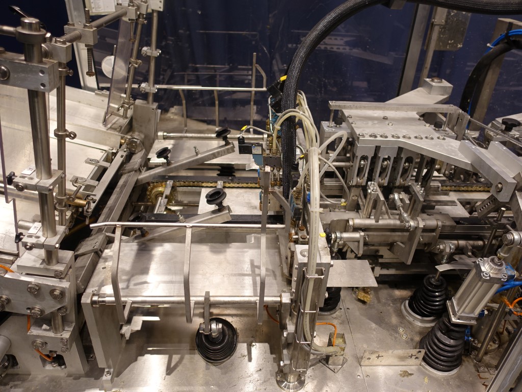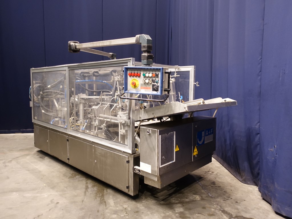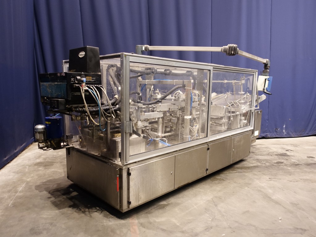 Fully automatic trayformer to make trays with logs from plano, format 4x6 = 24 cups/tray. The trays are formed in 4 steps including a step to glue in the middel of carton for re-inforcement carton by press fingers. Modicon TSX Micro PLC. Including hotmelt glue device, manufacturer Nordson, type: 3500. Total dimensions: 410 x 130 x 190 cm.
