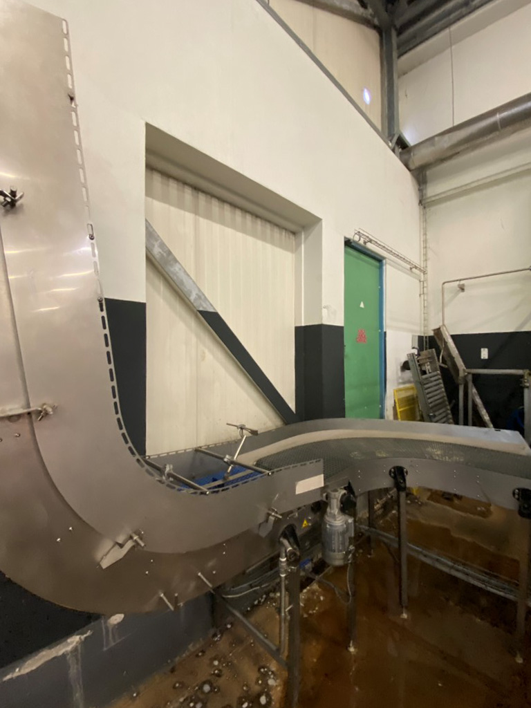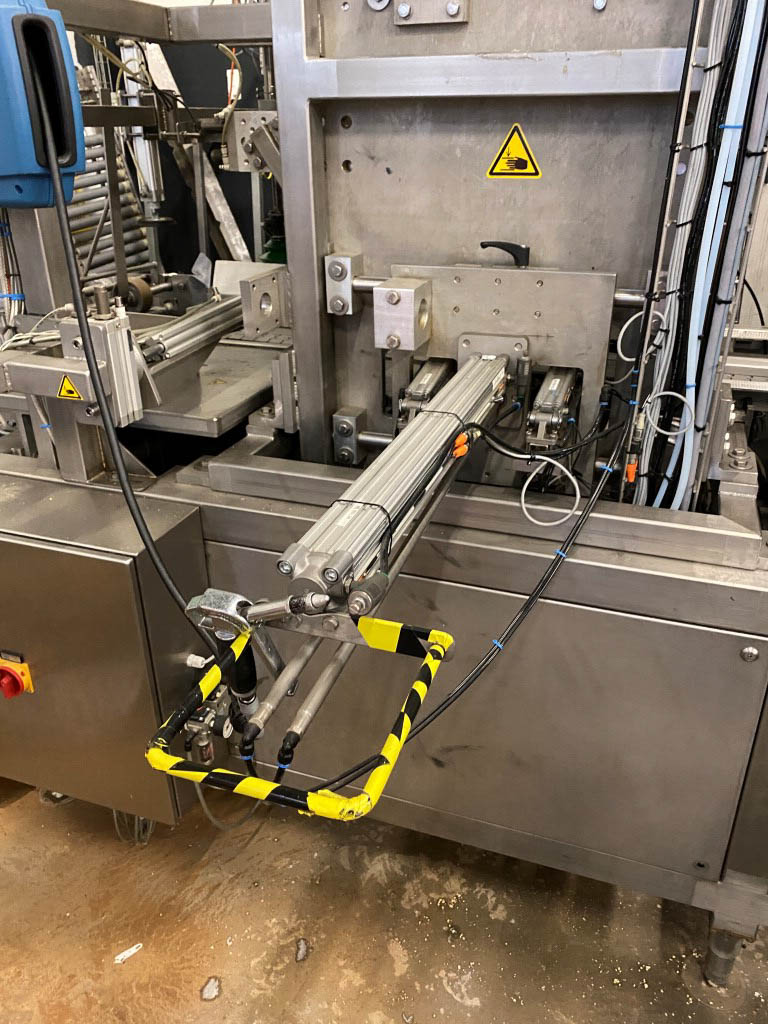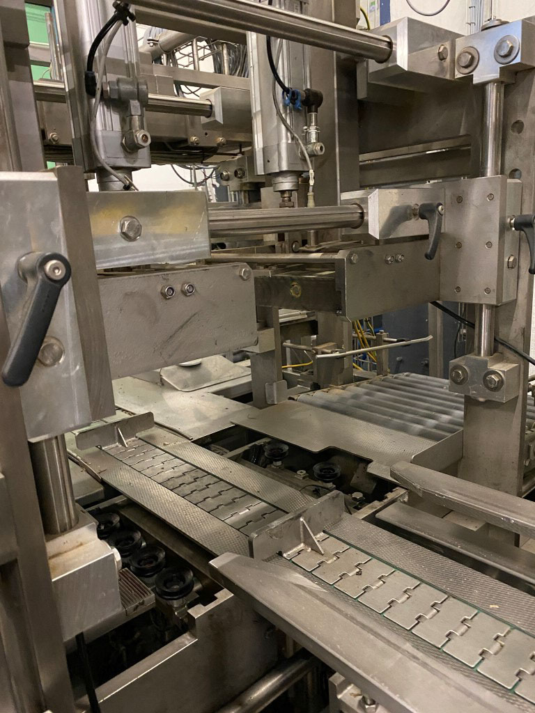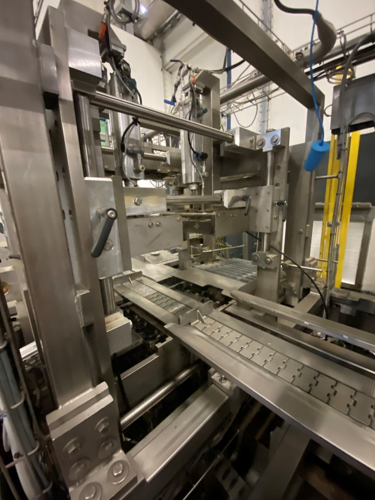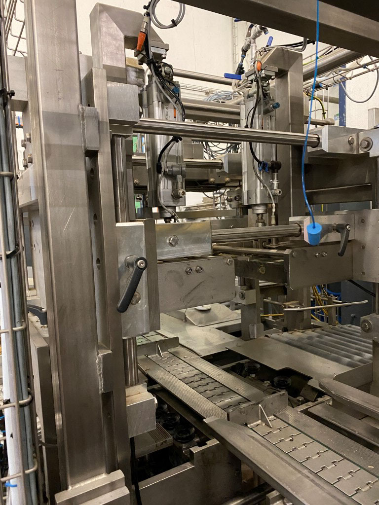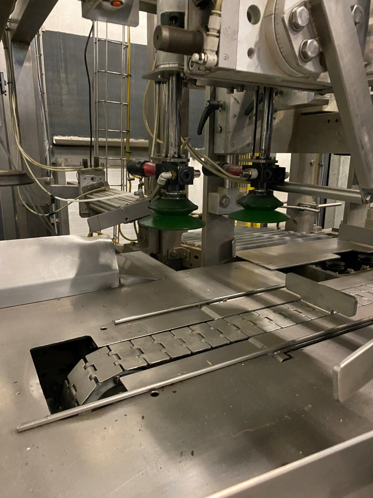 Robot used for de-palletizing cold butter bulk blocks. With a capacity of ca. 320 cartons of 25 kg. The ABB robot accurately positions carton boxes from the pallet onto the infeed conveyor of the de-boxer. The deboxing packer also available under STN15963. The pallet transport system includes an infeed conveyor for wooden pallets, a separate conveyor for empty pallets, a depalletizing station, a pallet stacking station and a removal station for stacked pallets. The robot with conveyors has complete safety covering. Controls: Siemens S7 with operation panel. The empty boxes are transported via the conveyors outside the unit.
