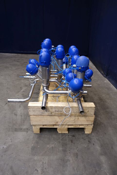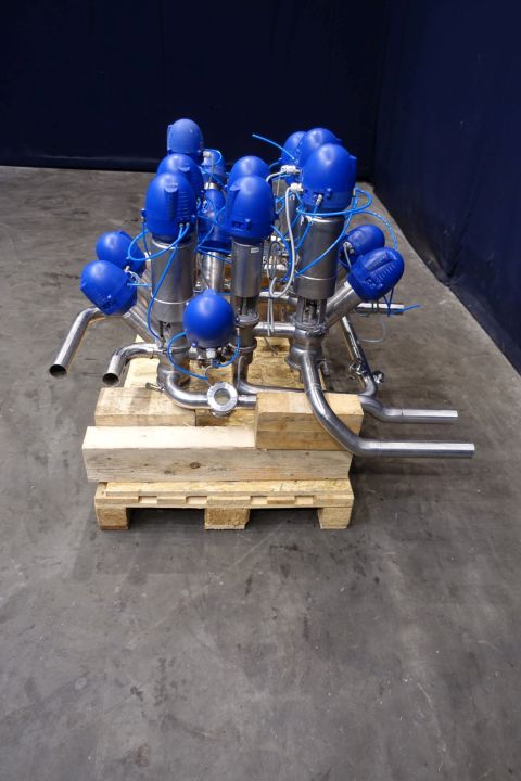 Valve manifold with 18x Alfa Laval valves: 8x Alfa Laval LK KA-t buttefly valves, 6x Alfa Laval SSV 3-way and 4x unique mixproof 4-way with seat lift. With 2 x sight glass by Bulls-eye. All valves with thinktops smart head All pneumatic activated. Diameter: 2" Weld-Weld. Dimensions: 140 x 130 x 80 cm - weigth 223 kg's. PID available used to split 2 incomming lines to 3 outgoing lines.
