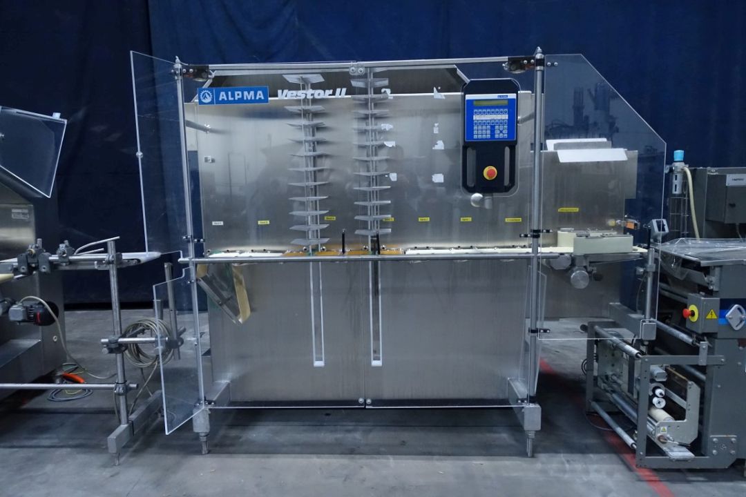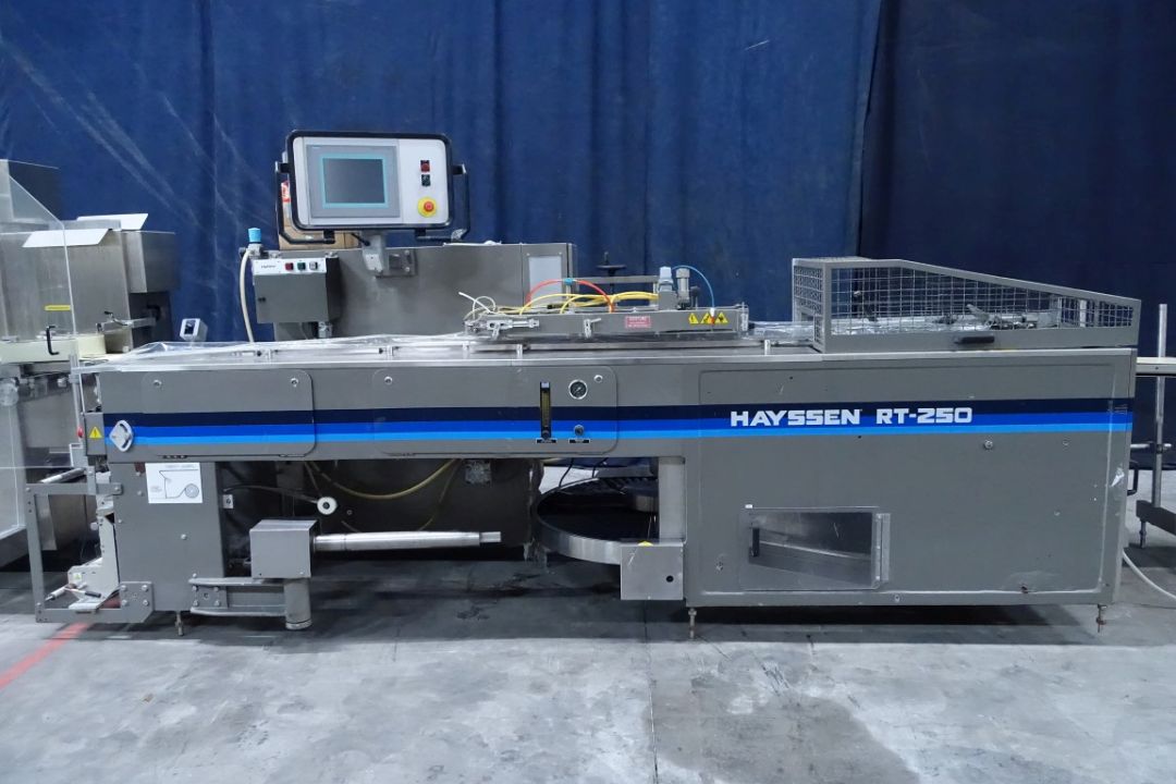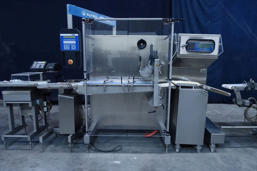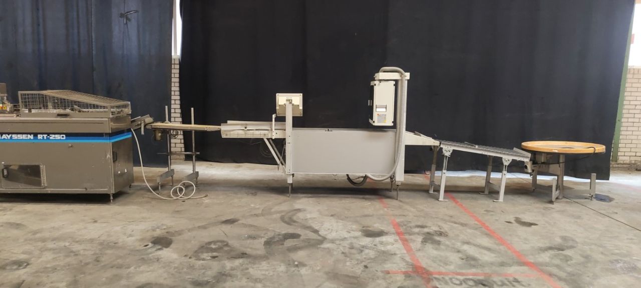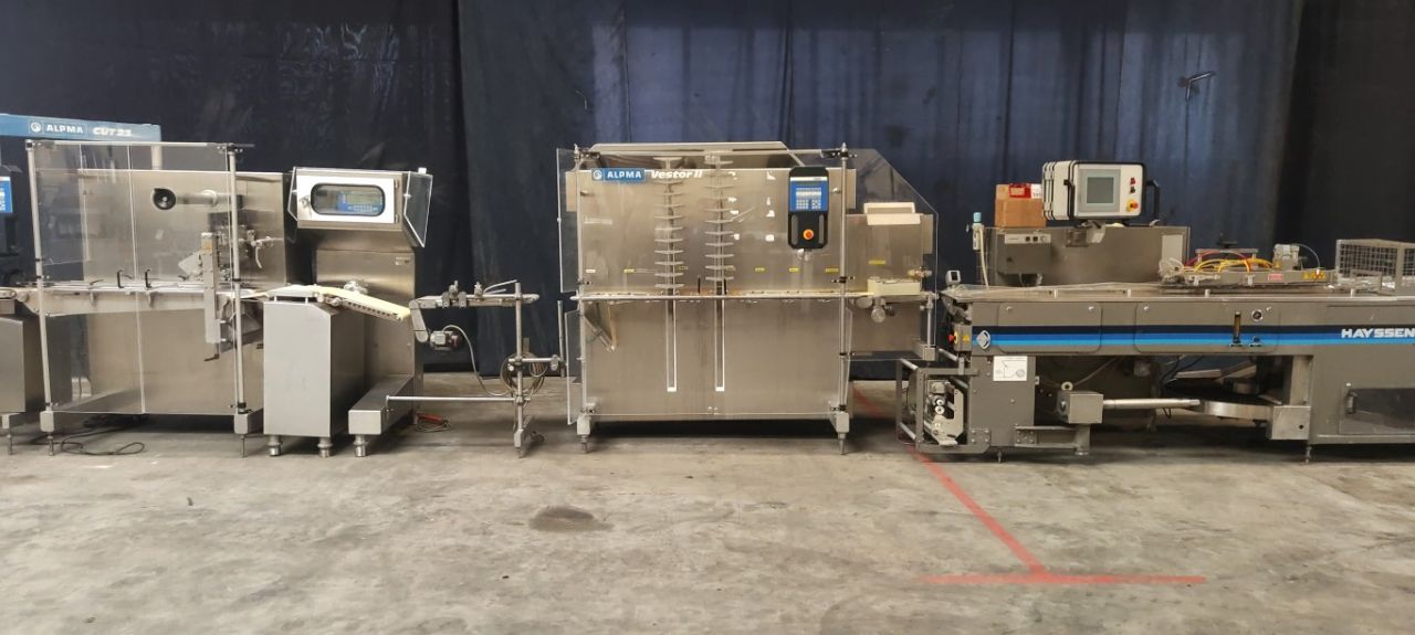 Complete cheese logs cutting and packaging line. Previously used for cream cheese 320 gram portions. Line existing out of: weighing conveyor (Alpma Bandwaage), cutting machine (Alpma Cut 33), check weigher (Alpma Hygiene Kontrollwaage AHW 300C), cutted cheese buffering machine (Alpma Vestor II), flowwrapper (Hayssen, RT-250), weighing and pricing unit (Bizerba 9,369 92.20), non driven rolling conveyor and turn table. Including all interconnecting conveyors and controls.