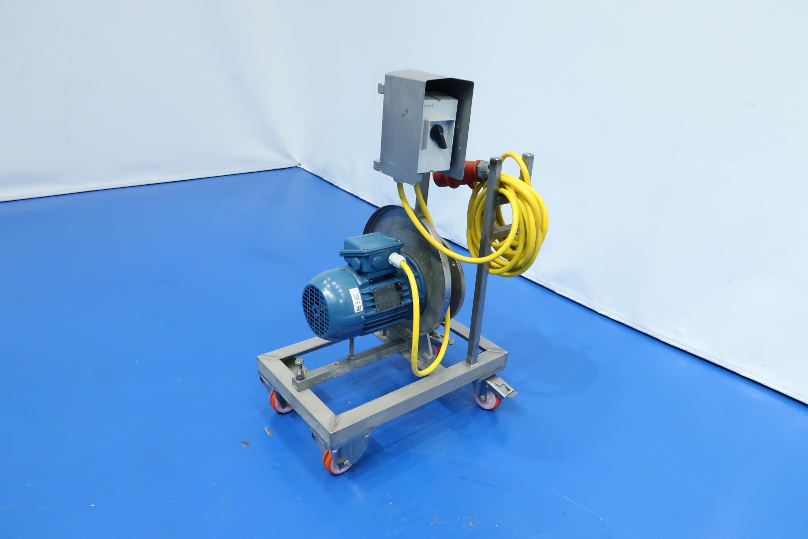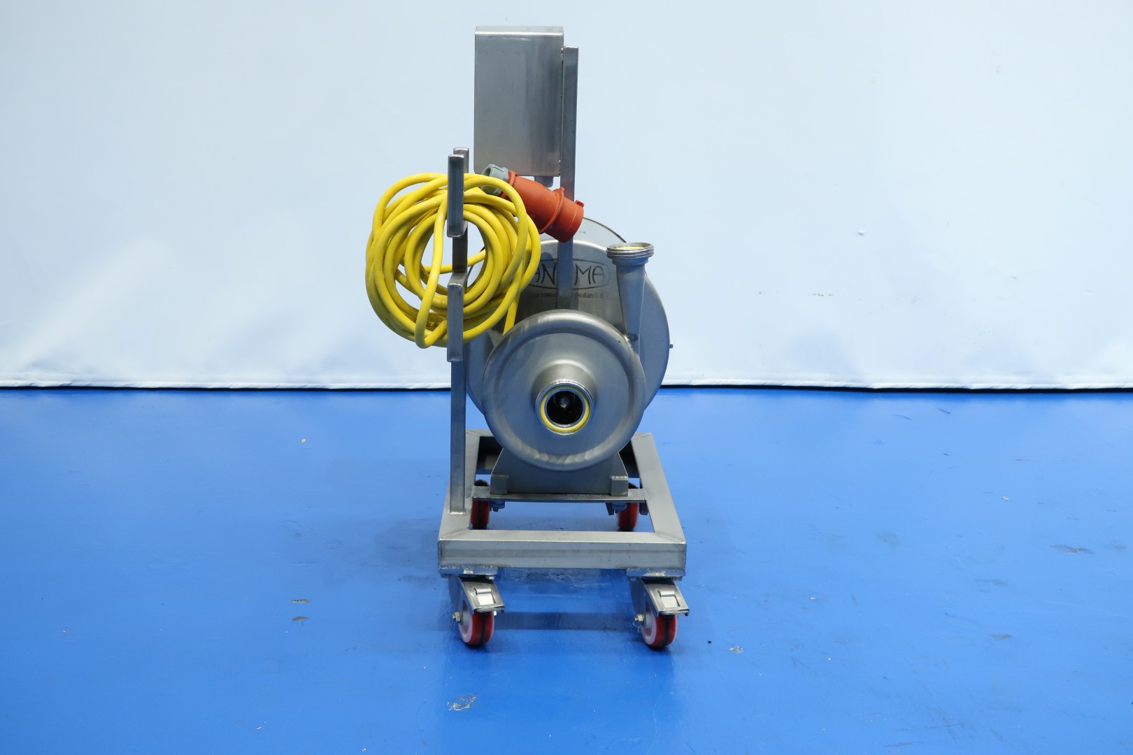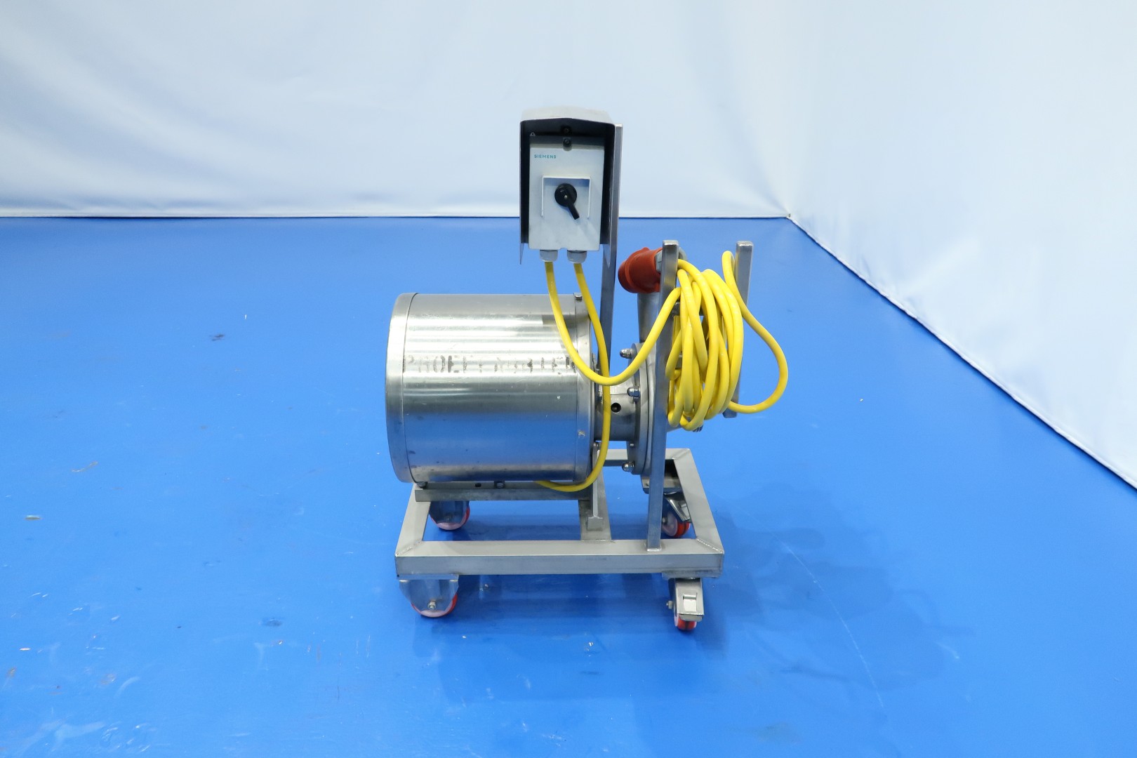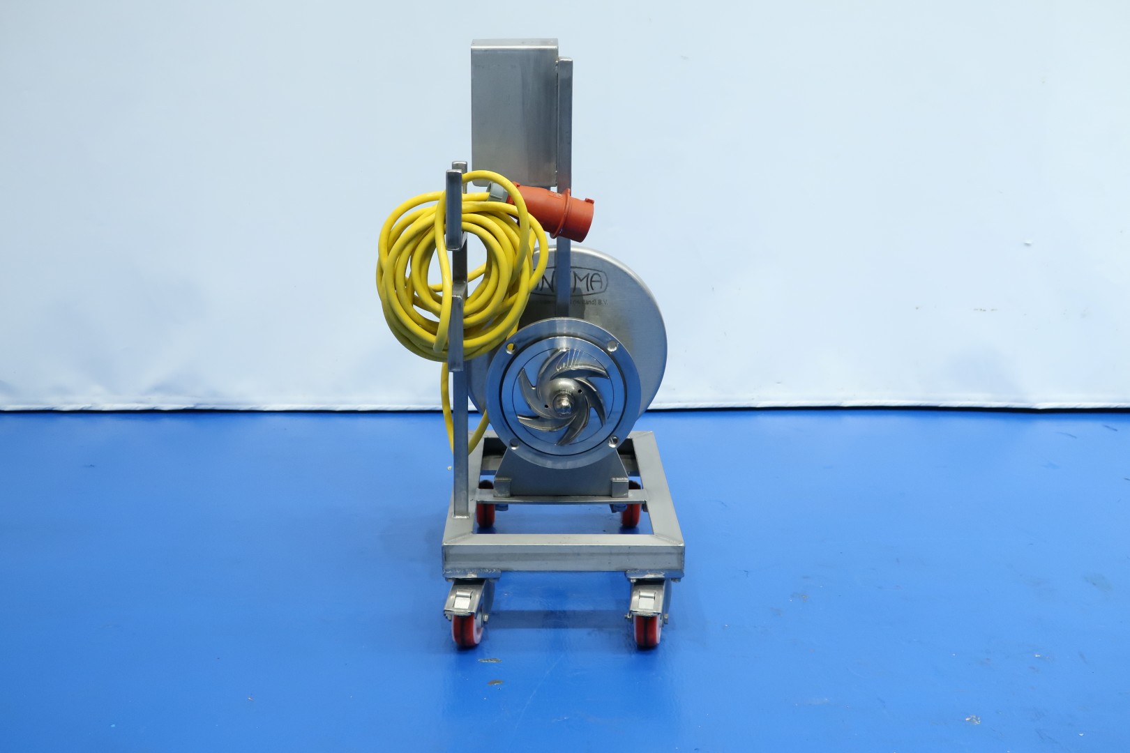 Sanitary centrifugal pump on mobile SS frame with on/of switch. Motor: 1,1 kW - 2,7 A - 2.840 rpm - 50 Hz. Impellor diameter: 140 mm. Flow and Pressure estimate 10,000ltr at 1,5 bar. Connections: (in) 2,5" Din / (out) 2" Din. Total dimensions: 52x33x81 (lxwxh) cm - weight: 25 kg.