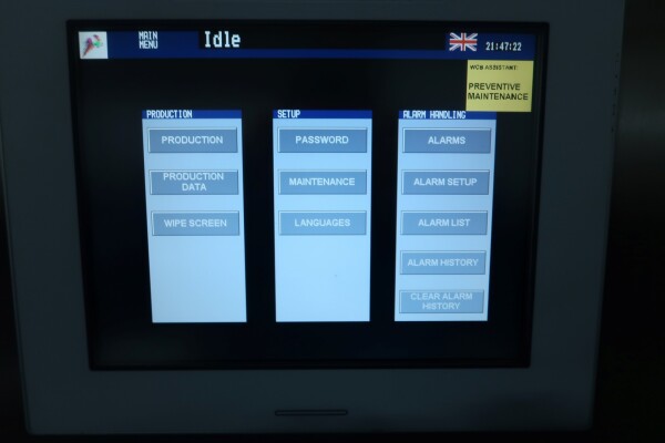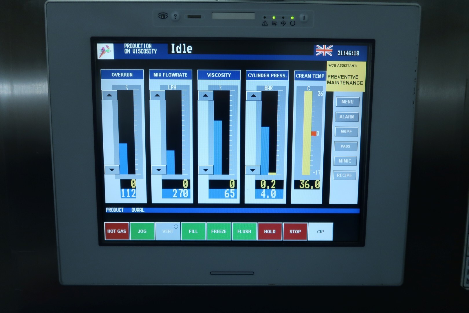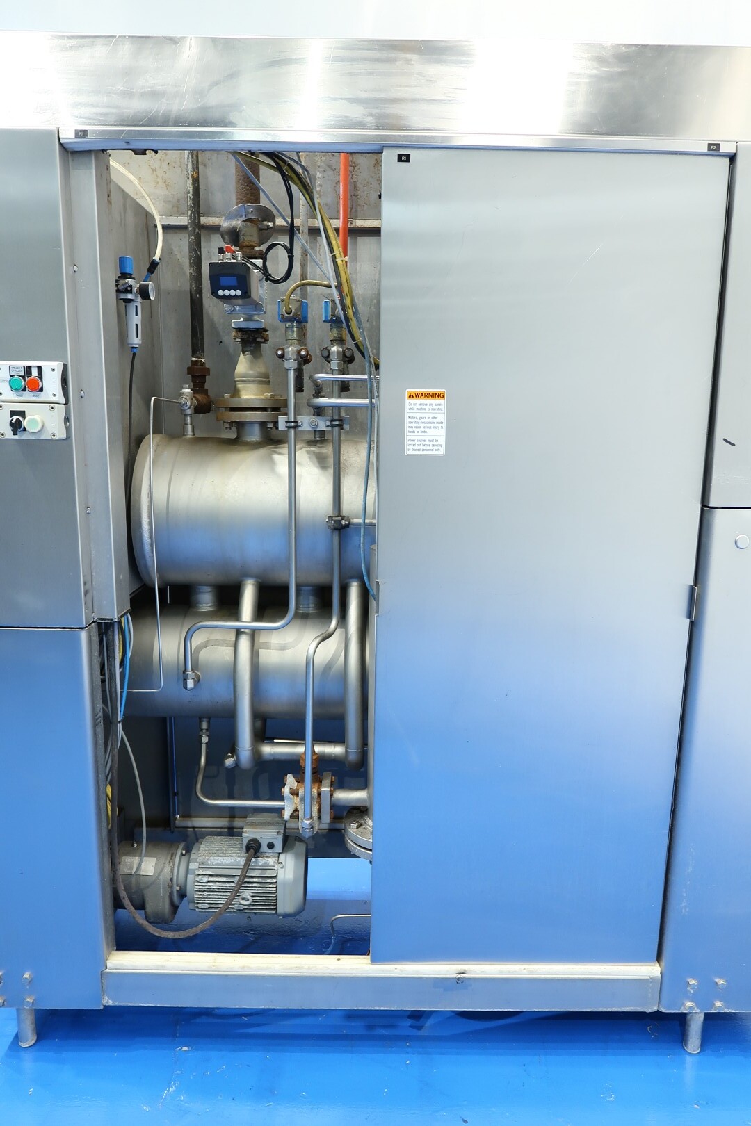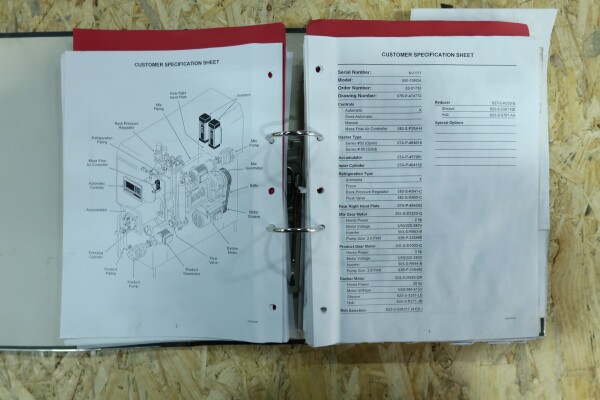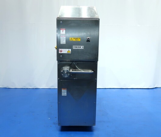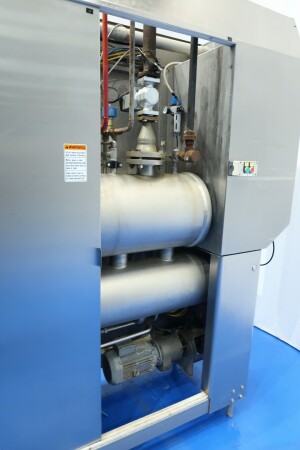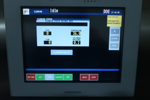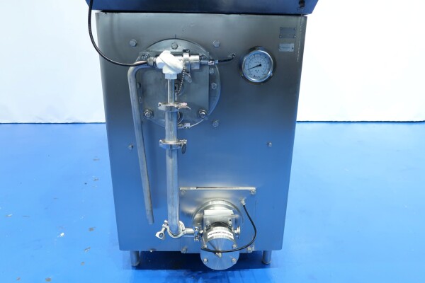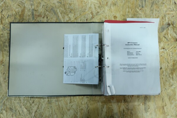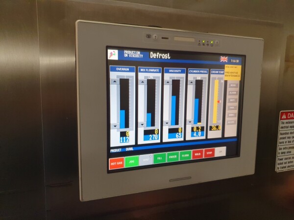 Continue ijsmachine met één cilinder, nieuwe schrapers en een ammoniak (NH₃) koelsysteem. Voorzien van pompen en een Siemens Simatic S7 PLC met touchscreen bediening. Recent onderhoud uitgevoerd aan dasher, cilinder en pompen (rapport beschikbaar). Aansluitingen: productpomp 2" Tri-Clamp, mixpomp 1,5" Tri-Clamp. Nominale capaciteit gebaseerd op mix met 10,5% vet, 37,5% droge stof en standaard suiker-/stabilisatorsamenstelling. Inlaattemperatuur 4,4°C, uitlaat -5,5°C. Koelcapaciteit bij -33°C.
