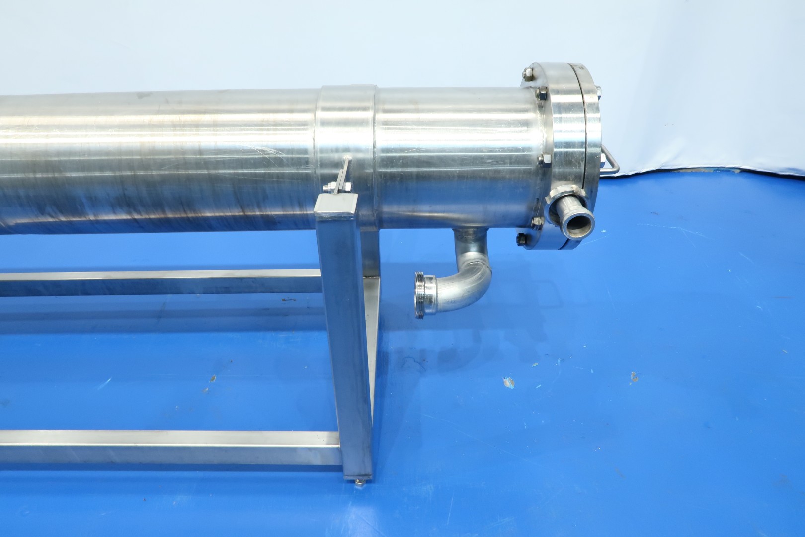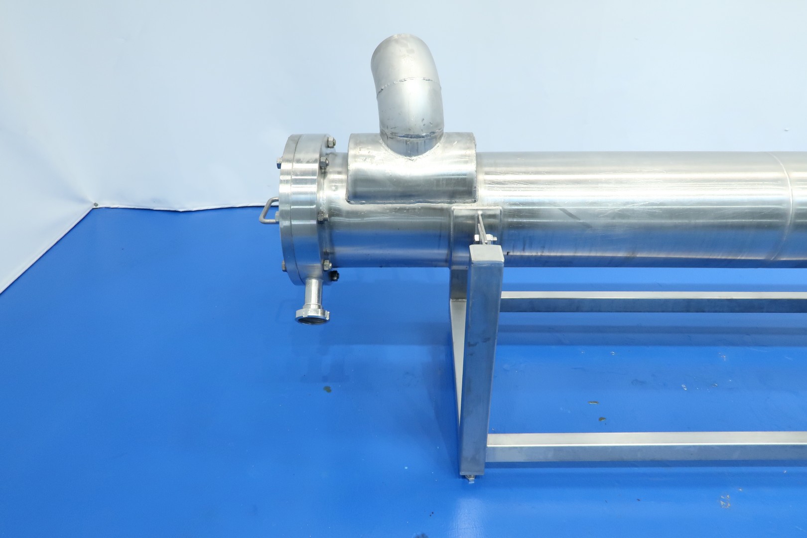 Heater unit with Direct steam injection (DSI) and flash cooling. previously used on milk concentrate 50%. Extreme fast heating and cooling of sensitive products. The Unit exist of: infeed (centrifugal pump Fristam 7,5kw, Tubular pre heater/air cooler (recuperation system), tubular heater by steam/hotwater indirect to ± 80°C, Steam injection direct in the product (heating up to between 90°C or max 145°C) and flash vat to cool product down by vacuum), oufeed pump (Fristam 7,5kW with flushed seal and double filter. The steam is filtered before injected by a steam filter (make Pal). with water pump, product and steam valves and piping. (excluding liquid ring vacuumpump and controls) can be offered on request.