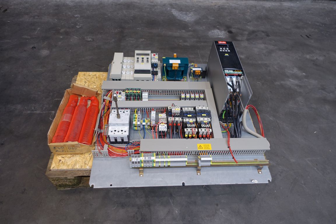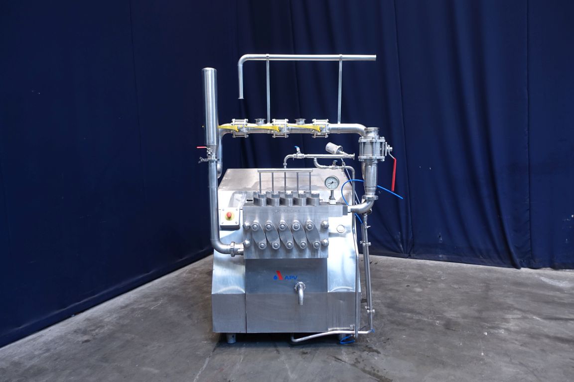 High pressure piston pump. 5 Pistons. Stainless steel cladded. Maximum pressure in current confirguration with this motor 50 bar. Overpressure valve. Bypass valve. Manometer on outlet. Pulsation demper on inlet, 4 ball valve to create 3 outlets or recirculate the product. motor :40Kw, oil cooler and oil circulation pump, weight 2,650kg, dimensions 130x160x120cm, with 3 spare pistons, Controls (start delta motor starter and freq converter for oil pump) no box.
