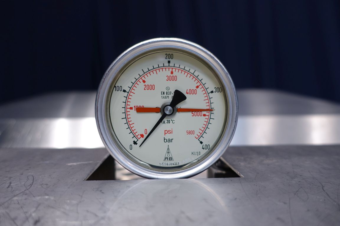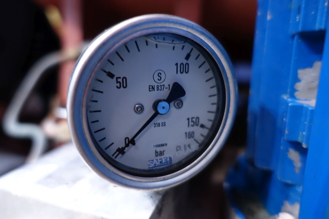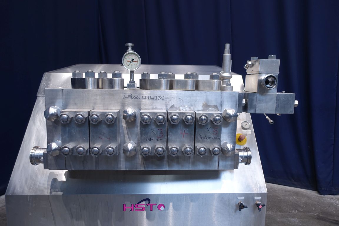 High pressure homogeniser, recondtioned by HST Maschinenbau Germany in 2013. 2 Stages with hydraulic pressure control. 5 Pistons. Piston diameter: 2 3/4''. Stainless steel cladded. Oil circulation pump, and hydraulic pump, Connections: 80 mm / 50 mm, DIN. Current motor power: 200 KW and maximum pressure in current confirguration with this motor 220 bar. Freestanding stainless steel Rittal control panel with frequentzy converter, Emerson M701 and cooling unit. Overpressure valve. Manometer on outlet. 2 Side inlet. Including a big set of new spare parts including drive work bearings (SKF) and half moon guides of cranckshaft. Total dimensions: 155 x 160 x 210 cm + 210 x 60 x 215 cm. Weigth: ± 7.280 kg.