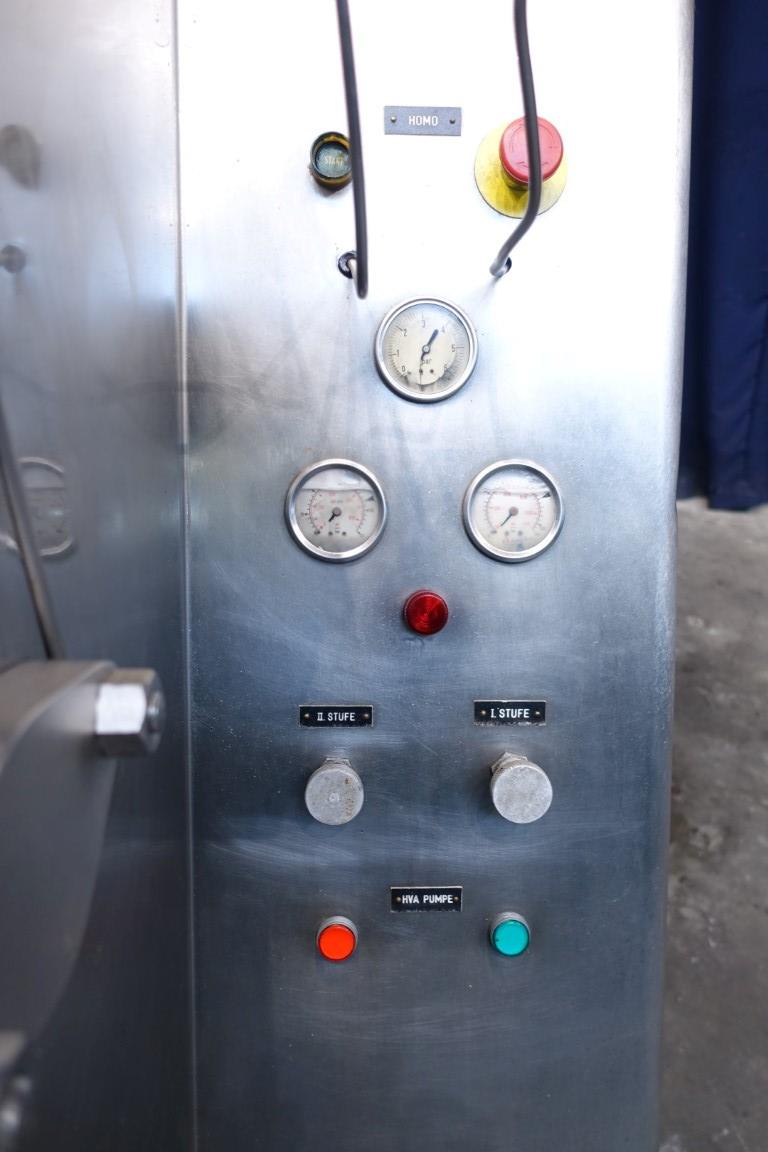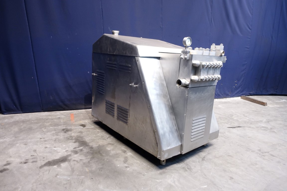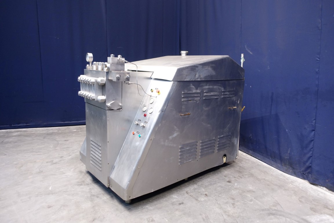 High pressure homogeniser. 2 stages with hydraulic pressure control. Poppet valves. 3 Pistons. Piston diameter: 2 1/8 '' and stroke 6 1/8 ''. Stainless steel cladded. Connections: inlet 2'' and outlet 1,5''. Current motor power: 75 kW - 980 rpm - 380 V - 50 Hz. Pressure in current configuration according typeshield 245 bar. Manometer on outlet. Excluding controls, tools, overpressure valve, bypass valve, pulsation dampers, electronic pressure transmitter. Machine can be converted with this 75 kW motor to: 10.000 ltr/h @ 245 bar or 4.000 ltr/h @ 345 bar.