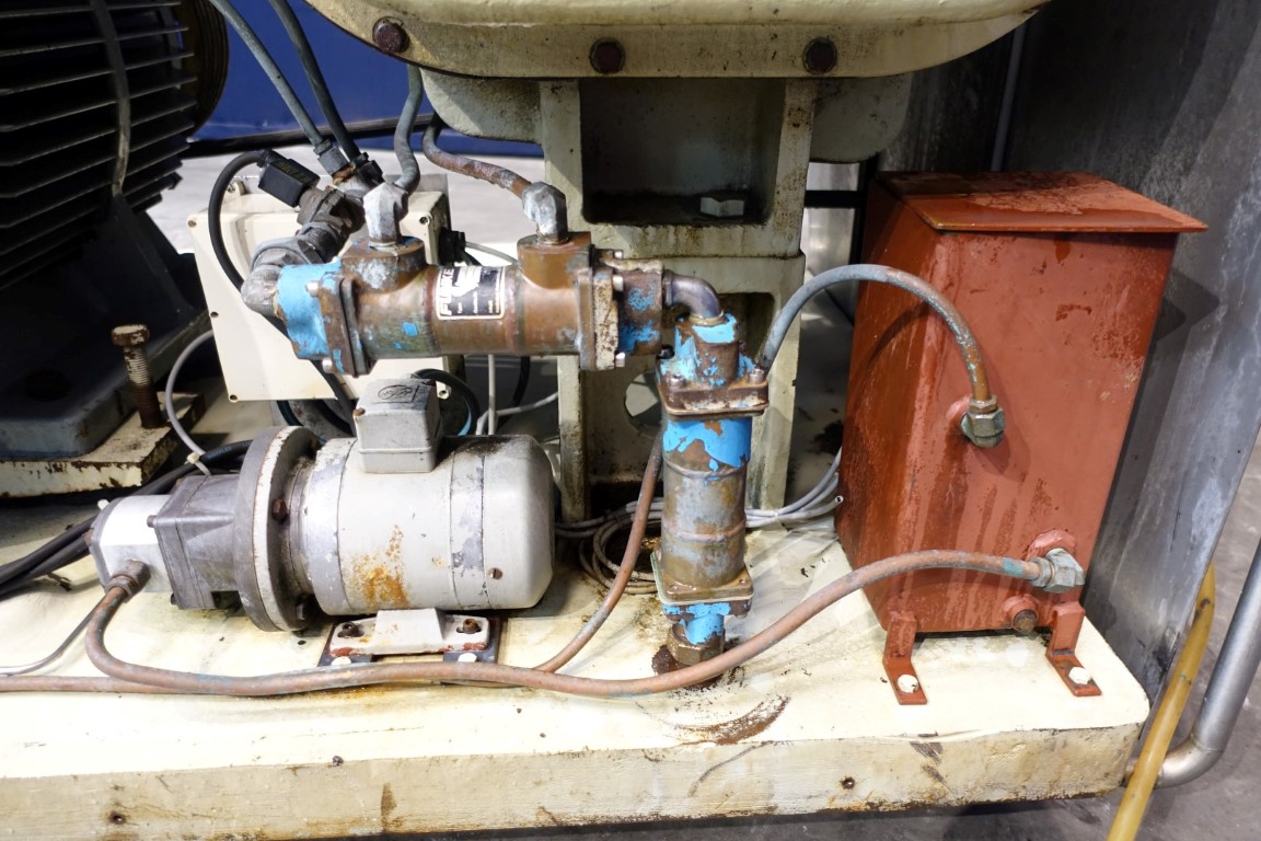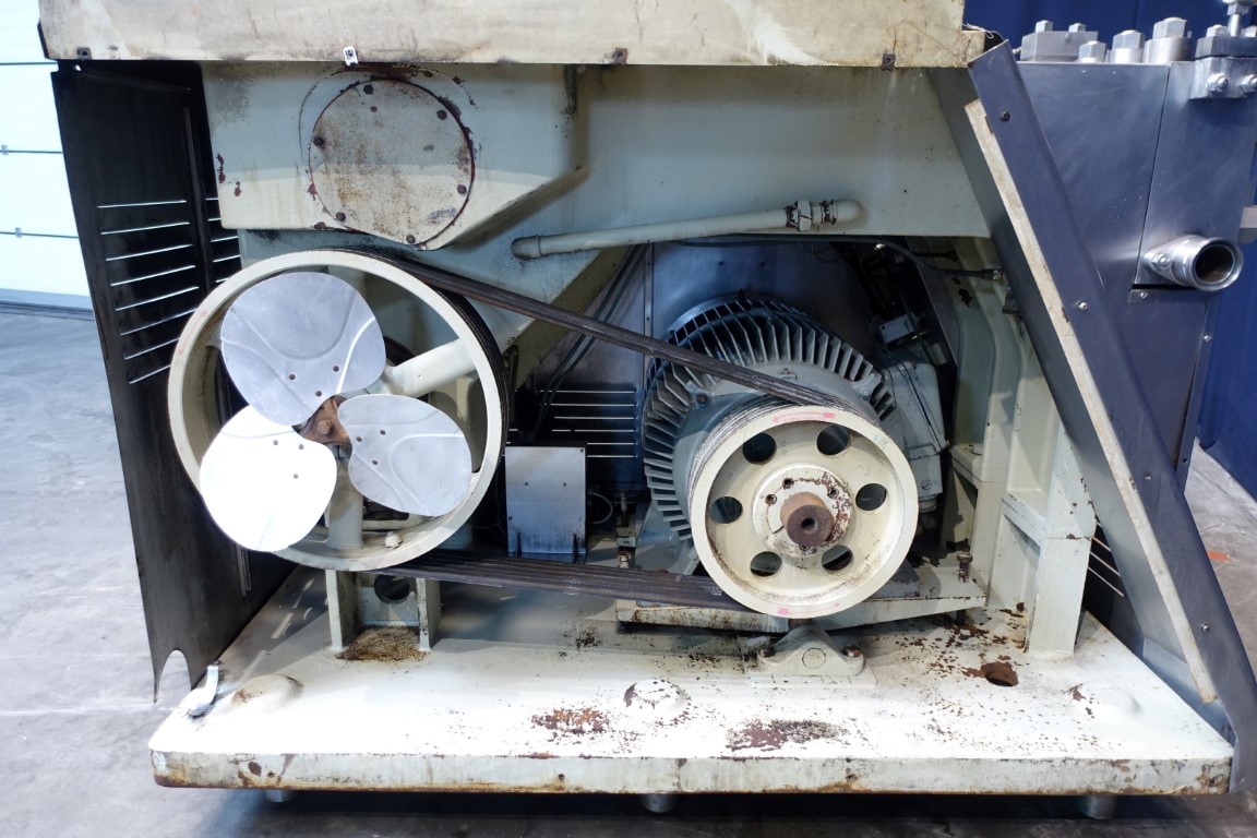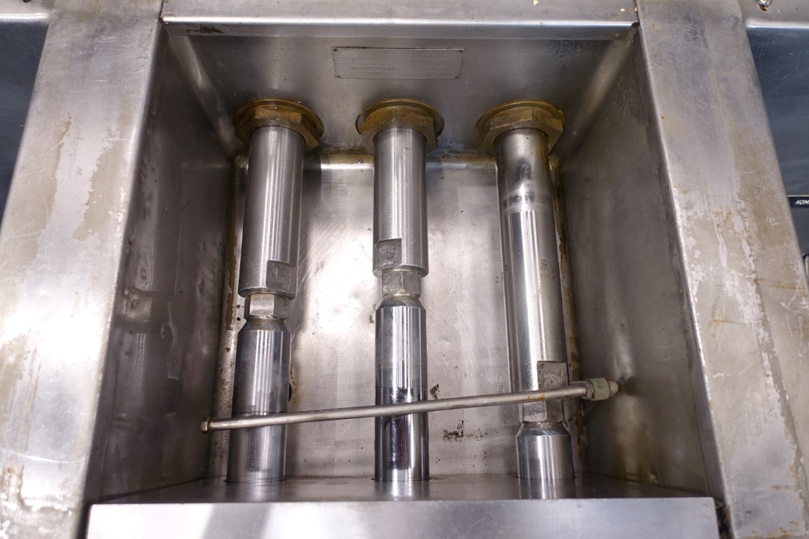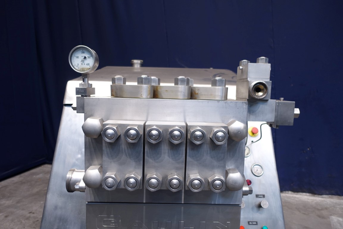 High pressure homogeniser. 2 stages with hydraulic pressure control. Poppet valves. 3 Pistons. Piston diameter: 2 1/8 '' and stroke 6 1/8 ''. Stainless steel cladded. Connections: inlet 2'' and outlet 1,5''. Current motor power: 75 kW - 980 rpm - 380 V - 50 Hz. Pressure in current configuration according typeshield 245 bar. Manometer on outlet. Excluding controls, tools, overpressure valve, bypass valve, pulsation dampers, electronic pressure transmitter. Machine can be converted with this 75 kW motor to: 10.000 ltr/h @ 245 bar or 4.000 ltr/h @ 345 bar.