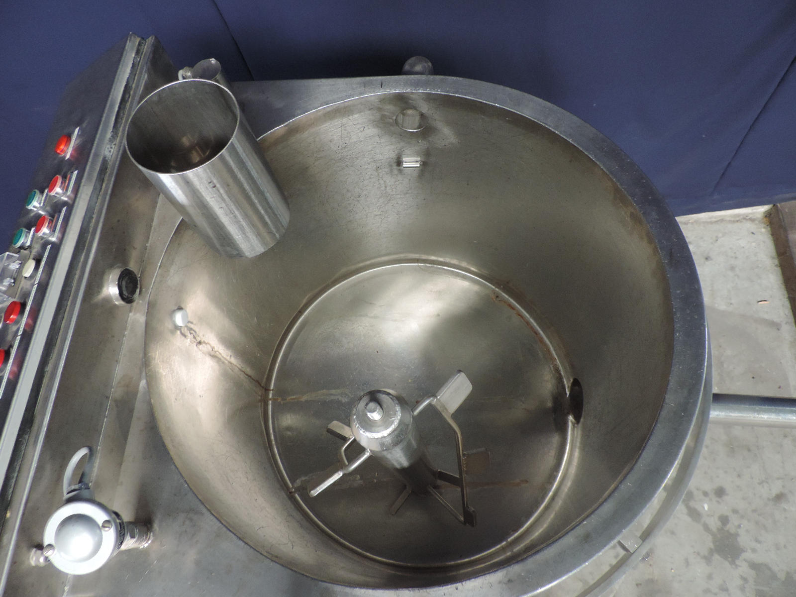 Chocolate tempering tank to keep the chocolate on the correct temperature. Mobile. Open. Vertical. Double jacketed. Pressure on jacket max 1 bar. Bottom driven swirl agitator, frequency converter (Danfoss) for speed adjustment. 2x heating elements of 3 kW. Inside diameter: 67 mm. Cylindrical height: 62 cm. Total dimensions: 110 x 90 x 170 cm.