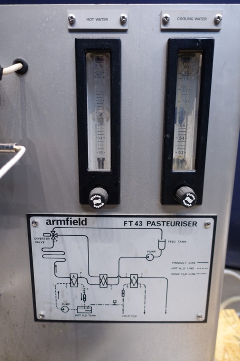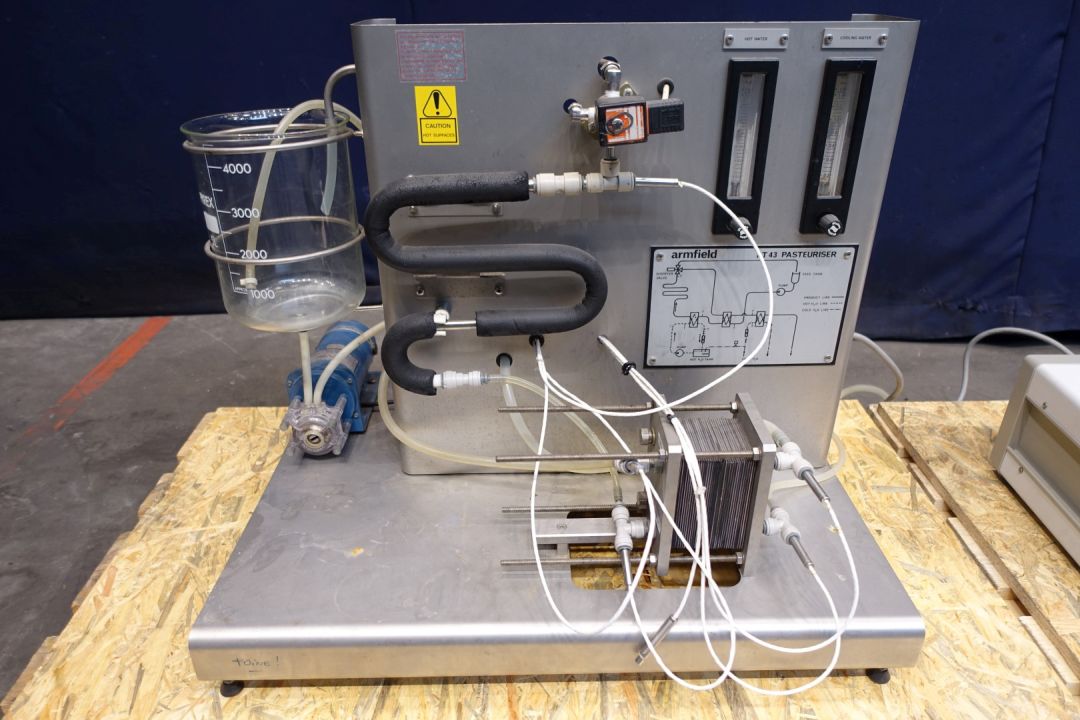 Armfield Laboratory Pasteuriser FT 43A. With controls. Set consists out of feed tank, pump, plate heat exchanger, hot water tank, pump, holding and diverter valve. Total dimensions: 76x55x65 (lxwxh) cm - weight 102 kg's. capacity estimated.