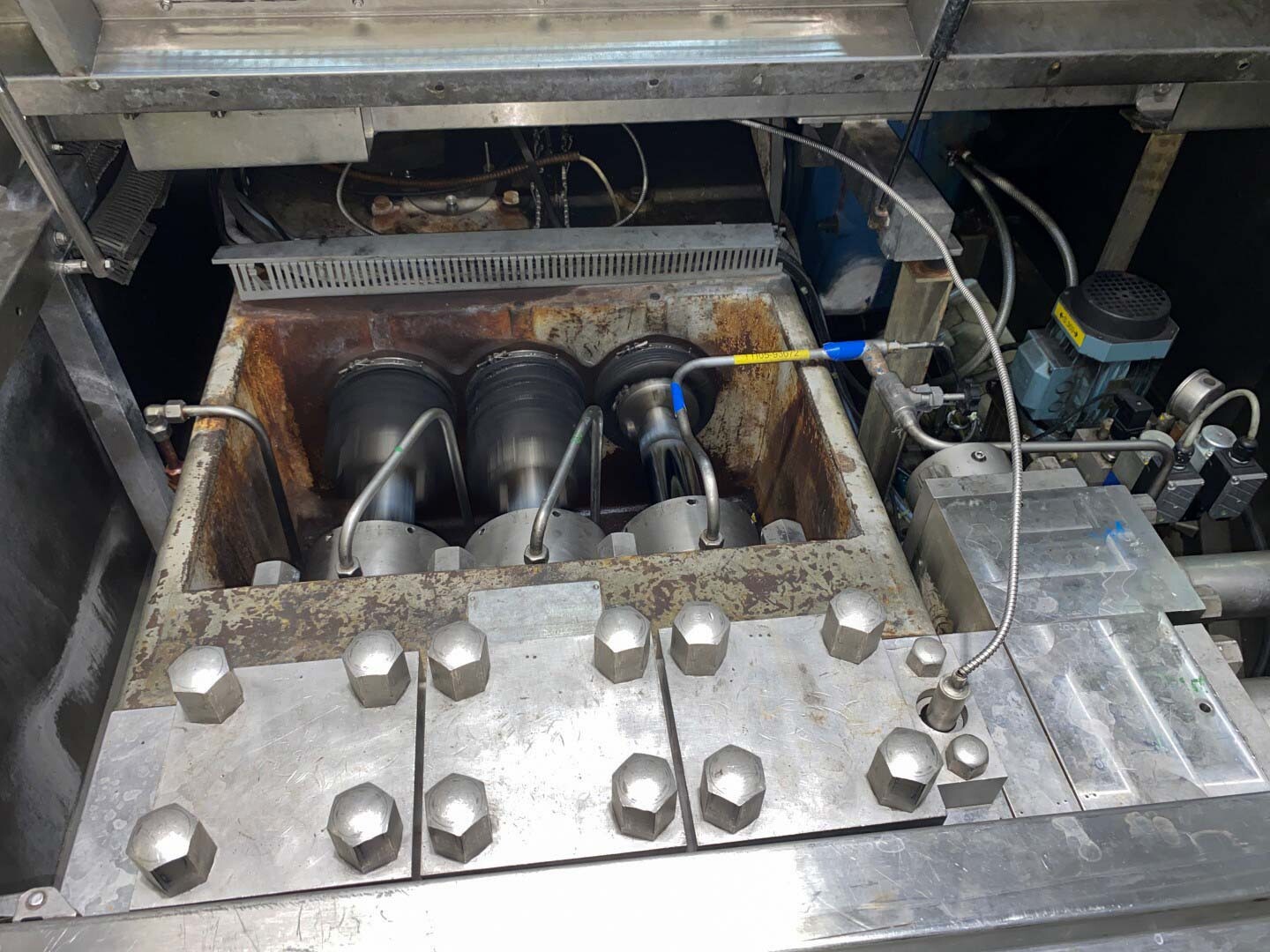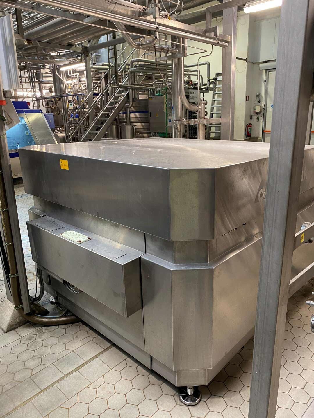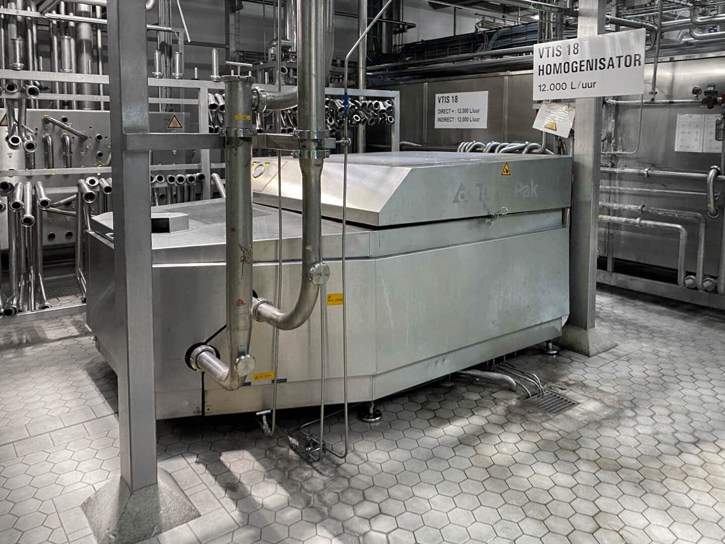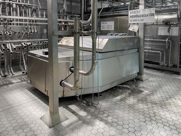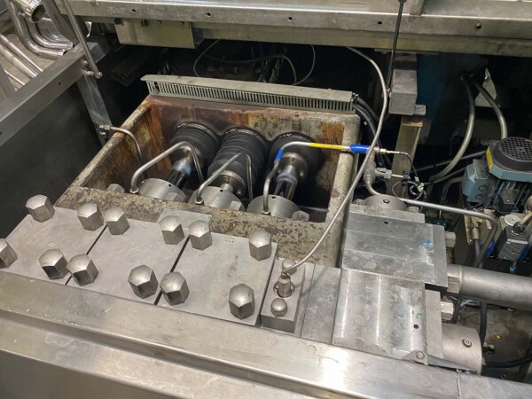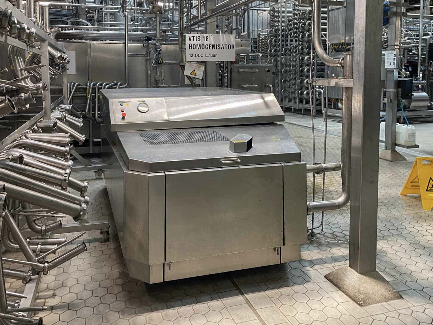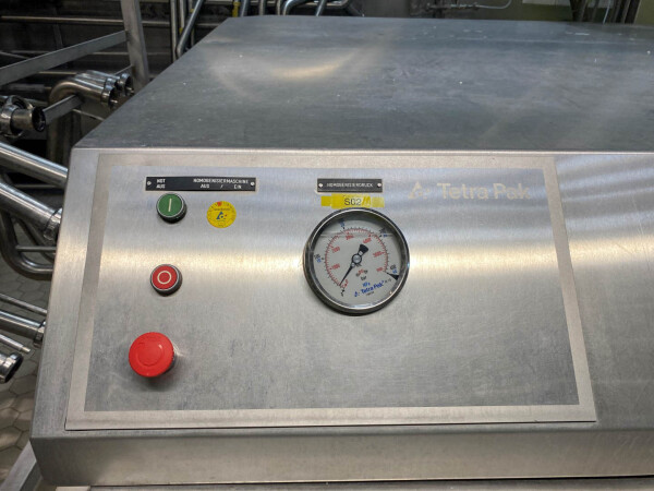 Aseptische Hogedrukhomogenisator. 2-traps met hydraulische drukregeling. 3 pistons, pistondiameter: 63 mm en slag: 135 mm. Roestvrijstaal bekleed en van binnenuit bekleed met geluiddempend materiaal. Aansluitingen: 2x 2,5" SMS. Huidig motorvermogen: 110 kW en maximale druk in huidige configuratie met deze motor 200 bar. Enkel geïntegreerde regelingen, geen schakelkast. Druktransmitter direct op manometer voor het aflezen van de homogenisatiedruk (analoge drukindicatie). Stromingsschakelaar op koelwater. 2x pulsatiedempers op in-/ en uitlaat. 2x zij-inlaat. Drukregeling op afstand.