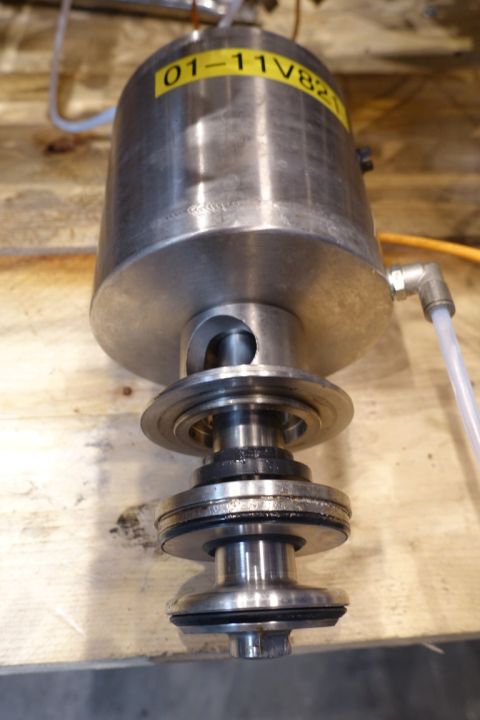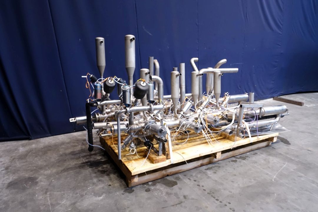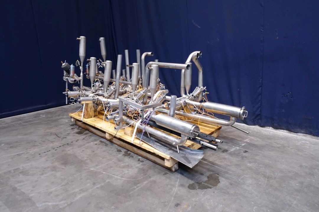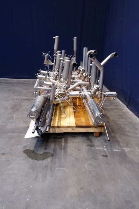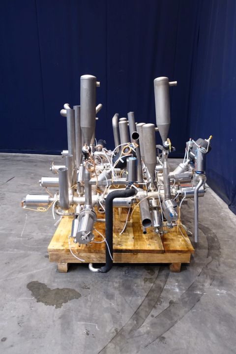 Set of aseptic valves, to split 1 outgoing line of UHT or sterile tank to 4 filling machines (valve cluster) valves model: AP100/50 V50-300 0951,50296 nr: 0407 09. 6 Cross points with steam bariere, tt sensors, to create a steam lock between valve and pipe, valves equiped with flush chamber (possible to circulate peroxide) 16x DN80. 11x AMS DN65, 3x small valves and 2x Filters. Total dimensions 315 x 170 x 160 cm.